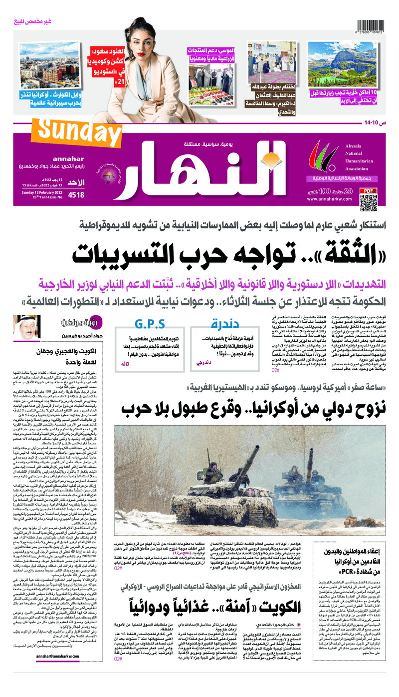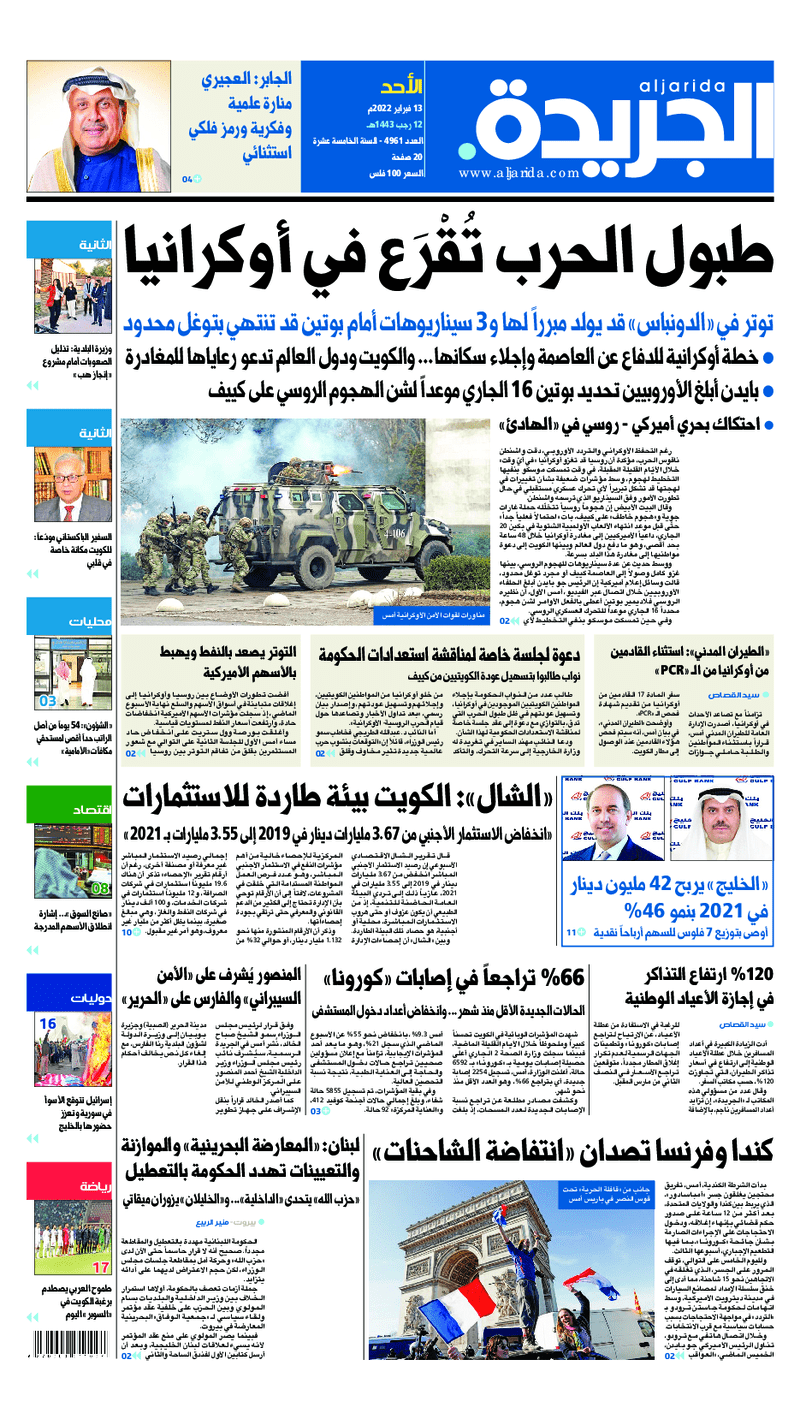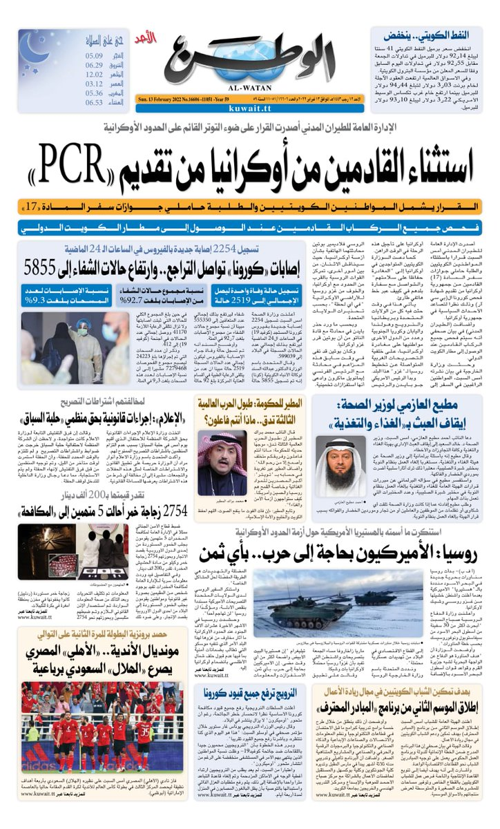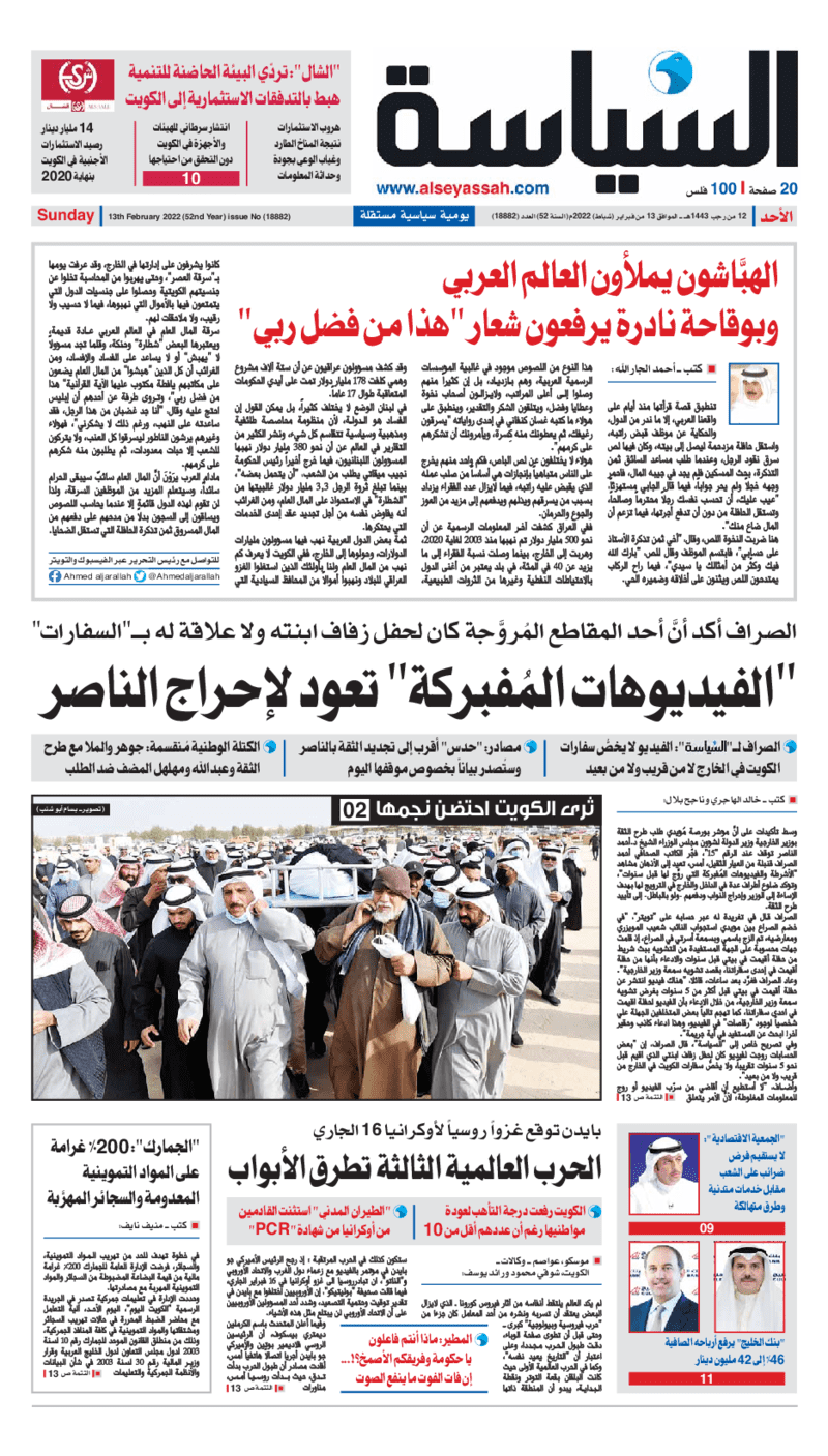 آخر الأخبار جرائم وقضايا “الجمارك” تضبط 29 ألف علبة مشروبات كحولية قادمة من دولة آسيوية في ميناء الشويخ 9 يونيو، 2024 محليات ممثلة عن دولة الكويت الطبيبة الكويتية أسماء الكندري تشارك في المؤتمر العالمي للمناظير في إيطاليا 8 يونيو، 2024 محليات “الصحة”: اكتمال وصول فريق الخدمات الطبية ببعثة الحج الكويتية لمكة المكرمة 8 يونيو، 2024 محليات “الصحة” تحدد 8 مراكز للصحة المدرسية لاستقبال الطلبة المبتعثين 8 يونيو، 2024 عربي وعالمي “الصحة العالمية”: تسجيل أول وفاة لشخص مصاب بـ«أنفلونزا الطيور» 7 يونيو، 2024 محليات عناوين الصحف الكويتية ليوم الأحد 13 فبراير 2022 محرر المحليات13 فبراير، 2022أضف تعليق1 دقائق جريدة الجريدة جريدة الأنباء جريدة القبس جريدة السياسة جريدة الوطن جريدة النهار جريدة الصباح جريدة عرب تايمز الوسومTop عناوين الصحف المحلية من الممكن أن يعجبك جرائم وقضايا “الجمارك” تضبط 29 ألف علبة مشروبات كحولية قادمة من دولة آسيوية في ميناء الشويخ محليات ممثلة عن دولة الكويت الطبيبة الكويتية أسماء الكندري تشارك في المؤتمر العالمي للمناظير في إيطاليا محليات “الصحة”: اكتمال وصول فريق الخدمات الطبية ببعثة الحج الكويتية لمكة المكرمة محليات “الصحة” تحدد 8 مراكز للصحة المدرسية لاستقبال الطلبة المبتعثين عربي وعالمي “الصحة العالمية”: تسجيل أول وفاة لشخص مصاب بـ«أنفلونزا الطيور» تكنولوجيا رش السحب بملح البحر.. تجربة “ثورية” لتبريد كوكب الأرض أضف تعليق أضغط هنا لإضافة تعليق إلغاء الردالتعليقالاسم البريد الإلكتروني الموقع الإلكتروني Δ هذا الموقع يستخدم خدمة أكيسميت للتقليل من البريد المزعجة. اعرف المزيد عن كيفية التعامل مع بيانات التعليقات الخاصة بك processed.
