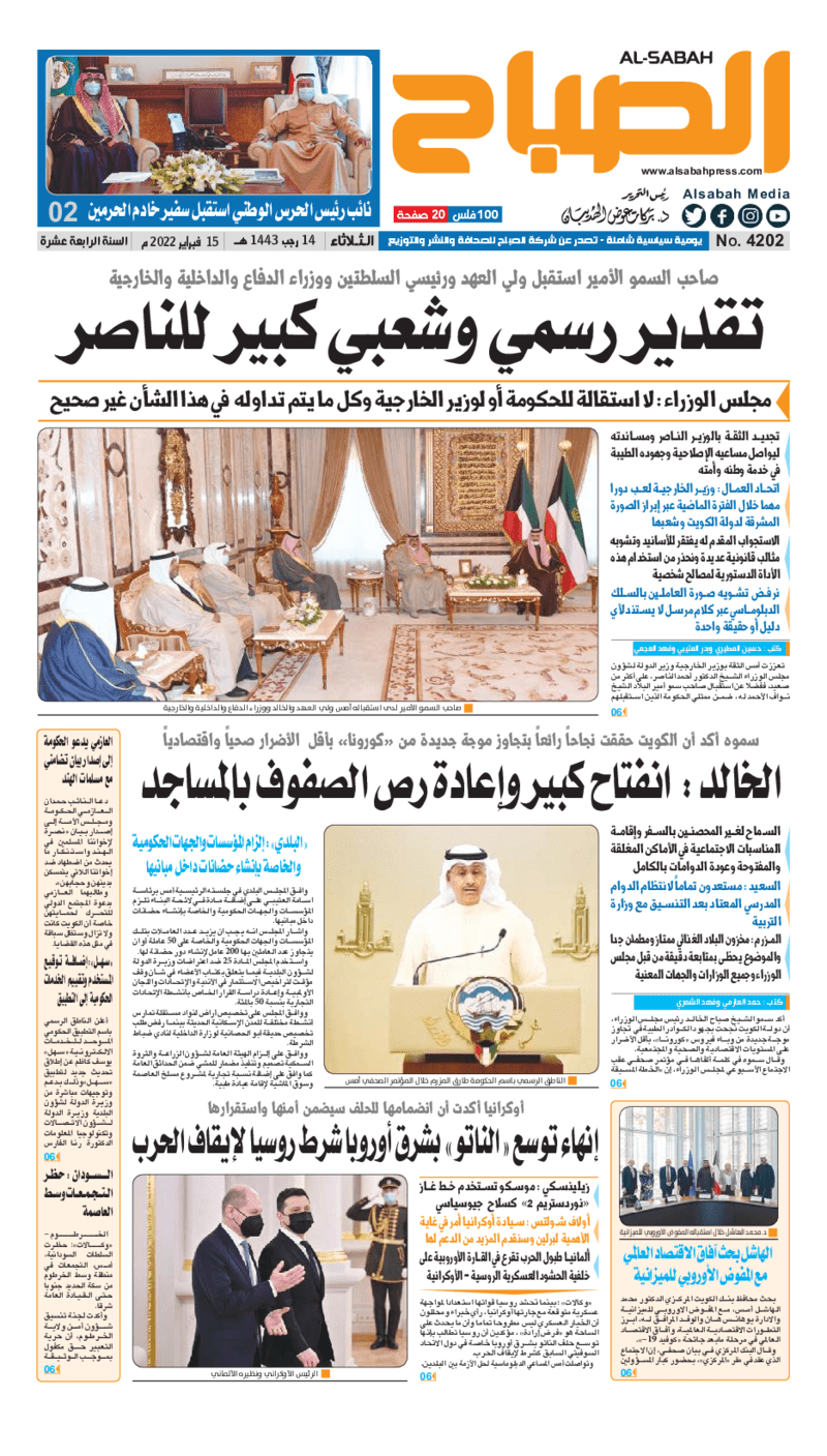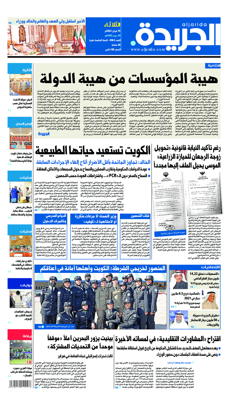 آخر الأخبار جرائم وقضايا “الجمارك” تضبط 29 ألف علبة مشروبات كحولية قادمة من دولة آسيوية في ميناء الشويخ 9 يونيو، 2024 محليات ممثلة عن دولة الكويت الطبيبة الكويتية أسماء الكندري تشارك في المؤتمر العالمي للمناظير في إيطاليا 8 يونيو، 2024 محليات “الصحة”: اكتمال وصول فريق الخدمات الطبية ببعثة الحج الكويتية لمكة المكرمة 8 يونيو، 2024 محليات “الصحة” تحدد 8 مراكز للصحة المدرسية لاستقبال الطلبة المبتعثين 8 يونيو، 2024 عربي وعالمي “الصحة العالمية”: تسجيل أول وفاة لشخص مصاب بـ«أنفلونزا الطيور» 7 يونيو، 2024 محليات عناوين الصحف الكويتية ليوم الثلاثاء 15 فبراير 2022 محرر المحليات15 فبراير، 2022أضف تعليق1 دقائق جريدة الجريدة جريدة الأنباء جريدة القبس جريدة السياسة جريدة الوطن جريدة النهار جريدة الصباح جريدة عرب تايمز الوسومTop عناوين الصحف المحلية من الممكن أن يعجبك جرائم وقضايا “الجمارك” تضبط 29 ألف علبة مشروبات كحولية قادمة من دولة آسيوية في ميناء الشويخ محليات ممثلة عن دولة الكويت الطبيبة الكويتية أسماء الكندري تشارك في المؤتمر العالمي للمناظير في إيطاليا محليات “الصحة”: اكتمال وصول فريق الخدمات الطبية ببعثة الحج الكويتية لمكة المكرمة محليات “الصحة” تحدد 8 مراكز للصحة المدرسية لاستقبال الطلبة المبتعثين عربي وعالمي “الصحة العالمية”: تسجيل أول وفاة لشخص مصاب بـ«أنفلونزا الطيور» تكنولوجيا رش السحب بملح البحر.. تجربة “ثورية” لتبريد كوكب الأرض أضف تعليق أضغط هنا لإضافة تعليق إلغاء الردالتعليقالاسم البريد الإلكتروني الموقع الإلكتروني Δ هذا الموقع يستخدم خدمة أكيسميت للتقليل من البريد المزعجة. اعرف المزيد عن كيفية التعامل مع بيانات التعليقات الخاصة بك processed.