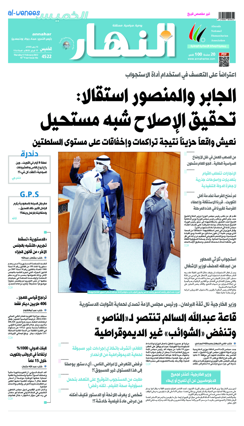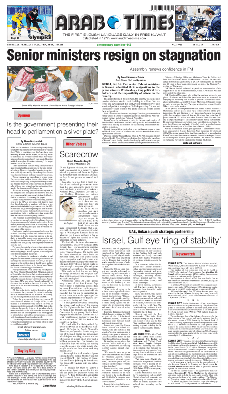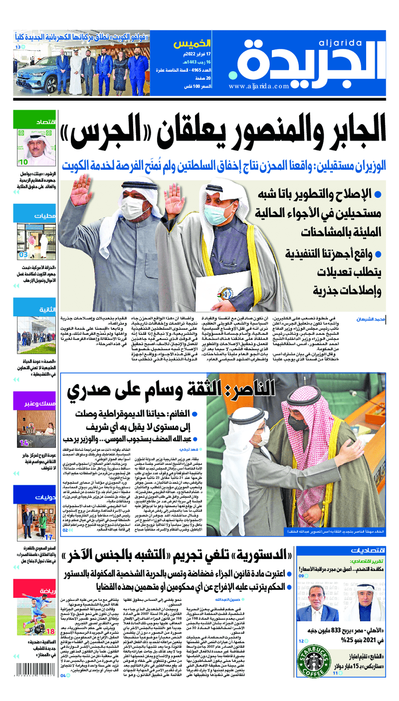 آخر الأخبار جرائم وقضايا “الجمارك” تضبط 29 ألف علبة مشروبات كحولية قادمة من دولة آسيوية في ميناء الشويخ 9 يونيو، 2024 محليات ممثلة عن دولة الكويت الطبيبة الكويتية أسماء الكندري تشارك في المؤتمر العالمي للمناظير في إيطاليا 8 يونيو، 2024 محليات “الصحة”: اكتمال وصول فريق الخدمات الطبية ببعثة الحج الكويتية لمكة المكرمة 8 يونيو، 2024 محليات “الصحة” تحدد 8 مراكز للصحة المدرسية لاستقبال الطلبة المبتعثين 8 يونيو، 2024 عربي وعالمي “الصحة العالمية”: تسجيل أول وفاة لشخص مصاب بـ«أنفلونزا الطيور» 7 يونيو، 2024 محليات عناوين الصحف الكويتية ليوم الخميس 17 فبراير 2022 محرر المحليات17 فبراير، 2022أضف تعليق1 دقائق جريدة الجريدة جريدة الأنباء جريدة القبس جريدة السياسة جريدة الوطن جريدة النهار جريدة الصباح جريدة عرب تايمز الوسومTop عناوين الصحف المحلية من الممكن أن يعجبك جرائم وقضايا “الجمارك” تضبط 29 ألف علبة مشروبات كحولية قادمة من دولة آسيوية في ميناء الشويخ محليات ممثلة عن دولة الكويت الطبيبة الكويتية أسماء الكندري تشارك في المؤتمر العالمي للمناظير في إيطاليا محليات “الصحة”: اكتمال وصول فريق الخدمات الطبية ببعثة الحج الكويتية لمكة المكرمة محليات “الصحة” تحدد 8 مراكز للصحة المدرسية لاستقبال الطلبة المبتعثين عربي وعالمي “الصحة العالمية”: تسجيل أول وفاة لشخص مصاب بـ«أنفلونزا الطيور» تكنولوجيا رش السحب بملح البحر.. تجربة “ثورية” لتبريد كوكب الأرض أضف تعليق أضغط هنا لإضافة تعليق إلغاء الردالتعليقالاسم البريد الإلكتروني الموقع الإلكتروني Δ هذا الموقع يستخدم خدمة أكيسميت للتقليل من البريد المزعجة. اعرف المزيد عن كيفية التعامل مع بيانات التعليقات الخاصة بك processed.
