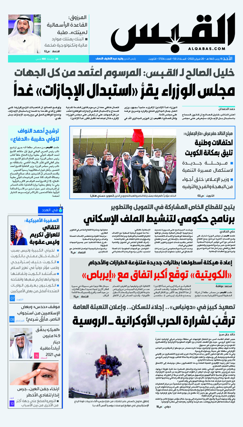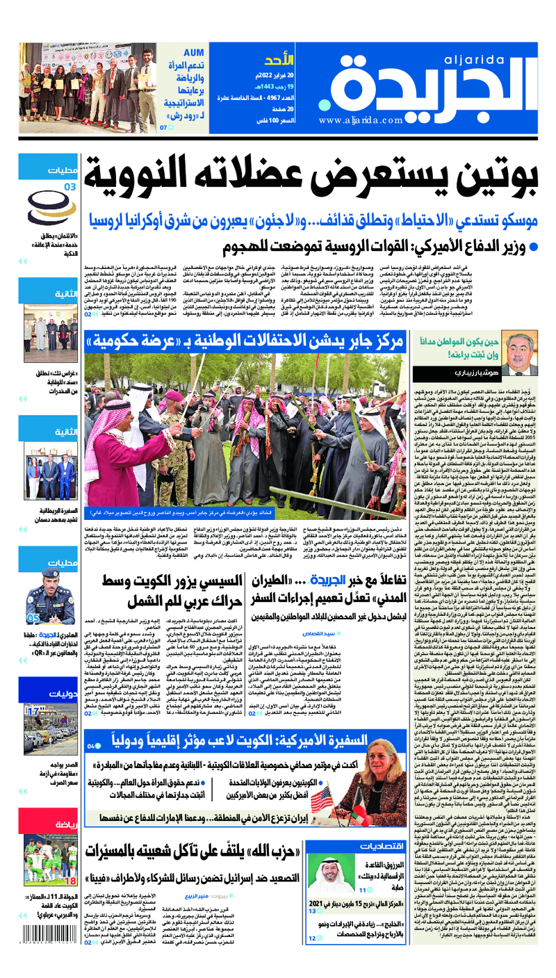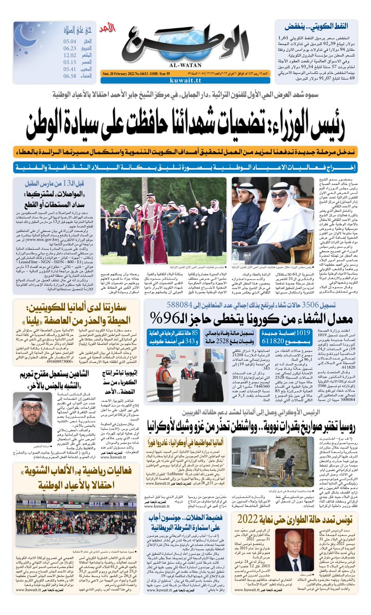 آخر الأخبار جرائم وقضايا “الجمارك” تضبط 29 ألف علبة مشروبات كحولية قادمة من دولة آسيوية في ميناء الشويخ 9 يونيو، 2024 محليات ممثلة عن دولة الكويت الطبيبة الكويتية أسماء الكندري تشارك في المؤتمر العالمي للمناظير في إيطاليا 8 يونيو، 2024 محليات “الصحة”: اكتمال وصول فريق الخدمات الطبية ببعثة الحج الكويتية لمكة المكرمة 8 يونيو، 2024 محليات “الصحة” تحدد 8 مراكز للصحة المدرسية لاستقبال الطلبة المبتعثين 8 يونيو، 2024 عربي وعالمي “الصحة العالمية”: تسجيل أول وفاة لشخص مصاب بـ«أنفلونزا الطيور» 7 يونيو، 2024 محليات عناوين الصحف الكويتية ليوم الأحد 20 فبراير 2022 محرر المحليات20 فبراير، 2022أضف تعليق1 دقائق جريدة الجريدة جريدة الأنباء جريدة القبس جريدة السياسة جريدة الوطن جريدة النهار جريدة الصباح جريدة عرب تايمز الوسومTop عناوين الصحف المحلية من الممكن أن يعجبك جرائم وقضايا “الجمارك” تضبط 29 ألف علبة مشروبات كحولية قادمة من دولة آسيوية في ميناء الشويخ محليات ممثلة عن دولة الكويت الطبيبة الكويتية أسماء الكندري تشارك في المؤتمر العالمي للمناظير في إيطاليا محليات “الصحة”: اكتمال وصول فريق الخدمات الطبية ببعثة الحج الكويتية لمكة المكرمة محليات “الصحة” تحدد 8 مراكز للصحة المدرسية لاستقبال الطلبة المبتعثين عربي وعالمي “الصحة العالمية”: تسجيل أول وفاة لشخص مصاب بـ«أنفلونزا الطيور» تكنولوجيا رش السحب بملح البحر.. تجربة “ثورية” لتبريد كوكب الأرض أضف تعليق أضغط هنا لإضافة تعليق إلغاء الردالتعليقالاسم البريد الإلكتروني الموقع الإلكتروني Δ هذا الموقع يستخدم خدمة أكيسميت للتقليل من البريد المزعجة. اعرف المزيد عن كيفية التعامل مع بيانات التعليقات الخاصة بك processed.