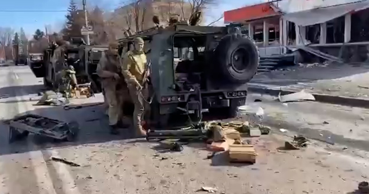 وأظهرت مقاطع مصورة بثها أنطون هيراشينكو مستشار وزير الداخلية الأوكراني -على تطبيق “تليغرام” (Telegram) وموقع دائرة الاتصالات الخاصة وحماية المعلومات التابعة للدولة في أوكرانيا- عدة مركبات عسكرية خفيفة تتحرك على طول أحد الشوارع، ودبابة محترقة بشكل منفصل.