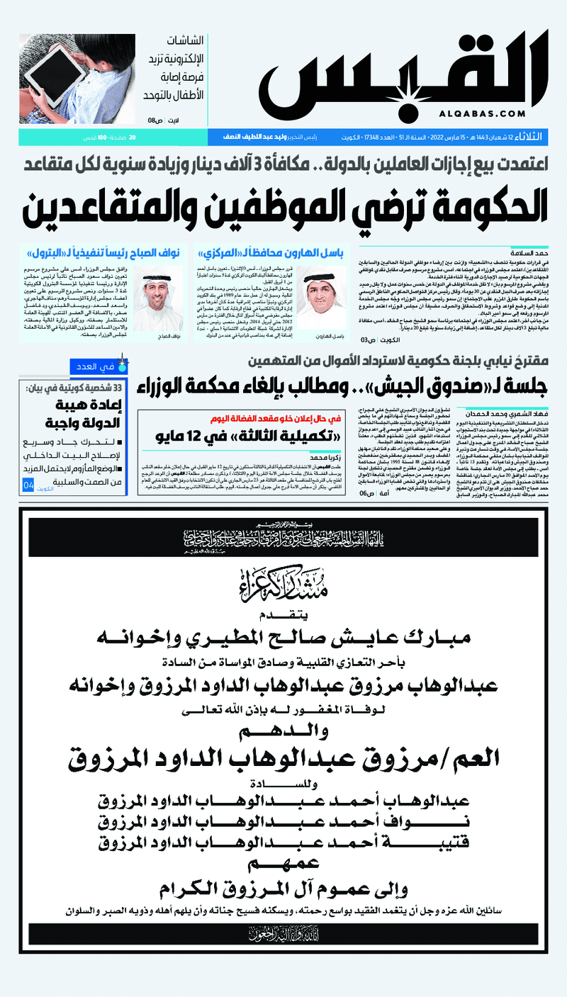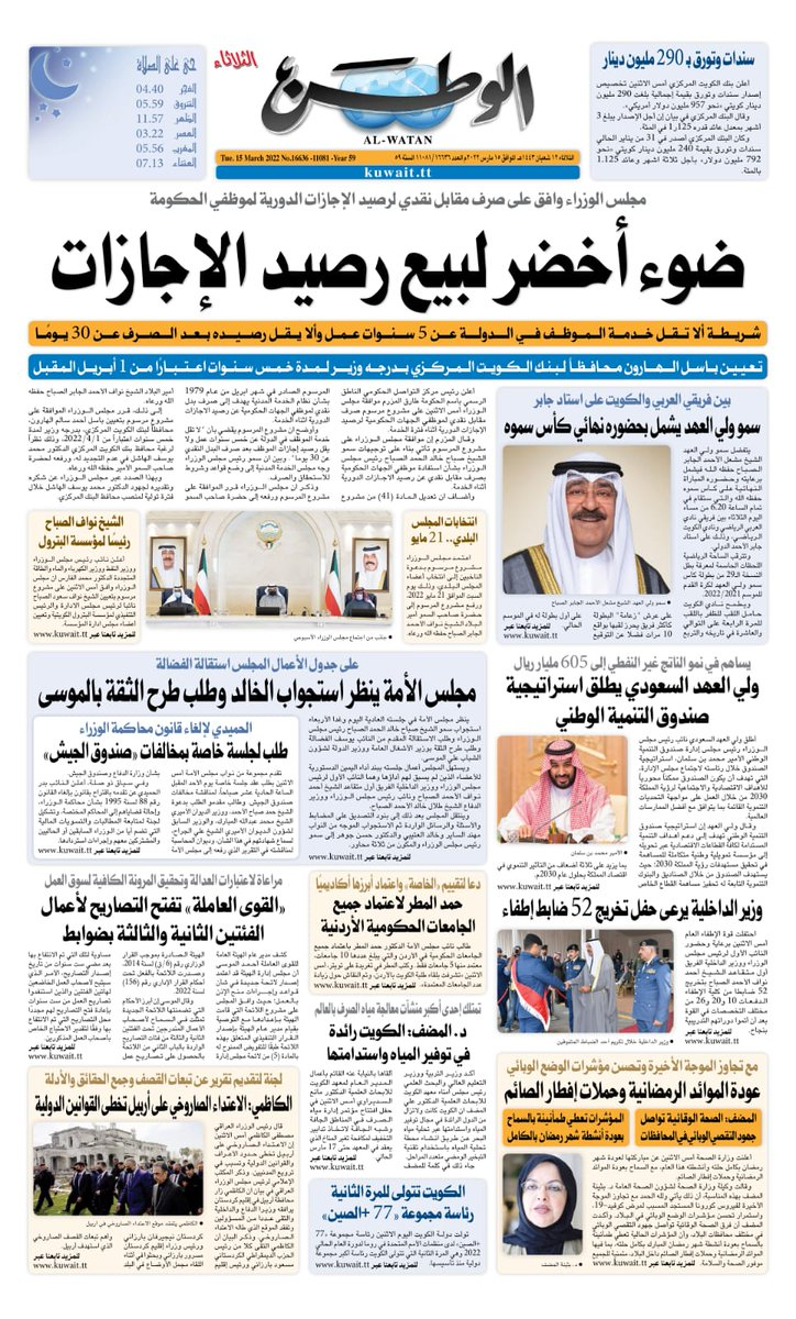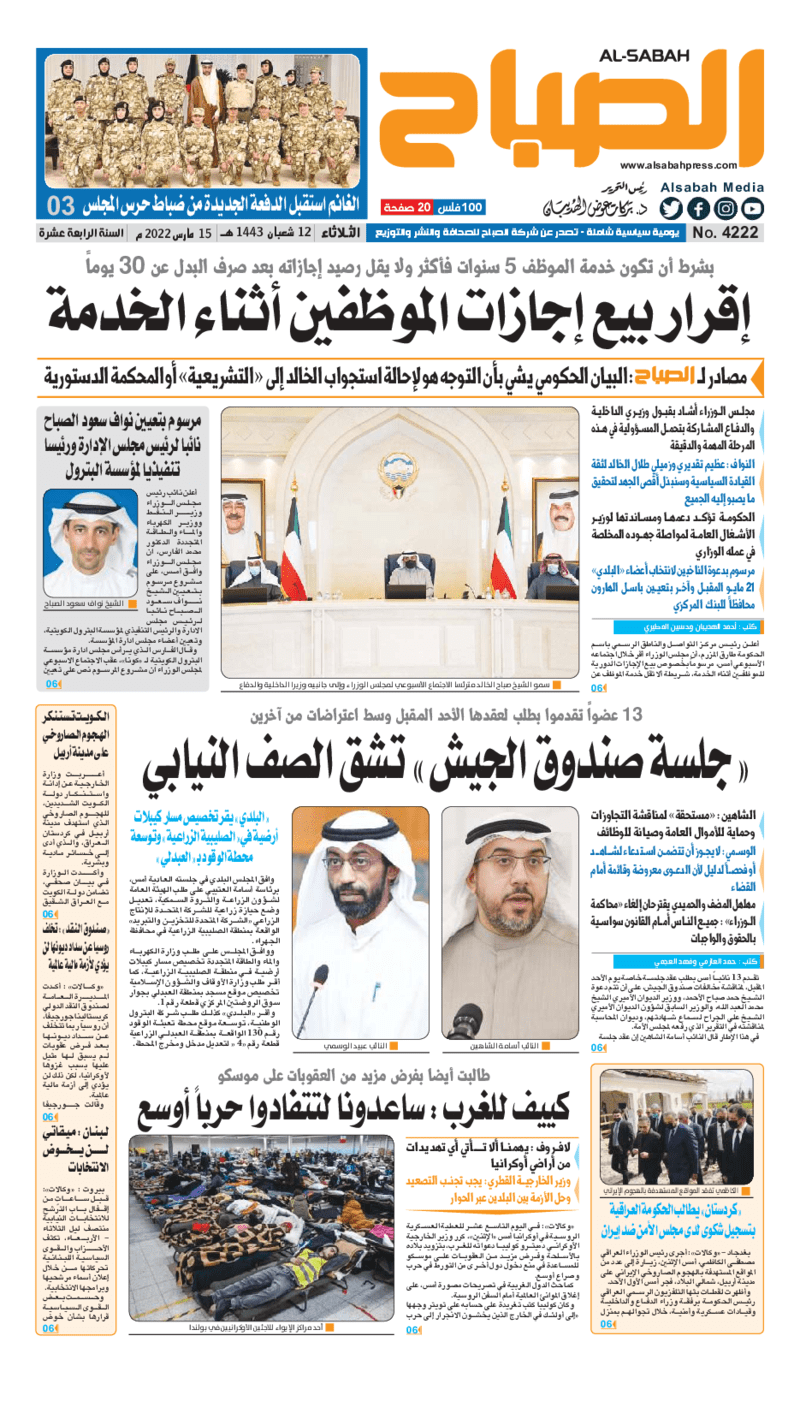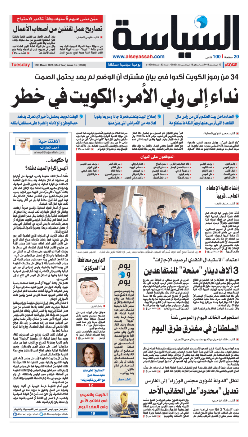 آخر الأخبار جرائم وقضايا “الجمارك” تضبط 29 ألف علبة مشروبات كحولية قادمة من دولة آسيوية في ميناء الشويخ 9 يونيو، 2024 محليات ممثلة عن دولة الكويت الطبيبة الكويتية أسماء الكندري تشارك في المؤتمر العالمي للمناظير في إيطاليا 8 يونيو، 2024 محليات “الصحة”: اكتمال وصول فريق الخدمات الطبية ببعثة الحج الكويتية لمكة المكرمة 8 يونيو، 2024 محليات “الصحة” تحدد 8 مراكز للصحة المدرسية لاستقبال الطلبة المبتعثين 8 يونيو، 2024 عربي وعالمي “الصحة العالمية”: تسجيل أول وفاة لشخص مصاب بـ«أنفلونزا الطيور» 7 يونيو، 2024 محليات عناوين الصحف الكويتية ليوم الثلاثاء 15 مارس 2022 محرر المحليات15 مارس، 2022أضف تعليق1 دقائق جريدة الجريدة جريدة الأنباء جريدة القبس جريدة السياسة جريدة الوطن جريدة الصباح جريدة عرب تايمز الوسومTop عناوين الصحف المحلية من الممكن أن يعجبك جرائم وقضايا “الجمارك” تضبط 29 ألف علبة مشروبات كحولية قادمة من دولة آسيوية في ميناء الشويخ محليات ممثلة عن دولة الكويت الطبيبة الكويتية أسماء الكندري تشارك في المؤتمر العالمي للمناظير في إيطاليا محليات “الصحة”: اكتمال وصول فريق الخدمات الطبية ببعثة الحج الكويتية لمكة المكرمة محليات “الصحة” تحدد 8 مراكز للصحة المدرسية لاستقبال الطلبة المبتعثين عربي وعالمي “الصحة العالمية”: تسجيل أول وفاة لشخص مصاب بـ«أنفلونزا الطيور» تكنولوجيا رش السحب بملح البحر.. تجربة “ثورية” لتبريد كوكب الأرض أضف تعليق أضغط هنا لإضافة تعليق إلغاء الردالتعليقالاسم البريد الإلكتروني الموقع الإلكتروني Δ هذا الموقع يستخدم خدمة أكيسميت للتقليل من البريد المزعجة. اعرف المزيد عن كيفية التعامل مع بيانات التعليقات الخاصة بك processed.