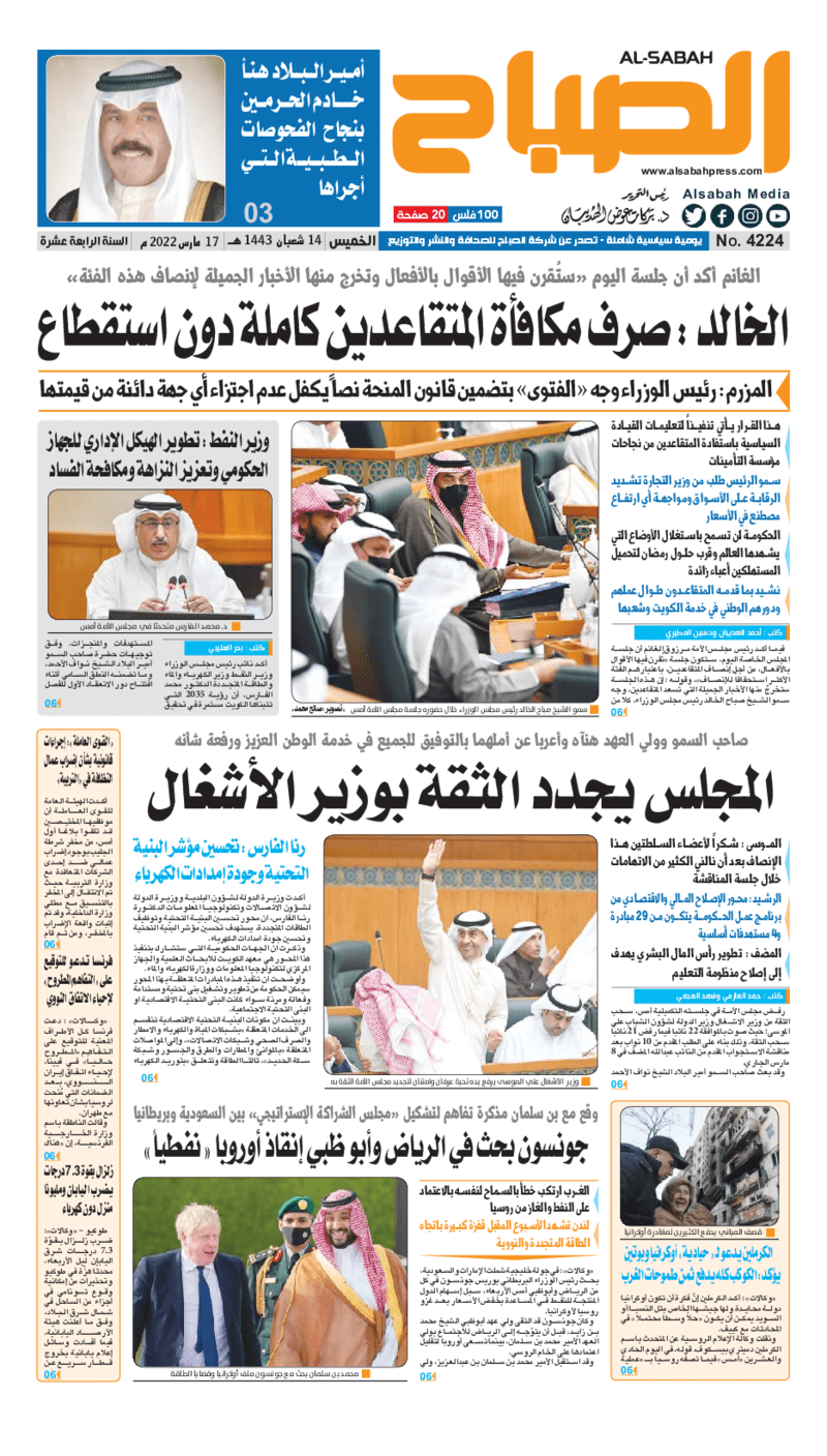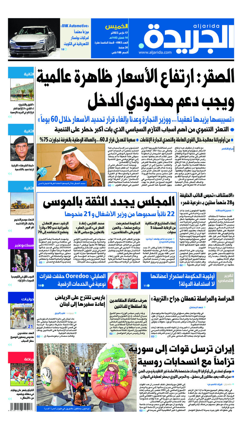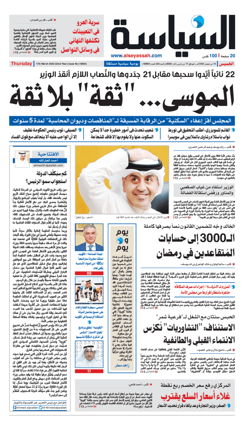 آخر الأخبار جرائم وقضايا “الجمارك” تضبط 29 ألف علبة مشروبات كحولية قادمة من دولة آسيوية في ميناء الشويخ 9 يونيو، 2024 محليات ممثلة عن دولة الكويت الطبيبة الكويتية أسماء الكندري تشارك في المؤتمر العالمي للمناظير في إيطاليا 8 يونيو، 2024 محليات “الصحة”: اكتمال وصول فريق الخدمات الطبية ببعثة الحج الكويتية لمكة المكرمة 8 يونيو، 2024 محليات “الصحة” تحدد 8 مراكز للصحة المدرسية لاستقبال الطلبة المبتعثين 8 يونيو، 2024 عربي وعالمي “الصحة العالمية”: تسجيل أول وفاة لشخص مصاب بـ«أنفلونزا الطيور» 7 يونيو، 2024 محليات عناوين الصحف الكويتية ليوم الخميس 17 مارس 2022 محرر المحليات17 مارس، 2022أضف تعليق1 دقائق جريدة الجريدة جريدة الأنباء جريدة القبس جريدة السياسة جريدة الوطن جريدة الصباح جريدة عرب تايمز الوسومTop عناوين الصحف المحلية من الممكن أن يعجبك جرائم وقضايا “الجمارك” تضبط 29 ألف علبة مشروبات كحولية قادمة من دولة آسيوية في ميناء الشويخ محليات ممثلة عن دولة الكويت الطبيبة الكويتية أسماء الكندري تشارك في المؤتمر العالمي للمناظير في إيطاليا محليات “الصحة”: اكتمال وصول فريق الخدمات الطبية ببعثة الحج الكويتية لمكة المكرمة محليات “الصحة” تحدد 8 مراكز للصحة المدرسية لاستقبال الطلبة المبتعثين عربي وعالمي “الصحة العالمية”: تسجيل أول وفاة لشخص مصاب بـ«أنفلونزا الطيور» تكنولوجيا رش السحب بملح البحر.. تجربة “ثورية” لتبريد كوكب الأرض أضف تعليق أضغط هنا لإضافة تعليق إلغاء الردالتعليقالاسم البريد الإلكتروني الموقع الإلكتروني Δ هذا الموقع يستخدم خدمة أكيسميت للتقليل من البريد المزعجة. اعرف المزيد عن كيفية التعامل مع بيانات التعليقات الخاصة بك processed.