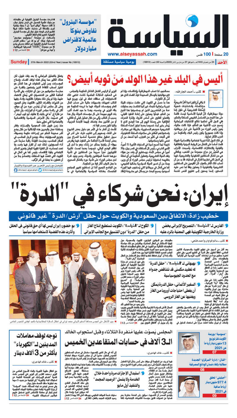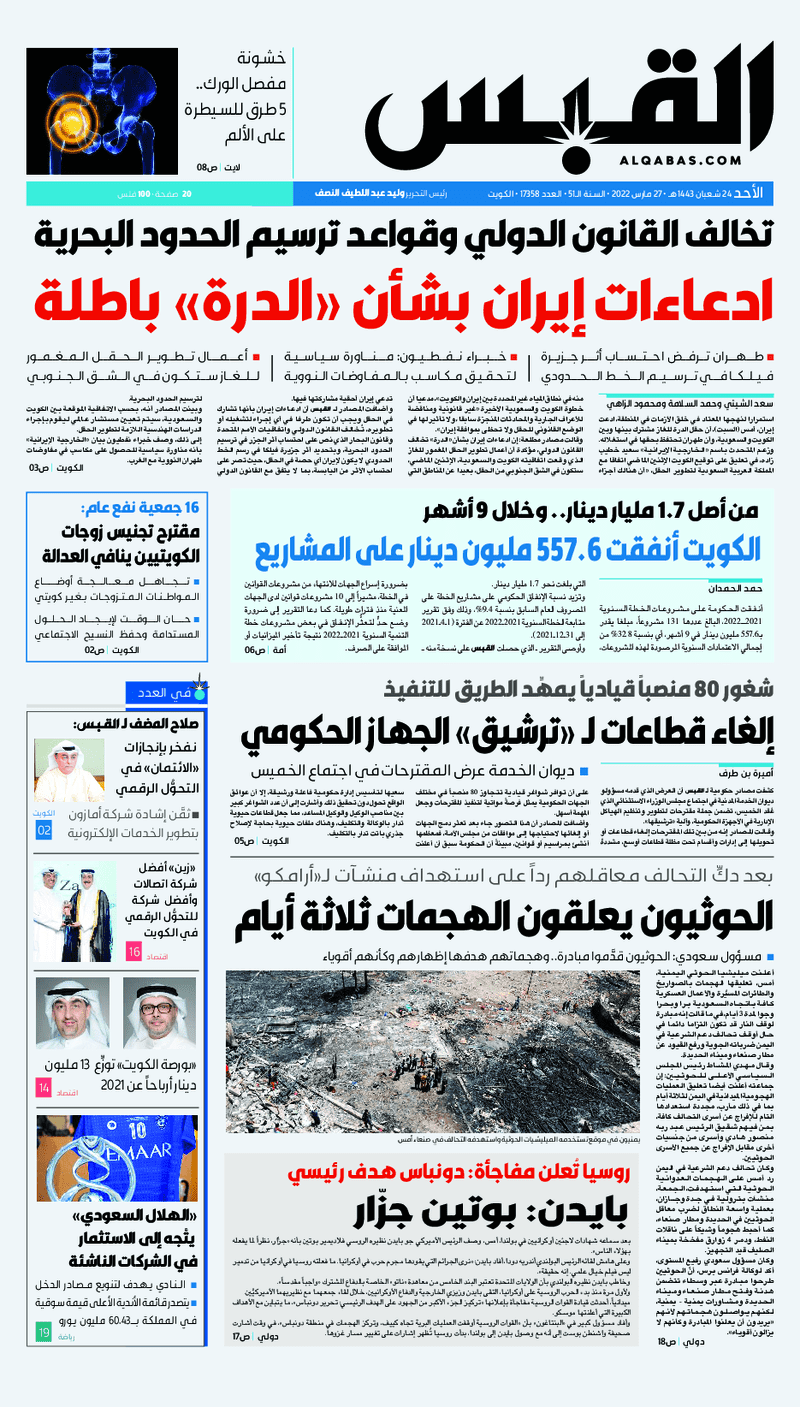 آخر الأخبار جرائم وقضايا “الجمارك” تضبط 29 ألف علبة مشروبات كحولية قادمة من دولة آسيوية في ميناء الشويخ 9 يونيو، 2024 محليات ممثلة عن دولة الكويت الطبيبة الكويتية أسماء الكندري تشارك في المؤتمر العالمي للمناظير في إيطاليا 8 يونيو، 2024 محليات “الصحة”: اكتمال وصول فريق الخدمات الطبية ببعثة الحج الكويتية لمكة المكرمة 8 يونيو، 2024 محليات “الصحة” تحدد 8 مراكز للصحة المدرسية لاستقبال الطلبة المبتعثين 8 يونيو، 2024 عربي وعالمي “الصحة العالمية”: تسجيل أول وفاة لشخص مصاب بـ«أنفلونزا الطيور» 7 يونيو، 2024 محليات عناوين الصحف الكويتية ليوم الأحد 27 مارس 2022 محرر المحليات27 مارس، 2022أضف تعليق1 دقائق جريدة الجريدة جريدة الأنباء جريدة القبس جريدة السياسة جريدة الوطن جريدة الصباح جريدة عرب تايمز الوسومTop عناوين الصحف المحلية من الممكن أن يعجبك جرائم وقضايا “الجمارك” تضبط 29 ألف علبة مشروبات كحولية قادمة من دولة آسيوية في ميناء الشويخ محليات ممثلة عن دولة الكويت الطبيبة الكويتية أسماء الكندري تشارك في المؤتمر العالمي للمناظير في إيطاليا محليات “الصحة”: اكتمال وصول فريق الخدمات الطبية ببعثة الحج الكويتية لمكة المكرمة محليات “الصحة” تحدد 8 مراكز للصحة المدرسية لاستقبال الطلبة المبتعثين عربي وعالمي “الصحة العالمية”: تسجيل أول وفاة لشخص مصاب بـ«أنفلونزا الطيور» تكنولوجيا رش السحب بملح البحر.. تجربة “ثورية” لتبريد كوكب الأرض أضف تعليق أضغط هنا لإضافة تعليق إلغاء الردالتعليقالاسم البريد الإلكتروني الموقع الإلكتروني Δ هذا الموقع يستخدم خدمة أكيسميت للتقليل من البريد المزعجة. اعرف المزيد عن كيفية التعامل مع بيانات التعليقات الخاصة بك processed.