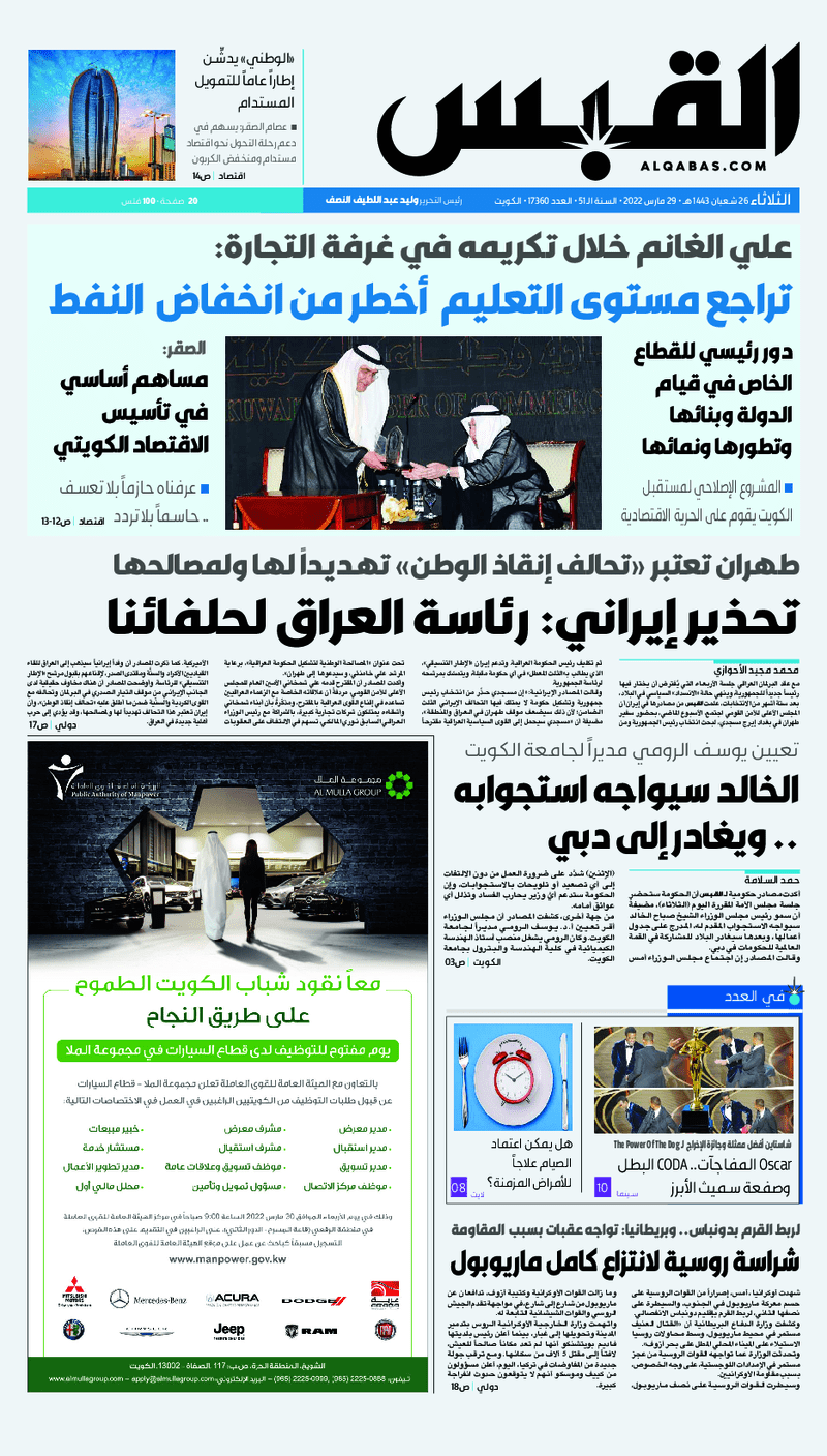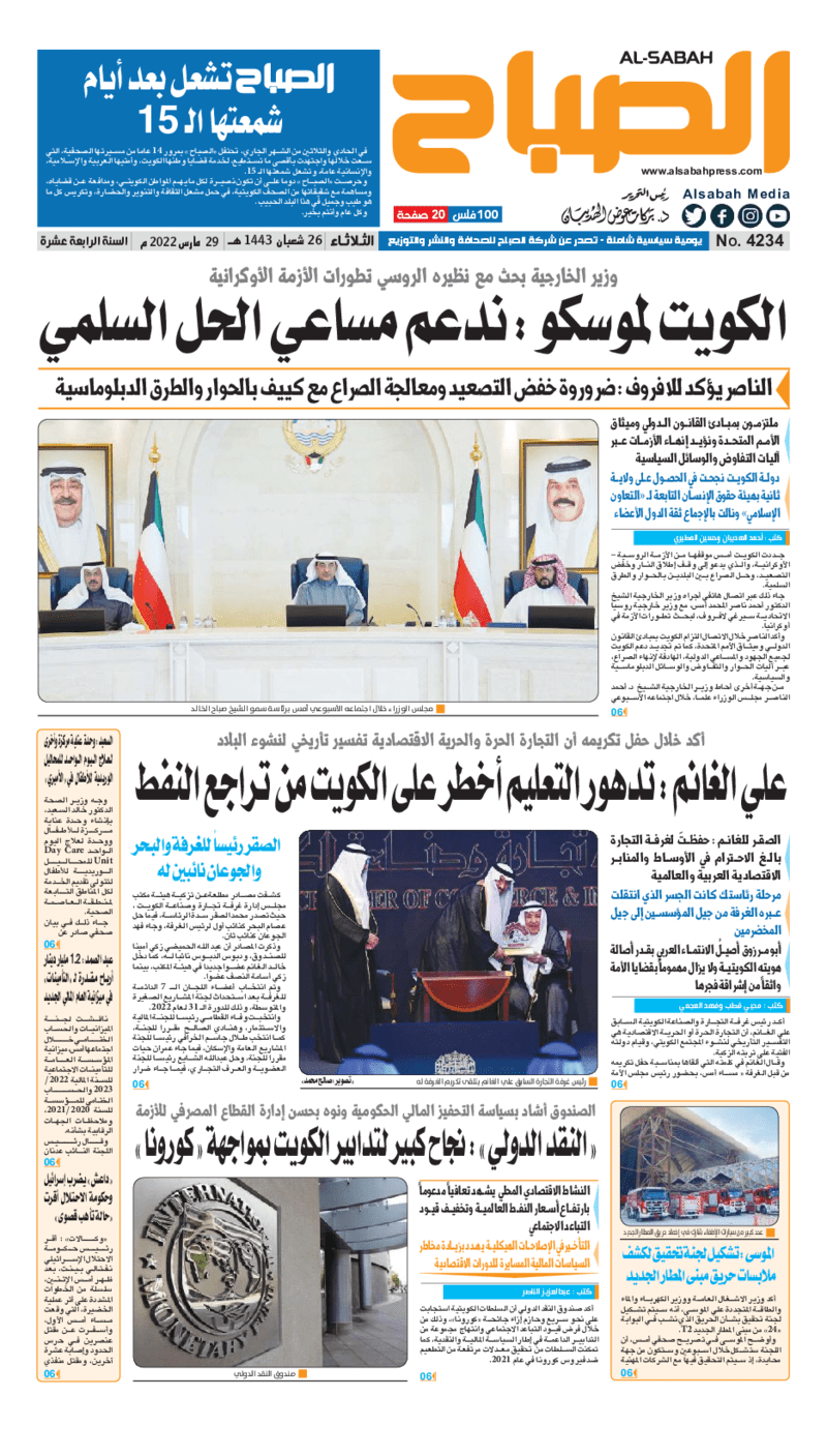 آخر الأخبار جرائم وقضايا “الجمارك” تضبط 29 ألف علبة مشروبات كحولية قادمة من دولة آسيوية في ميناء الشويخ 9 يونيو، 2024 محليات ممثلة عن دولة الكويت الطبيبة الكويتية أسماء الكندري تشارك في المؤتمر العالمي للمناظير في إيطاليا 8 يونيو، 2024 محليات “الصحة”: اكتمال وصول فريق الخدمات الطبية ببعثة الحج الكويتية لمكة المكرمة 8 يونيو، 2024 محليات “الصحة” تحدد 8 مراكز للصحة المدرسية لاستقبال الطلبة المبتعثين 8 يونيو، 2024 عربي وعالمي “الصحة العالمية”: تسجيل أول وفاة لشخص مصاب بـ«أنفلونزا الطيور» 7 يونيو، 2024 محليات عناوين الصحف الكويتية ليوم الثلاثاء 29 مارس 2022 محرر المحليات29 مارس، 2022أضف تعليق1 دقائق جريدة الجريدة جريدة الأنباء جريدة القبس جريدة السياسة جريدة الوطن جريدة الصباح جريدة عرب تايمز الوسومTop عناوين الصحف المحلية من الممكن أن يعجبك جرائم وقضايا “الجمارك” تضبط 29 ألف علبة مشروبات كحولية قادمة من دولة آسيوية في ميناء الشويخ محليات ممثلة عن دولة الكويت الطبيبة الكويتية أسماء الكندري تشارك في المؤتمر العالمي للمناظير في إيطاليا محليات “الصحة”: اكتمال وصول فريق الخدمات الطبية ببعثة الحج الكويتية لمكة المكرمة محليات “الصحة” تحدد 8 مراكز للصحة المدرسية لاستقبال الطلبة المبتعثين عربي وعالمي “الصحة العالمية”: تسجيل أول وفاة لشخص مصاب بـ«أنفلونزا الطيور» تكنولوجيا رش السحب بملح البحر.. تجربة “ثورية” لتبريد كوكب الأرض أضف تعليق أضغط هنا لإضافة تعليق إلغاء الردالتعليقالاسم البريد الإلكتروني الموقع الإلكتروني Δ هذا الموقع يستخدم خدمة أكيسميت للتقليل من البريد المزعجة. اعرف المزيد عن كيفية التعامل مع بيانات التعليقات الخاصة بك processed.