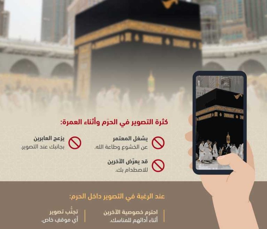 دعت وزارة الحج والعمرة السعودية، المعتمرين في بيت الله الحرام إلى التفرغ للعبادة في أطهر بقاع العالم، مشيرة إلى أن «كثرة التصوير في الحرم وأثناء العمرة تشغل المعتمر عن الخشوع وطاعة الله، وتزعج العابرين بجانبك أثناء التصوير، وقد تعرض الآخرين للاصدام بك».