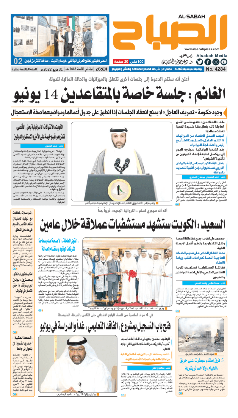 آخر الأخبار جرائم وقضايا “الجمارك” تضبط 29 ألف علبة مشروبات كحولية قادمة من دولة آسيوية في ميناء الشويخ 9 يونيو، 2024 محليات ممثلة عن دولة الكويت الطبيبة الكويتية أسماء الكندري تشارك في المؤتمر العالمي للمناظير في إيطاليا 8 يونيو، 2024 محليات “الصحة”: اكتمال وصول فريق الخدمات الطبية ببعثة الحج الكويتية لمكة المكرمة 8 يونيو، 2024 محليات “الصحة” تحدد 8 مراكز للصحة المدرسية لاستقبال الطلبة المبتعثين 8 يونيو، 2024 عربي وعالمي “الصحة العالمية”: تسجيل أول وفاة لشخص مصاب بـ«أنفلونزا الطيور» 7 يونيو، 2024 محليات عناوين الصحف الكويتية ليوم الثلاثاء 31 مايو 2022 محرر المحليات31 مايو، 2022أضف تعليق1 دقائق جريدة الجريدة جريدة الأنباء جريدة القبس جريدة السياسة جريدة الوطن جريدة الصباح جريدة عرب تايمز الوسومTop عناوين الصحف المحلية من الممكن أن يعجبك جرائم وقضايا “الجمارك” تضبط 29 ألف علبة مشروبات كحولية قادمة من دولة آسيوية في ميناء الشويخ محليات ممثلة عن دولة الكويت الطبيبة الكويتية أسماء الكندري تشارك في المؤتمر العالمي للمناظير في إيطاليا محليات “الصحة”: اكتمال وصول فريق الخدمات الطبية ببعثة الحج الكويتية لمكة المكرمة محليات “الصحة” تحدد 8 مراكز للصحة المدرسية لاستقبال الطلبة المبتعثين عربي وعالمي “الصحة العالمية”: تسجيل أول وفاة لشخص مصاب بـ«أنفلونزا الطيور» تكنولوجيا رش السحب بملح البحر.. تجربة “ثورية” لتبريد كوكب الأرض أضف تعليق أضغط هنا لإضافة تعليق إلغاء الردالتعليقالاسم البريد الإلكتروني الموقع الإلكتروني Δ هذا الموقع يستخدم خدمة أكيسميت للتقليل من البريد المزعجة. اعرف المزيد عن كيفية التعامل مع بيانات التعليقات الخاصة بك processed.