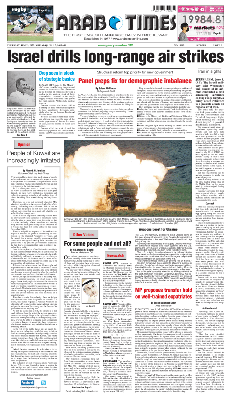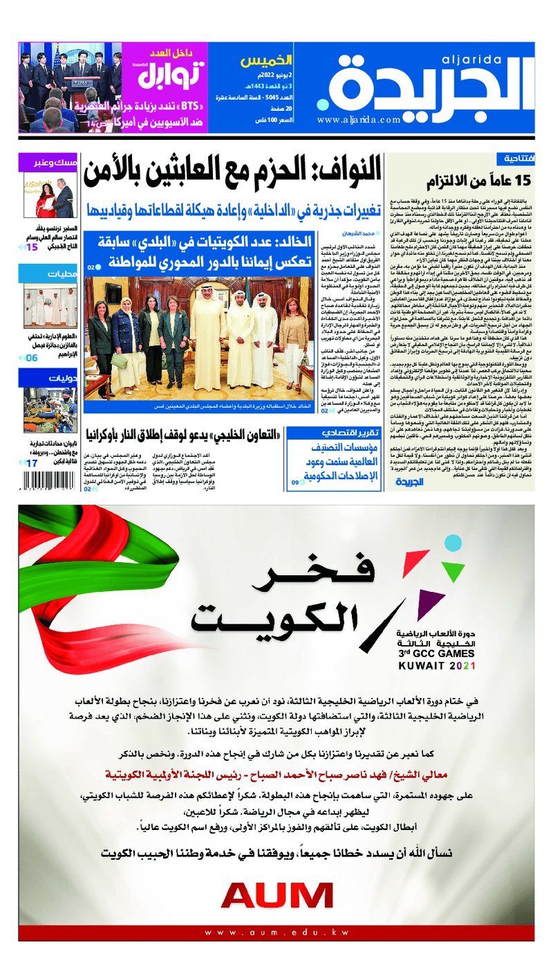 آخر الأخبار جرائم وقضايا “الجمارك” تضبط 29 ألف علبة مشروبات كحولية قادمة من دولة آسيوية في ميناء الشويخ 9 يونيو، 2024 محليات ممثلة عن دولة الكويت الطبيبة الكويتية أسماء الكندري تشارك في المؤتمر العالمي للمناظير في إيطاليا 8 يونيو، 2024 محليات “الصحة”: اكتمال وصول فريق الخدمات الطبية ببعثة الحج الكويتية لمكة المكرمة 8 يونيو، 2024 محليات “الصحة” تحدد 8 مراكز للصحة المدرسية لاستقبال الطلبة المبتعثين 8 يونيو، 2024 عربي وعالمي “الصحة العالمية”: تسجيل أول وفاة لشخص مصاب بـ«أنفلونزا الطيور» 7 يونيو، 2024 محليات عناوين الصحف الكويتية ليوم الخميس 02 يونيو 2022 محرر المحليات2 يونيو، 2022أضف تعليق1 دقائق جريدة الجريدة جريدة الأنباء جريدة القبس جريدة السياسة جريدة الوطن جريدة الصباح جريدة عرب تايمز الوسومTop عناوين الصحف المحلية من الممكن أن يعجبك جرائم وقضايا “الجمارك” تضبط 29 ألف علبة مشروبات كحولية قادمة من دولة آسيوية في ميناء الشويخ محليات ممثلة عن دولة الكويت الطبيبة الكويتية أسماء الكندري تشارك في المؤتمر العالمي للمناظير في إيطاليا محليات “الصحة”: اكتمال وصول فريق الخدمات الطبية ببعثة الحج الكويتية لمكة المكرمة محليات “الصحة” تحدد 8 مراكز للصحة المدرسية لاستقبال الطلبة المبتعثين عربي وعالمي “الصحة العالمية”: تسجيل أول وفاة لشخص مصاب بـ«أنفلونزا الطيور» تكنولوجيا رش السحب بملح البحر.. تجربة “ثورية” لتبريد كوكب الأرض أضف تعليق أضغط هنا لإضافة تعليق إلغاء الردالتعليقالاسم البريد الإلكتروني الموقع الإلكتروني Δ هذا الموقع يستخدم خدمة أكيسميت للتقليل من البريد المزعجة. اعرف المزيد عن كيفية التعامل مع بيانات التعليقات الخاصة بك processed.