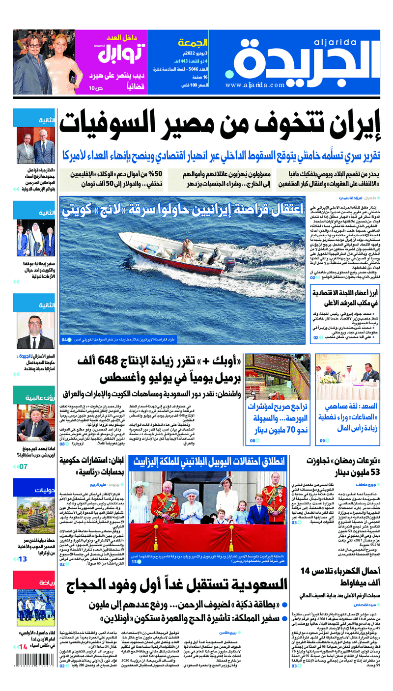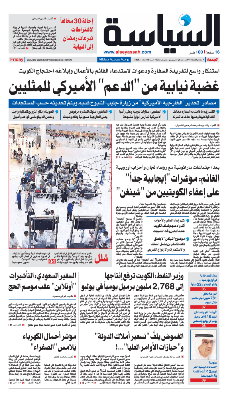 آخر الأخبار جرائم وقضايا “الجمارك” تضبط 29 ألف علبة مشروبات كحولية قادمة من دولة آسيوية في ميناء الشويخ 9 يونيو، 2024 محليات ممثلة عن دولة الكويت الطبيبة الكويتية أسماء الكندري تشارك في المؤتمر العالمي للمناظير في إيطاليا 8 يونيو، 2024 محليات “الصحة”: اكتمال وصول فريق الخدمات الطبية ببعثة الحج الكويتية لمكة المكرمة 8 يونيو، 2024 محليات “الصحة” تحدد 8 مراكز للصحة المدرسية لاستقبال الطلبة المبتعثين 8 يونيو، 2024 عربي وعالمي “الصحة العالمية”: تسجيل أول وفاة لشخص مصاب بـ«أنفلونزا الطيور» 7 يونيو، 2024 محليات عناوين الصحف الكويتية ليوم الجمعة 03 يونيو 2022 محرر المحليات3 يونيو، 2022أضف تعليق1 دقائق جريدة الجريدة جريدة الأنباء جريدة القبس جريدة السياسة جريدة الوطن جريدة الصباح جريدة عرب تايمز الوسومTop عناوين الصحف المحلية من الممكن أن يعجبك جرائم وقضايا “الجمارك” تضبط 29 ألف علبة مشروبات كحولية قادمة من دولة آسيوية في ميناء الشويخ محليات ممثلة عن دولة الكويت الطبيبة الكويتية أسماء الكندري تشارك في المؤتمر العالمي للمناظير في إيطاليا محليات “الصحة”: اكتمال وصول فريق الخدمات الطبية ببعثة الحج الكويتية لمكة المكرمة محليات “الصحة” تحدد 8 مراكز للصحة المدرسية لاستقبال الطلبة المبتعثين عربي وعالمي “الصحة العالمية”: تسجيل أول وفاة لشخص مصاب بـ«أنفلونزا الطيور» تكنولوجيا رش السحب بملح البحر.. تجربة “ثورية” لتبريد كوكب الأرض أضف تعليق أضغط هنا لإضافة تعليق إلغاء الردالتعليقالاسم البريد الإلكتروني الموقع الإلكتروني Δ هذا الموقع يستخدم خدمة أكيسميت للتقليل من البريد المزعجة. اعرف المزيد عن كيفية التعامل مع بيانات التعليقات الخاصة بك processed.
