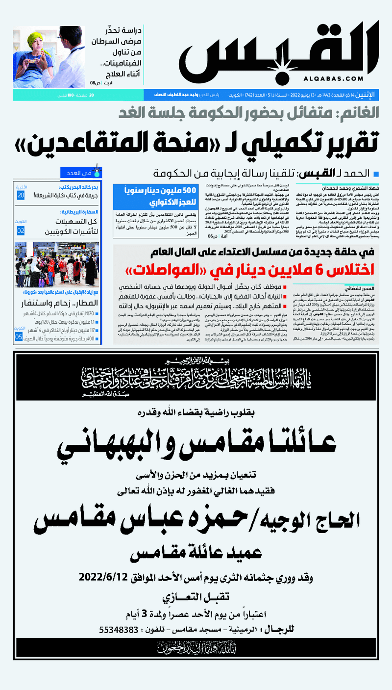 آخر الأخبار جرائم وقضايا “الجمارك” تضبط 29 ألف علبة مشروبات كحولية قادمة من دولة آسيوية في ميناء الشويخ 9 يونيو، 2024 محليات ممثلة عن دولة الكويت الطبيبة الكويتية أسماء الكندري تشارك في المؤتمر العالمي للمناظير في إيطاليا 8 يونيو، 2024 محليات “الصحة”: اكتمال وصول فريق الخدمات الطبية ببعثة الحج الكويتية لمكة المكرمة 8 يونيو، 2024 محليات “الصحة” تحدد 8 مراكز للصحة المدرسية لاستقبال الطلبة المبتعثين 8 يونيو، 2024 عربي وعالمي “الصحة العالمية”: تسجيل أول وفاة لشخص مصاب بـ«أنفلونزا الطيور» 7 يونيو، 2024 محليات عناوين الصحف الكويتية ليوم الاثنين 13 يونيو 2022 محرر المحليات13 يونيو، 2022أضف تعليق1 دقائق جريدة الجريدة جريدة الأنباء جريدة القبس جريدة السياسة جريدة الوطن جريدة الصباح جريدة عرب تايمز الوسومTop عناوين الصحف المحلية من الممكن أن يعجبك جرائم وقضايا “الجمارك” تضبط 29 ألف علبة مشروبات كحولية قادمة من دولة آسيوية في ميناء الشويخ محليات ممثلة عن دولة الكويت الطبيبة الكويتية أسماء الكندري تشارك في المؤتمر العالمي للمناظير في إيطاليا محليات “الصحة”: اكتمال وصول فريق الخدمات الطبية ببعثة الحج الكويتية لمكة المكرمة محليات “الصحة” تحدد 8 مراكز للصحة المدرسية لاستقبال الطلبة المبتعثين عربي وعالمي “الصحة العالمية”: تسجيل أول وفاة لشخص مصاب بـ«أنفلونزا الطيور» تكنولوجيا رش السحب بملح البحر.. تجربة “ثورية” لتبريد كوكب الأرض أضف تعليق أضغط هنا لإضافة تعليق إلغاء الردالتعليقالاسم البريد الإلكتروني الموقع الإلكتروني Δ هذا الموقع يستخدم خدمة أكيسميت للتقليل من البريد المزعجة. اعرف المزيد عن كيفية التعامل مع بيانات التعليقات الخاصة بك processed.