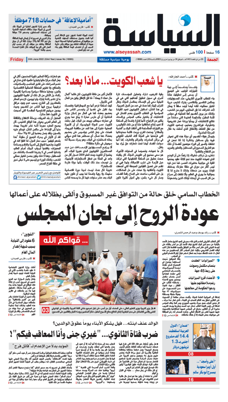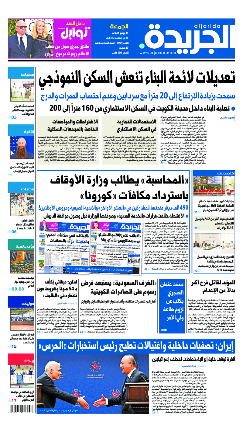 آخر الأخبار جرائم وقضايا “الجمارك” تضبط 29 ألف علبة مشروبات كحولية قادمة من دولة آسيوية في ميناء الشويخ 9 يونيو، 2024 محليات ممثلة عن دولة الكويت الطبيبة الكويتية أسماء الكندري تشارك في المؤتمر العالمي للمناظير في إيطاليا 8 يونيو، 2024 محليات “الصحة”: اكتمال وصول فريق الخدمات الطبية ببعثة الحج الكويتية لمكة المكرمة 8 يونيو، 2024 محليات “الصحة” تحدد 8 مراكز للصحة المدرسية لاستقبال الطلبة المبتعثين 8 يونيو، 2024 عربي وعالمي “الصحة العالمية”: تسجيل أول وفاة لشخص مصاب بـ«أنفلونزا الطيور» 7 يونيو، 2024 محليات عناوين الصحف الكويتية ليوم الجمعة 24 يونيو 2022 محرر المحليات24 يونيو، 2022أضف تعليق1 دقائق جريدة الجريدة جريدة الأنباء جريدة القبس جريدة السياسة جريدة الوطن جريدة الصباح جريدة عرب تايمز الوسومTop عناوين الصحف المحلية من الممكن أن يعجبك جرائم وقضايا “الجمارك” تضبط 29 ألف علبة مشروبات كحولية قادمة من دولة آسيوية في ميناء الشويخ محليات ممثلة عن دولة الكويت الطبيبة الكويتية أسماء الكندري تشارك في المؤتمر العالمي للمناظير في إيطاليا محليات “الصحة”: اكتمال وصول فريق الخدمات الطبية ببعثة الحج الكويتية لمكة المكرمة محليات “الصحة” تحدد 8 مراكز للصحة المدرسية لاستقبال الطلبة المبتعثين عربي وعالمي “الصحة العالمية”: تسجيل أول وفاة لشخص مصاب بـ«أنفلونزا الطيور» تكنولوجيا رش السحب بملح البحر.. تجربة “ثورية” لتبريد كوكب الأرض أضف تعليق أضغط هنا لإضافة تعليق إلغاء الردالتعليقالاسم البريد الإلكتروني الموقع الإلكتروني Δ هذا الموقع يستخدم خدمة أكيسميت للتقليل من البريد المزعجة. اعرف المزيد عن كيفية التعامل مع بيانات التعليقات الخاصة بك processed.