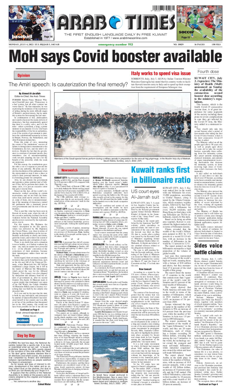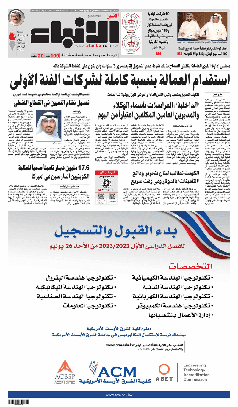 آخر الأخبار جرائم وقضايا “الجمارك” تضبط 29 ألف علبة مشروبات كحولية قادمة من دولة آسيوية في ميناء الشويخ 9 يونيو، 2024 محليات ممثلة عن دولة الكويت الطبيبة الكويتية أسماء الكندري تشارك في المؤتمر العالمي للمناظير في إيطاليا 8 يونيو، 2024 محليات “الصحة”: اكتمال وصول فريق الخدمات الطبية ببعثة الحج الكويتية لمكة المكرمة 8 يونيو، 2024 محليات “الصحة” تحدد 8 مراكز للصحة المدرسية لاستقبال الطلبة المبتعثين 8 يونيو، 2024 عربي وعالمي “الصحة العالمية”: تسجيل أول وفاة لشخص مصاب بـ«أنفلونزا الطيور» 7 يونيو، 2024 محليات عناوين الصحف الكويتية ليوم الاثنين 04 يوليو 2022 محرر المحليات4 يوليو، 2022أضف تعليق1 دقائق جريدة الجريدة جريدة الأنباء جريدة القبس جريدة السياسة جريدة الوطن جريدة الصباح جريدة عرب تايمز الوسومTop عناوين الصحف المحلية من الممكن أن يعجبك جرائم وقضايا “الجمارك” تضبط 29 ألف علبة مشروبات كحولية قادمة من دولة آسيوية في ميناء الشويخ محليات ممثلة عن دولة الكويت الطبيبة الكويتية أسماء الكندري تشارك في المؤتمر العالمي للمناظير في إيطاليا محليات “الصحة”: اكتمال وصول فريق الخدمات الطبية ببعثة الحج الكويتية لمكة المكرمة محليات “الصحة” تحدد 8 مراكز للصحة المدرسية لاستقبال الطلبة المبتعثين عربي وعالمي “الصحة العالمية”: تسجيل أول وفاة لشخص مصاب بـ«أنفلونزا الطيور» تكنولوجيا رش السحب بملح البحر.. تجربة “ثورية” لتبريد كوكب الأرض أضف تعليق أضغط هنا لإضافة تعليق إلغاء الردالتعليقالاسم البريد الإلكتروني الموقع الإلكتروني Δ هذا الموقع يستخدم خدمة أكيسميت للتقليل من البريد المزعجة. اعرف المزيد عن كيفية التعامل مع بيانات التعليقات الخاصة بك processed.