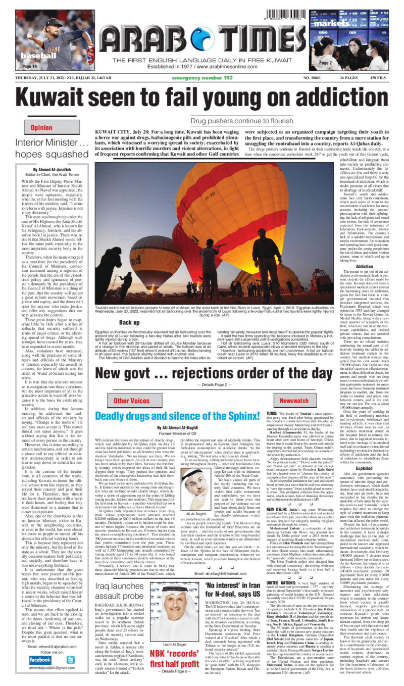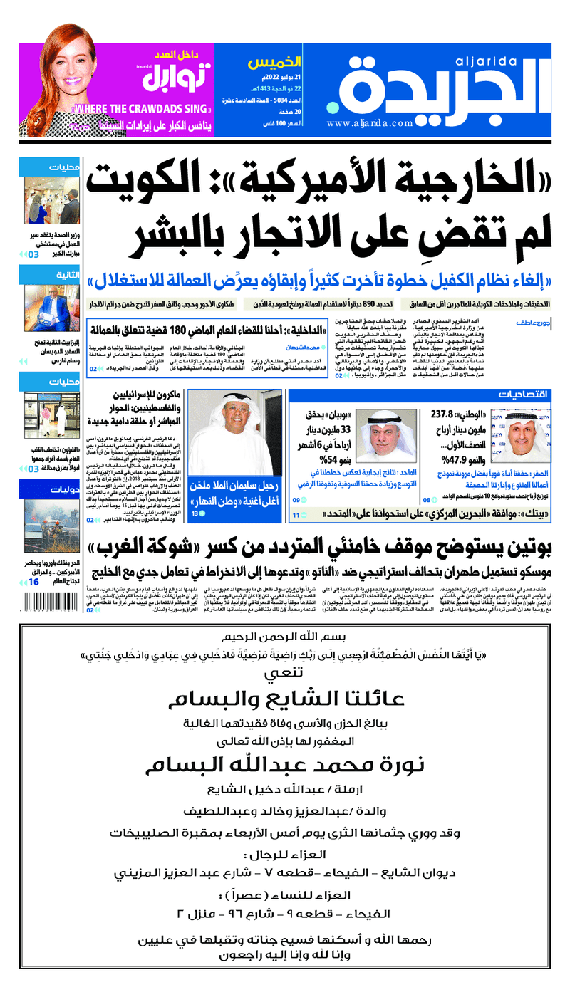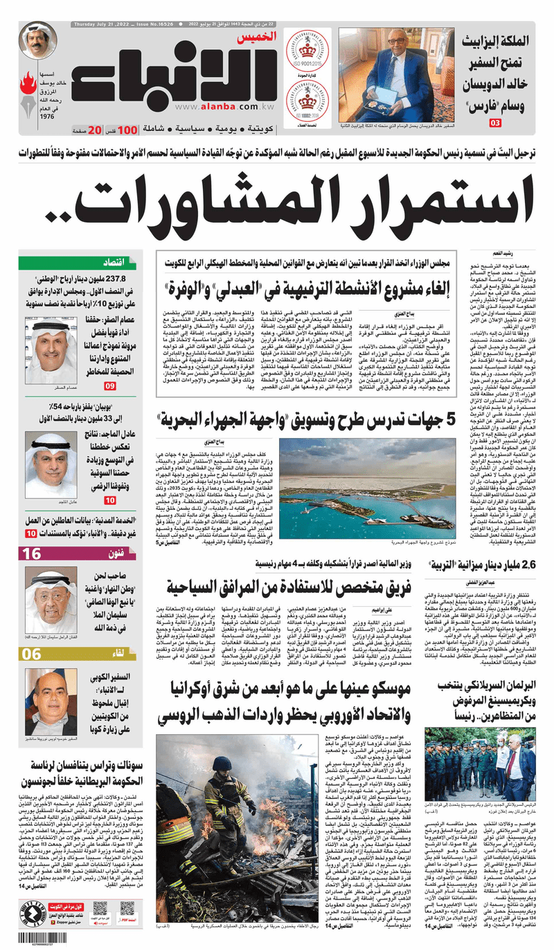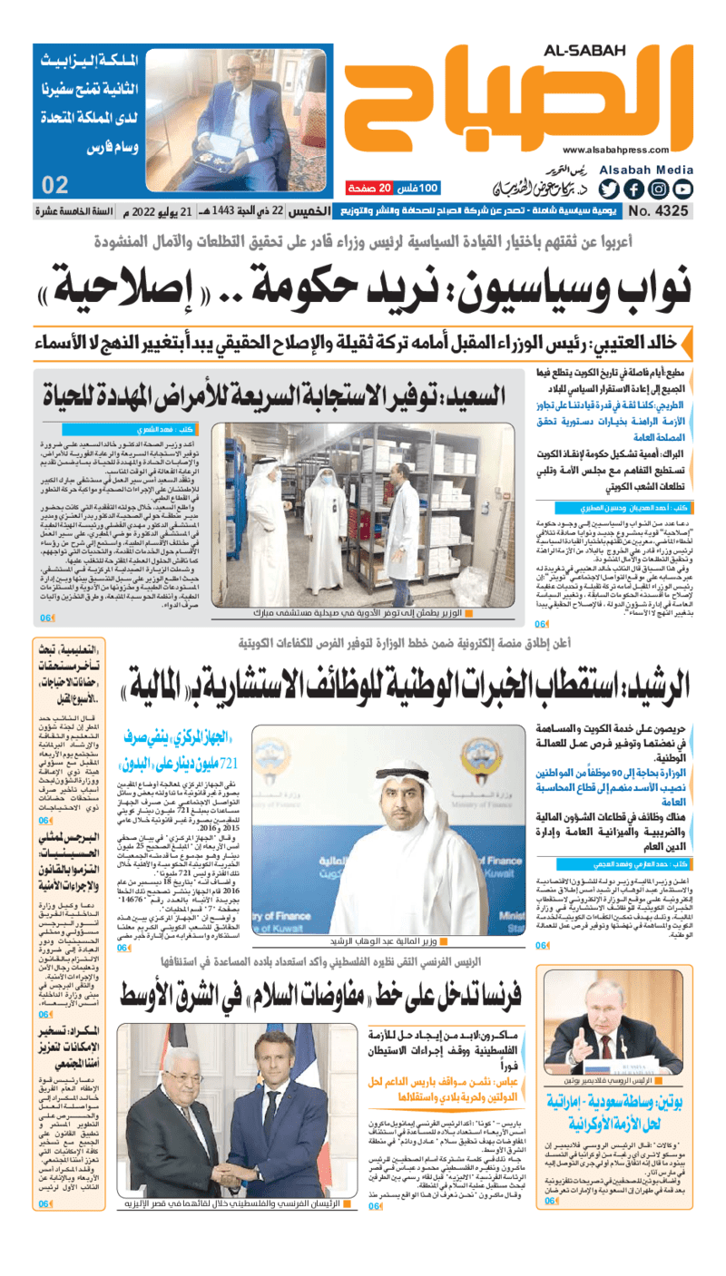 آخر الأخبار جرائم وقضايا “الجمارك” تضبط 29 ألف علبة مشروبات كحولية قادمة من دولة آسيوية في ميناء الشويخ 9 يونيو، 2024 محليات ممثلة عن دولة الكويت الطبيبة الكويتية أسماء الكندري تشارك في المؤتمر العالمي للمناظير في إيطاليا 8 يونيو، 2024 محليات “الصحة”: اكتمال وصول فريق الخدمات الطبية ببعثة الحج الكويتية لمكة المكرمة 8 يونيو، 2024 محليات “الصحة” تحدد 8 مراكز للصحة المدرسية لاستقبال الطلبة المبتعثين 8 يونيو، 2024 عربي وعالمي “الصحة العالمية”: تسجيل أول وفاة لشخص مصاب بـ«أنفلونزا الطيور» 7 يونيو، 2024 محليات عناوين الصحف الكويتية ليوم الخميس 21 يوليو 2022 محرر المحليات21 يوليو، 2022أضف تعليق1 دقائق جريدة الجريدة جريدة الأنباء جريدة القبس جريدة السياسة جريدة الوطن جريدة النهار جريدة الصباح جريدة عرب تايمز الوسومTop عناوين الصحف المحلية من الممكن أن يعجبك جرائم وقضايا “الجمارك” تضبط 29 ألف علبة مشروبات كحولية قادمة من دولة آسيوية في ميناء الشويخ محليات ممثلة عن دولة الكويت الطبيبة الكويتية أسماء الكندري تشارك في المؤتمر العالمي للمناظير في إيطاليا محليات “الصحة”: اكتمال وصول فريق الخدمات الطبية ببعثة الحج الكويتية لمكة المكرمة محليات “الصحة” تحدد 8 مراكز للصحة المدرسية لاستقبال الطلبة المبتعثين عربي وعالمي “الصحة العالمية”: تسجيل أول وفاة لشخص مصاب بـ«أنفلونزا الطيور» تكنولوجيا رش السحب بملح البحر.. تجربة “ثورية” لتبريد كوكب الأرض أضف تعليق أضغط هنا لإضافة تعليق إلغاء الردالتعليقالاسم البريد الإلكتروني الموقع الإلكتروني Δ هذا الموقع يستخدم خدمة أكيسميت للتقليل من البريد المزعجة. اعرف المزيد عن كيفية التعامل مع بيانات التعليقات الخاصة بك processed.
