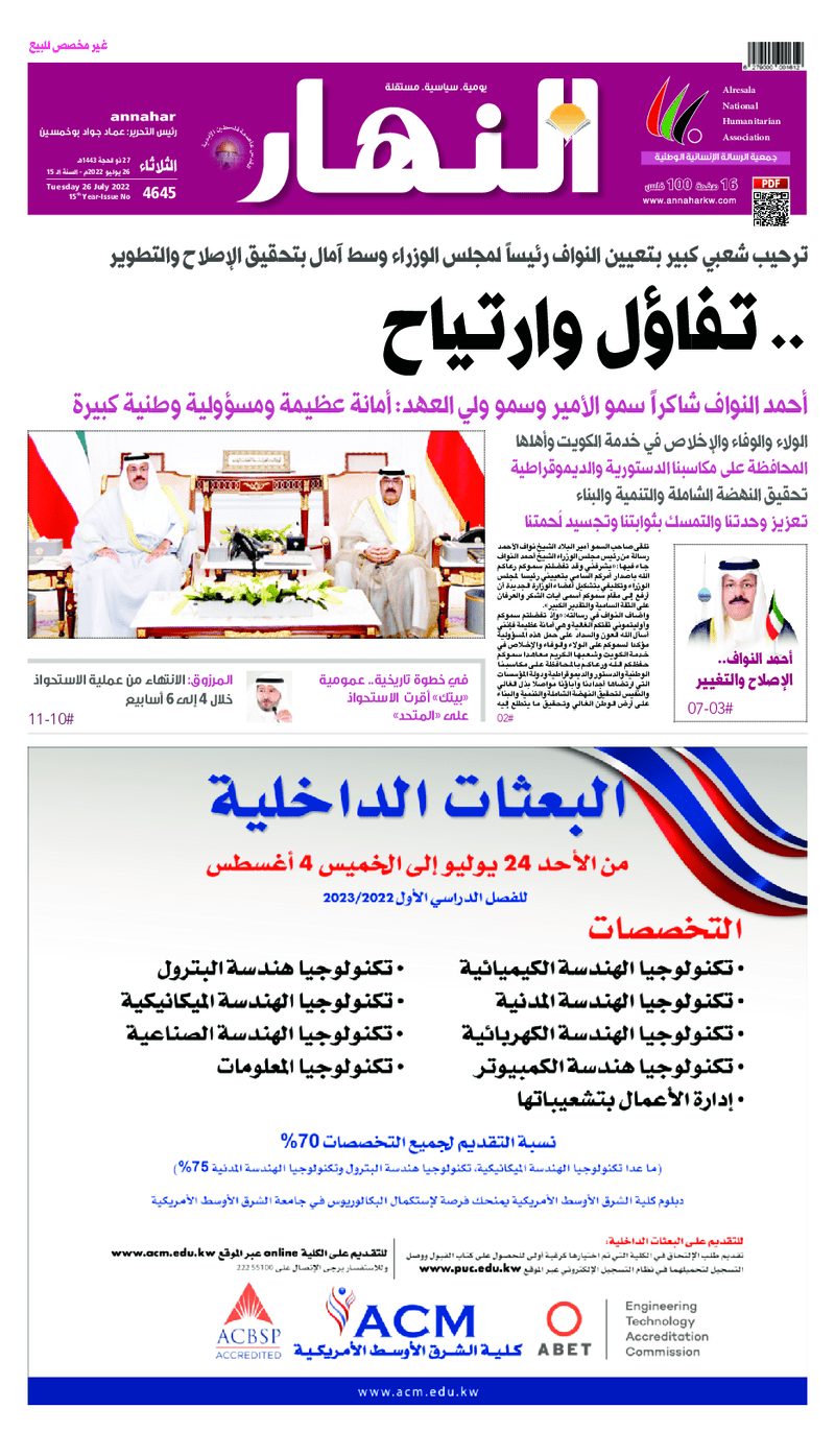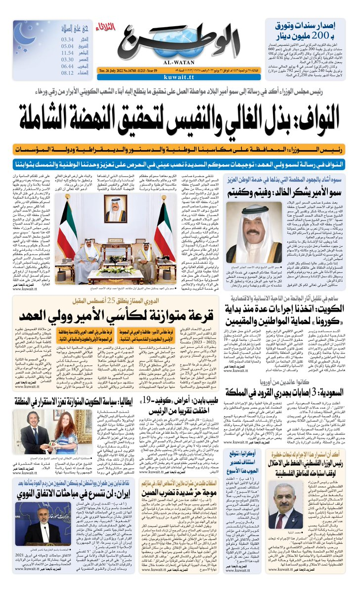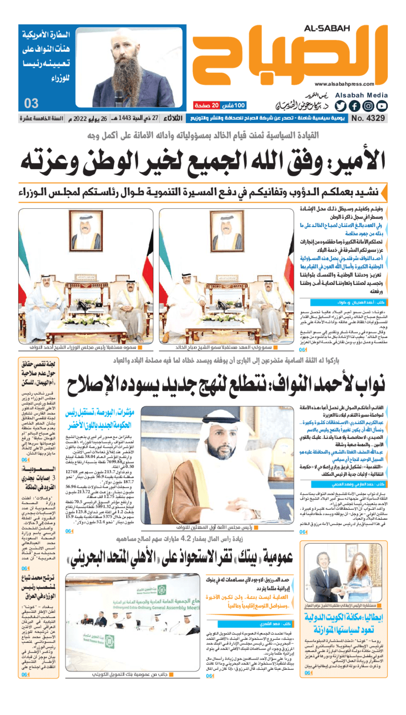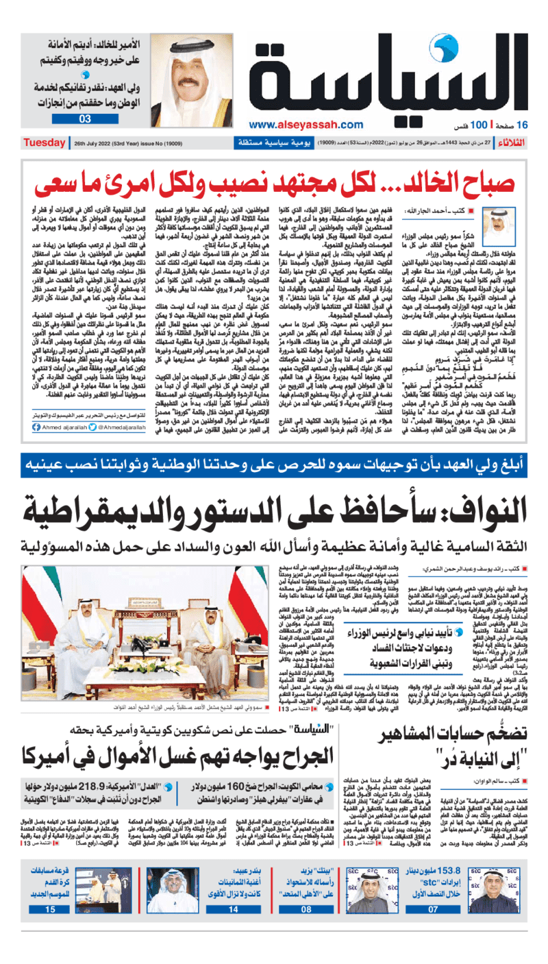 آخر الأخبار جرائم وقضايا “الجمارك” تضبط 29 ألف علبة مشروبات كحولية قادمة من دولة آسيوية في ميناء الشويخ 9 يونيو، 2024 محليات ممثلة عن دولة الكويت الطبيبة الكويتية أسماء الكندري تشارك في المؤتمر العالمي للمناظير في إيطاليا 8 يونيو، 2024 محليات “الصحة”: اكتمال وصول فريق الخدمات الطبية ببعثة الحج الكويتية لمكة المكرمة 8 يونيو، 2024 محليات “الصحة” تحدد 8 مراكز للصحة المدرسية لاستقبال الطلبة المبتعثين 8 يونيو، 2024 عربي وعالمي “الصحة العالمية”: تسجيل أول وفاة لشخص مصاب بـ«أنفلونزا الطيور» 7 يونيو، 2024 محليات عناوين الصحف الكويتية ليوم الثلاثاء 26 يوليو 2022 محرر المحليات26 يوليو، 2022أضف تعليق1 دقائق جريدة الجريدة جريدة الأنباء جريدة القبس جريدة السياسة جريدة الوطن جريدة النهار جريدة الصباح جريدة عرب تايمز الوسومTop عناوين الصحف المحلية من الممكن أن يعجبك جرائم وقضايا “الجمارك” تضبط 29 ألف علبة مشروبات كحولية قادمة من دولة آسيوية في ميناء الشويخ محليات ممثلة عن دولة الكويت الطبيبة الكويتية أسماء الكندري تشارك في المؤتمر العالمي للمناظير في إيطاليا محليات “الصحة”: اكتمال وصول فريق الخدمات الطبية ببعثة الحج الكويتية لمكة المكرمة محليات “الصحة” تحدد 8 مراكز للصحة المدرسية لاستقبال الطلبة المبتعثين عربي وعالمي “الصحة العالمية”: تسجيل أول وفاة لشخص مصاب بـ«أنفلونزا الطيور» تكنولوجيا رش السحب بملح البحر.. تجربة “ثورية” لتبريد كوكب الأرض أضف تعليق أضغط هنا لإضافة تعليق إلغاء الردالتعليقالاسم البريد الإلكتروني الموقع الإلكتروني Δ هذا الموقع يستخدم خدمة أكيسميت للتقليل من البريد المزعجة. اعرف المزيد عن كيفية التعامل مع بيانات التعليقات الخاصة بك processed.