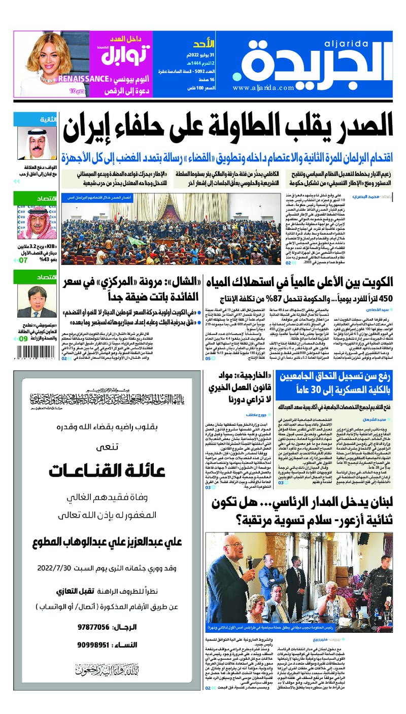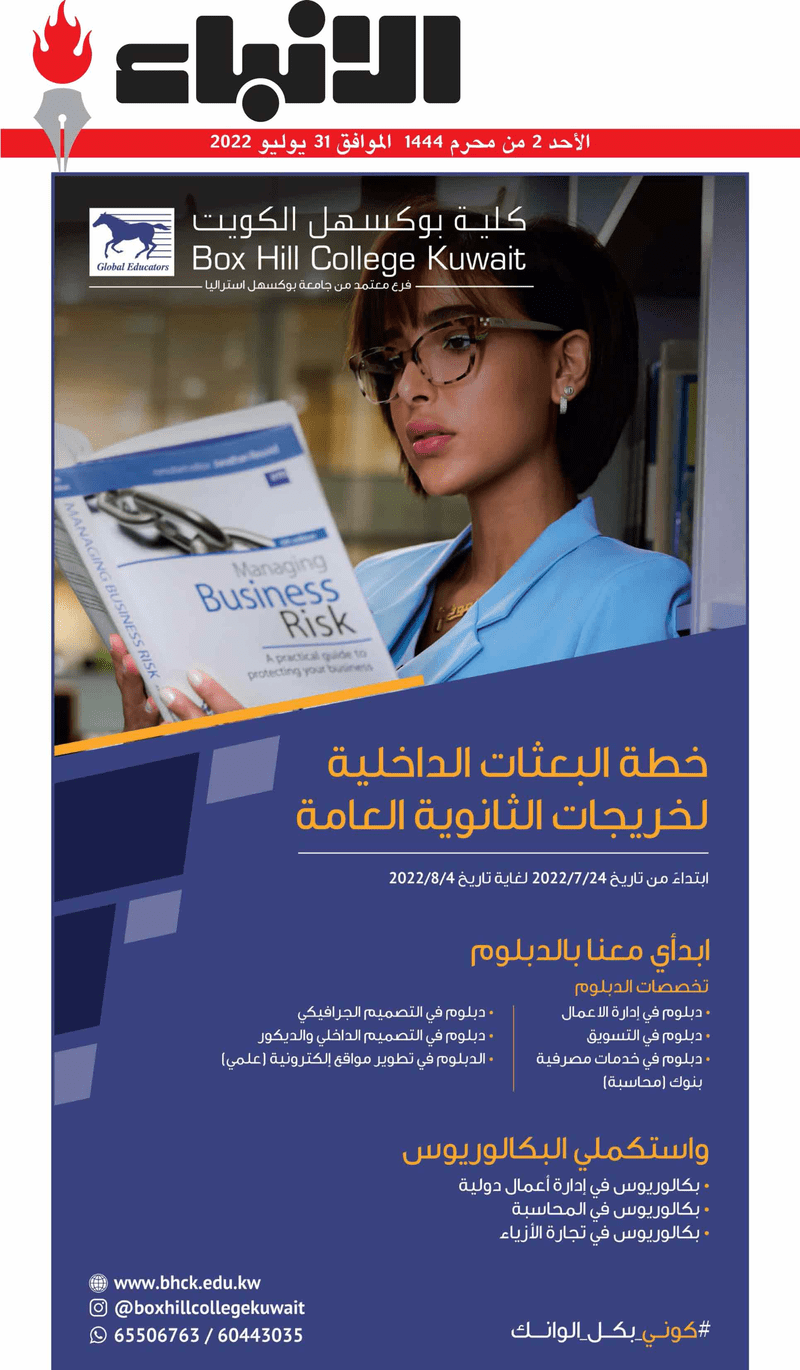 آخر الأخبار جرائم وقضايا “الجمارك” تضبط 29 ألف علبة مشروبات كحولية قادمة من دولة آسيوية في ميناء الشويخ 9 يونيو، 2024 محليات ممثلة عن دولة الكويت الطبيبة الكويتية أسماء الكندري تشارك في المؤتمر العالمي للمناظير في إيطاليا 8 يونيو، 2024 محليات “الصحة”: اكتمال وصول فريق الخدمات الطبية ببعثة الحج الكويتية لمكة المكرمة 8 يونيو، 2024 محليات “الصحة” تحدد 8 مراكز للصحة المدرسية لاستقبال الطلبة المبتعثين 8 يونيو، 2024 عربي وعالمي “الصحة العالمية”: تسجيل أول وفاة لشخص مصاب بـ«أنفلونزا الطيور» 7 يونيو، 2024 محليات عناوين الصحف الكويتية ليوم الأحد 31 يوليو 2022 محرر المحليات31 يوليو، 2022أضف تعليق1 دقائق جريدة الجريدة جريدة الأنباء جريدة القبس جريدة السياسة جريدة الوطن جريدة النهار جريدة الصباح جريدة عرب تايمز الوسومTop عناوين الصحف المحلية من الممكن أن يعجبك جرائم وقضايا “الجمارك” تضبط 29 ألف علبة مشروبات كحولية قادمة من دولة آسيوية في ميناء الشويخ محليات ممثلة عن دولة الكويت الطبيبة الكويتية أسماء الكندري تشارك في المؤتمر العالمي للمناظير في إيطاليا محليات “الصحة”: اكتمال وصول فريق الخدمات الطبية ببعثة الحج الكويتية لمكة المكرمة محليات “الصحة” تحدد 8 مراكز للصحة المدرسية لاستقبال الطلبة المبتعثين عربي وعالمي “الصحة العالمية”: تسجيل أول وفاة لشخص مصاب بـ«أنفلونزا الطيور» تكنولوجيا رش السحب بملح البحر.. تجربة “ثورية” لتبريد كوكب الأرض أضف تعليق أضغط هنا لإضافة تعليق إلغاء الردالتعليقالاسم البريد الإلكتروني الموقع الإلكتروني Δ هذا الموقع يستخدم خدمة أكيسميت للتقليل من البريد المزعجة. اعرف المزيد عن كيفية التعامل مع بيانات التعليقات الخاصة بك processed.