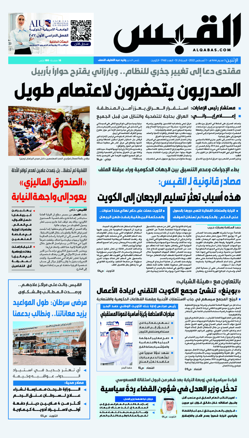 آخر الأخبار جرائم وقضايا “الجمارك” تضبط 29 ألف علبة مشروبات كحولية قادمة من دولة آسيوية في ميناء الشويخ 9 يونيو، 2024 محليات ممثلة عن دولة الكويت الطبيبة الكويتية أسماء الكندري تشارك في المؤتمر العالمي للمناظير في إيطاليا 8 يونيو، 2024 محليات “الصحة”: اكتمال وصول فريق الخدمات الطبية ببعثة الحج الكويتية لمكة المكرمة 8 يونيو، 2024 محليات “الصحة” تحدد 8 مراكز للصحة المدرسية لاستقبال الطلبة المبتعثين 8 يونيو، 2024 عربي وعالمي “الصحة العالمية”: تسجيل أول وفاة لشخص مصاب بـ«أنفلونزا الطيور» 7 يونيو، 2024 محليات عناوين الصحف الكويتية ليوم الاثنين 01 أغسطس 2022 محرر المحليات1 أغسطس، 2022أضف تعليق1 دقائق جريدة الجريدة جريدة الأنباء جريدة القبس جريدة الوطن جريدة النهار جريدة الصباح جريدة عرب تايمز الوسومTop عناوين الصحف المحلية من الممكن أن يعجبك جرائم وقضايا “الجمارك” تضبط 29 ألف علبة مشروبات كحولية قادمة من دولة آسيوية في ميناء الشويخ محليات ممثلة عن دولة الكويت الطبيبة الكويتية أسماء الكندري تشارك في المؤتمر العالمي للمناظير في إيطاليا محليات “الصحة”: اكتمال وصول فريق الخدمات الطبية ببعثة الحج الكويتية لمكة المكرمة محليات “الصحة” تحدد 8 مراكز للصحة المدرسية لاستقبال الطلبة المبتعثين عربي وعالمي “الصحة العالمية”: تسجيل أول وفاة لشخص مصاب بـ«أنفلونزا الطيور» تكنولوجيا رش السحب بملح البحر.. تجربة “ثورية” لتبريد كوكب الأرض أضف تعليق أضغط هنا لإضافة تعليق إلغاء الردالتعليقالاسم البريد الإلكتروني الموقع الإلكتروني Δ هذا الموقع يستخدم خدمة أكيسميت للتقليل من البريد المزعجة. اعرف المزيد عن كيفية التعامل مع بيانات التعليقات الخاصة بك processed.