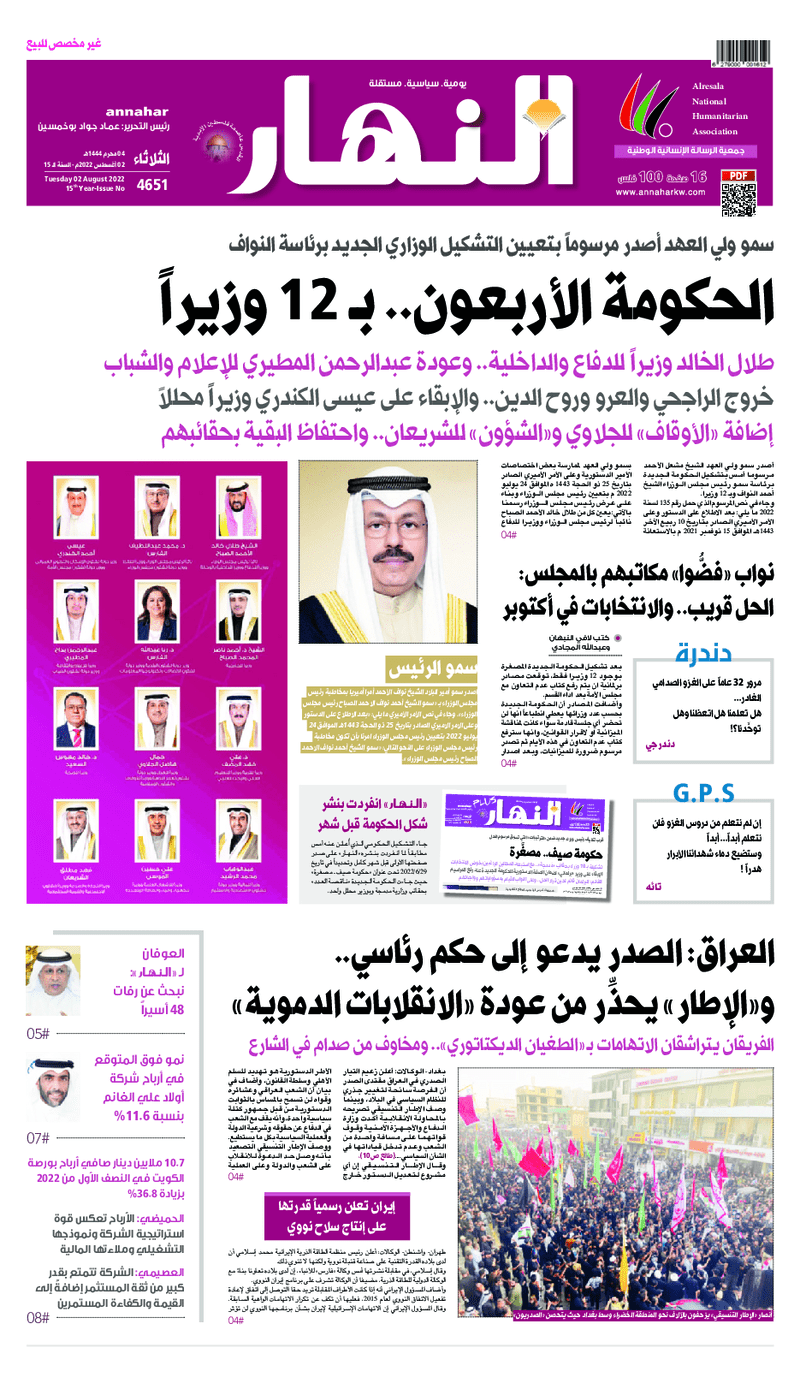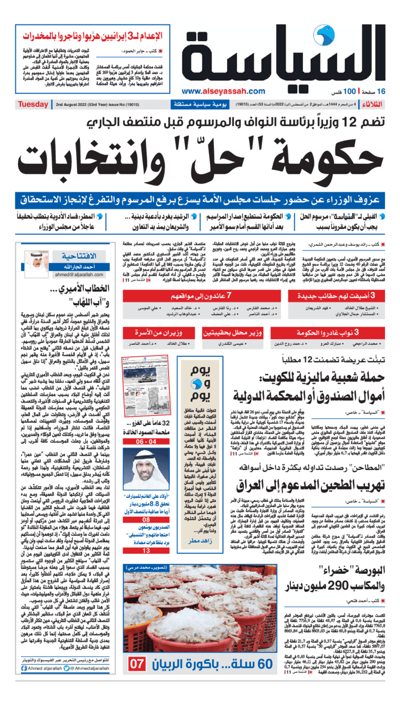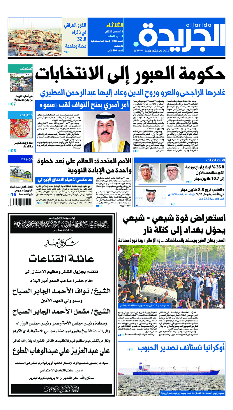 آخر الأخبار جرائم وقضايا “الجمارك” تضبط 29 ألف علبة مشروبات كحولية قادمة من دولة آسيوية في ميناء الشويخ 9 يونيو، 2024 محليات ممثلة عن دولة الكويت الطبيبة الكويتية أسماء الكندري تشارك في المؤتمر العالمي للمناظير في إيطاليا 8 يونيو، 2024 محليات “الصحة”: اكتمال وصول فريق الخدمات الطبية ببعثة الحج الكويتية لمكة المكرمة 8 يونيو، 2024 محليات “الصحة” تحدد 8 مراكز للصحة المدرسية لاستقبال الطلبة المبتعثين 8 يونيو، 2024 عربي وعالمي “الصحة العالمية”: تسجيل أول وفاة لشخص مصاب بـ«أنفلونزا الطيور» 7 يونيو، 2024 محليات عناوين الصحف الكويتية ليوم الثلاثاء 02 أغسطس 2022 محرر المحليات2 أغسطس، 2022أضف تعليق1 دقائق جريدة الجريدة جريدة الأنباء جريدة القبس جريدة السياسة جريدة الوطن جريدة النهار جريدة الصباح جريدة عرب تايمز الوسومTop عناوين الصحف المحلية من الممكن أن يعجبك جرائم وقضايا “الجمارك” تضبط 29 ألف علبة مشروبات كحولية قادمة من دولة آسيوية في ميناء الشويخ محليات ممثلة عن دولة الكويت الطبيبة الكويتية أسماء الكندري تشارك في المؤتمر العالمي للمناظير في إيطاليا محليات “الصحة”: اكتمال وصول فريق الخدمات الطبية ببعثة الحج الكويتية لمكة المكرمة محليات “الصحة” تحدد 8 مراكز للصحة المدرسية لاستقبال الطلبة المبتعثين عربي وعالمي “الصحة العالمية”: تسجيل أول وفاة لشخص مصاب بـ«أنفلونزا الطيور» تكنولوجيا رش السحب بملح البحر.. تجربة “ثورية” لتبريد كوكب الأرض أضف تعليق أضغط هنا لإضافة تعليق إلغاء الردالتعليقالاسم البريد الإلكتروني الموقع الإلكتروني Δ هذا الموقع يستخدم خدمة أكيسميت للتقليل من البريد المزعجة. اعرف المزيد عن كيفية التعامل مع بيانات التعليقات الخاصة بك processed.