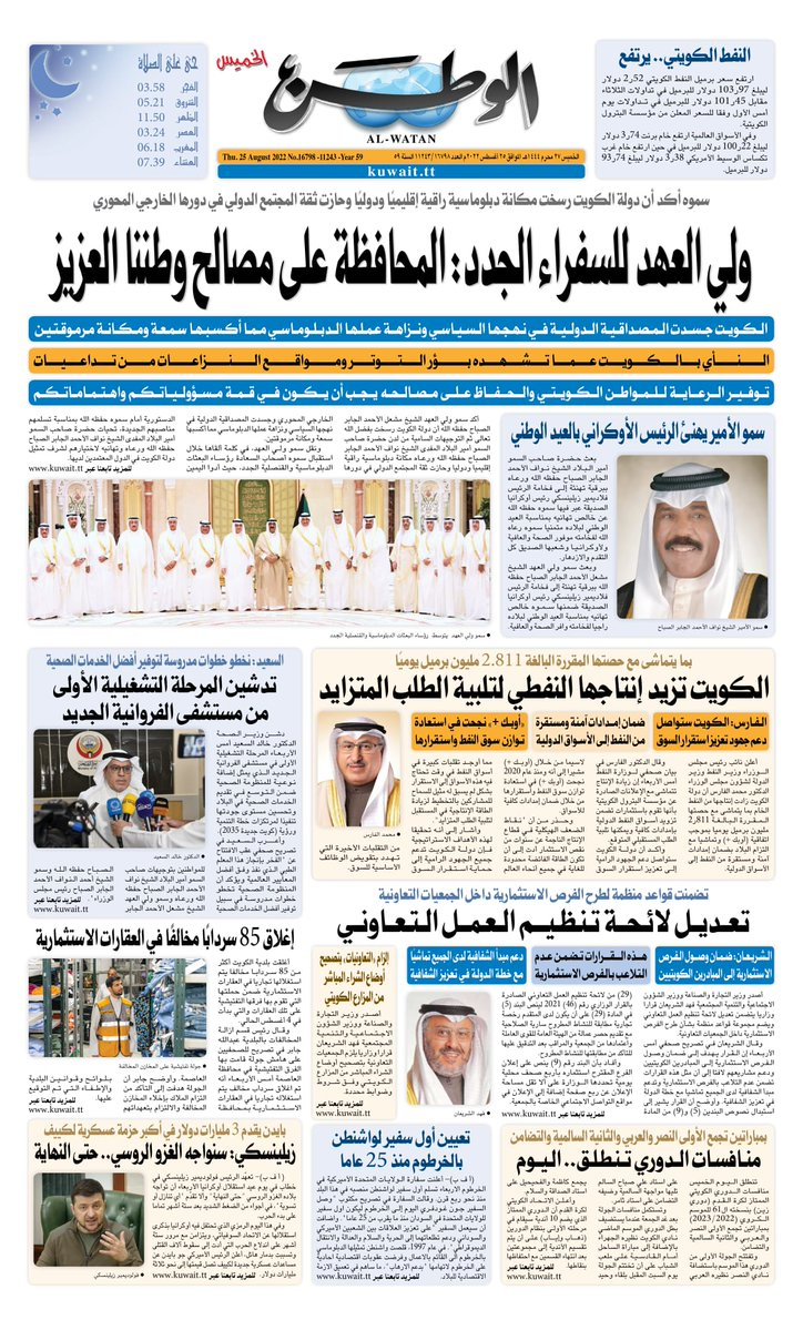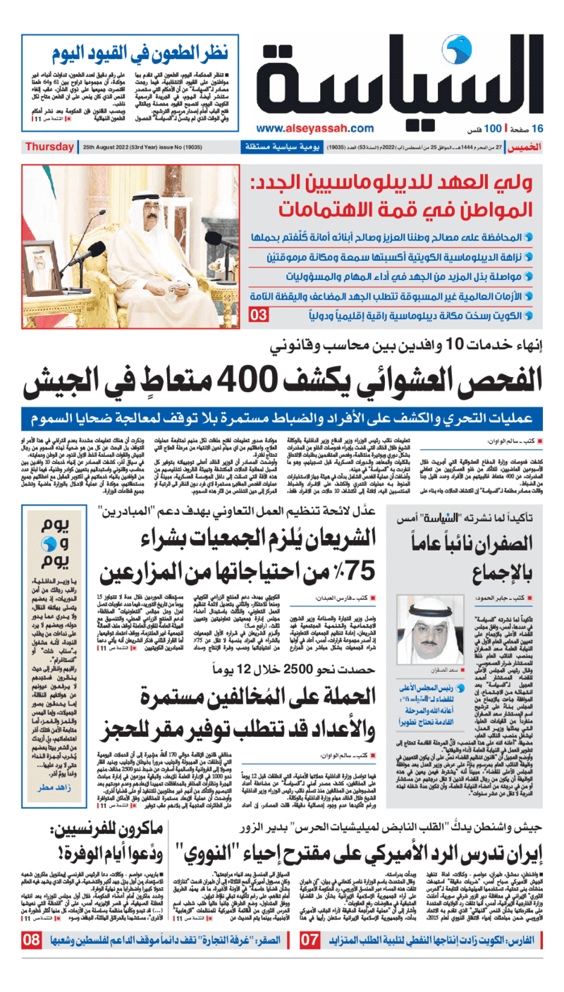 آخر الأخبار جرائم وقضايا “الجمارك” تضبط 29 ألف علبة مشروبات كحولية قادمة من دولة آسيوية في ميناء الشويخ 9 يونيو، 2024 محليات ممثلة عن دولة الكويت الطبيبة الكويتية أسماء الكندري تشارك في المؤتمر العالمي للمناظير في إيطاليا 8 يونيو، 2024 محليات “الصحة”: اكتمال وصول فريق الخدمات الطبية ببعثة الحج الكويتية لمكة المكرمة 8 يونيو، 2024 محليات “الصحة” تحدد 8 مراكز للصحة المدرسية لاستقبال الطلبة المبتعثين 8 يونيو، 2024 عربي وعالمي “الصحة العالمية”: تسجيل أول وفاة لشخص مصاب بـ«أنفلونزا الطيور» 7 يونيو، 2024 محليات عناوين الصحف الكويتية ليوم الخميس 25 أغسطس 2022 محرر المحليات25 أغسطس، 2022أضف تعليق1 دقائق جريدة الجريدة جريدة الأنباء جريدة القبس جريدة السياسة جريدة الوطن جريدة النهار جريدة الصباح جريدة عرب تايمز الوسومTop عناوين الصحف المحلية من الممكن أن يعجبك جرائم وقضايا “الجمارك” تضبط 29 ألف علبة مشروبات كحولية قادمة من دولة آسيوية في ميناء الشويخ محليات ممثلة عن دولة الكويت الطبيبة الكويتية أسماء الكندري تشارك في المؤتمر العالمي للمناظير في إيطاليا محليات “الصحة”: اكتمال وصول فريق الخدمات الطبية ببعثة الحج الكويتية لمكة المكرمة محليات “الصحة” تحدد 8 مراكز للصحة المدرسية لاستقبال الطلبة المبتعثين عربي وعالمي “الصحة العالمية”: تسجيل أول وفاة لشخص مصاب بـ«أنفلونزا الطيور» تكنولوجيا رش السحب بملح البحر.. تجربة “ثورية” لتبريد كوكب الأرض أضف تعليق أضغط هنا لإضافة تعليق إلغاء الردالتعليقالاسم البريد الإلكتروني الموقع الإلكتروني Δ هذا الموقع يستخدم خدمة أكيسميت للتقليل من البريد المزعجة. اعرف المزيد عن كيفية التعامل مع بيانات التعليقات الخاصة بك processed.