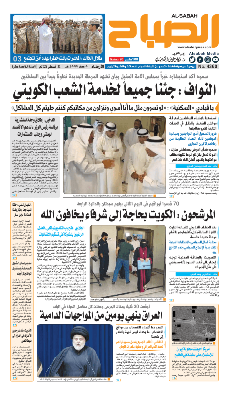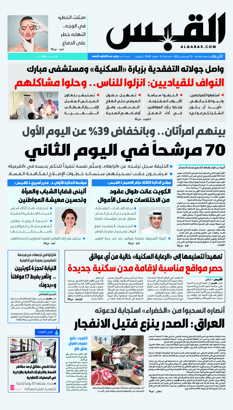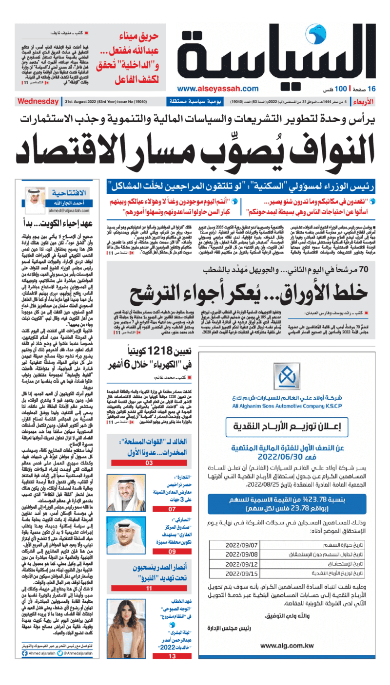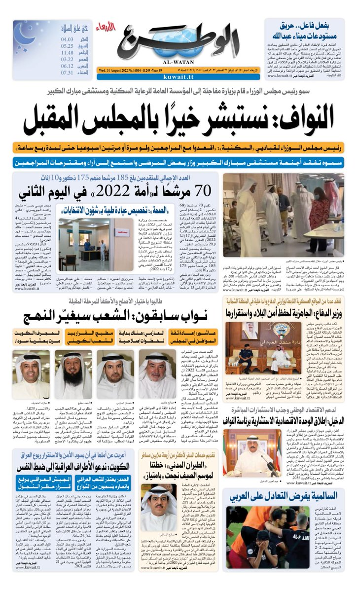 آخر الأخبار جرائم وقضايا “الجمارك” تضبط 29 ألف علبة مشروبات كحولية قادمة من دولة آسيوية في ميناء الشويخ 9 يونيو، 2024 محليات ممثلة عن دولة الكويت الطبيبة الكويتية أسماء الكندري تشارك في المؤتمر العالمي للمناظير في إيطاليا 8 يونيو، 2024 محليات “الصحة”: اكتمال وصول فريق الخدمات الطبية ببعثة الحج الكويتية لمكة المكرمة 8 يونيو، 2024 محليات “الصحة” تحدد 8 مراكز للصحة المدرسية لاستقبال الطلبة المبتعثين 8 يونيو، 2024 عربي وعالمي “الصحة العالمية”: تسجيل أول وفاة لشخص مصاب بـ«أنفلونزا الطيور» 7 يونيو، 2024 محليات عناوين الصحف الكويتية ليوم الأربعاء 31 أغسطس 2022 محرر المحليات31 أغسطس، 2022أضف تعليق1 دقائق جريدة الجريدة جريدة الأنباء جريدة القبس جريدة السياسة جريدة الوطن جريدة النهار جريدة الصباح جريدة عرب تايمز الوسومTop عناوين الصحف المحلية من الممكن أن يعجبك جرائم وقضايا “الجمارك” تضبط 29 ألف علبة مشروبات كحولية قادمة من دولة آسيوية في ميناء الشويخ محليات ممثلة عن دولة الكويت الطبيبة الكويتية أسماء الكندري تشارك في المؤتمر العالمي للمناظير في إيطاليا محليات “الصحة”: اكتمال وصول فريق الخدمات الطبية ببعثة الحج الكويتية لمكة المكرمة محليات “الصحة” تحدد 8 مراكز للصحة المدرسية لاستقبال الطلبة المبتعثين عربي وعالمي “الصحة العالمية”: تسجيل أول وفاة لشخص مصاب بـ«أنفلونزا الطيور» تكنولوجيا رش السحب بملح البحر.. تجربة “ثورية” لتبريد كوكب الأرض أضف تعليق أضغط هنا لإضافة تعليق إلغاء الردالتعليقالاسم البريد الإلكتروني الموقع الإلكتروني Δ هذا الموقع يستخدم خدمة أكيسميت للتقليل من البريد المزعجة. اعرف المزيد عن كيفية التعامل مع بيانات التعليقات الخاصة بك processed.