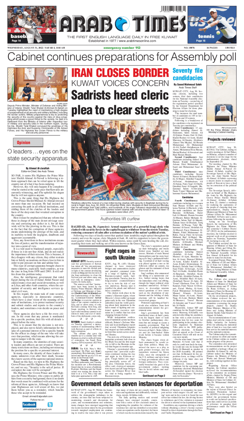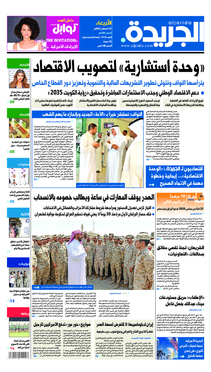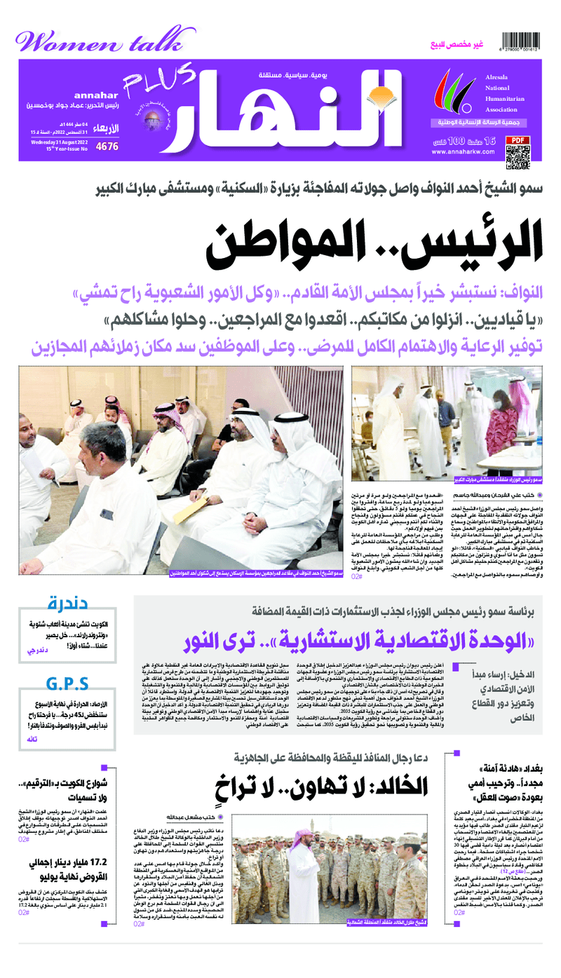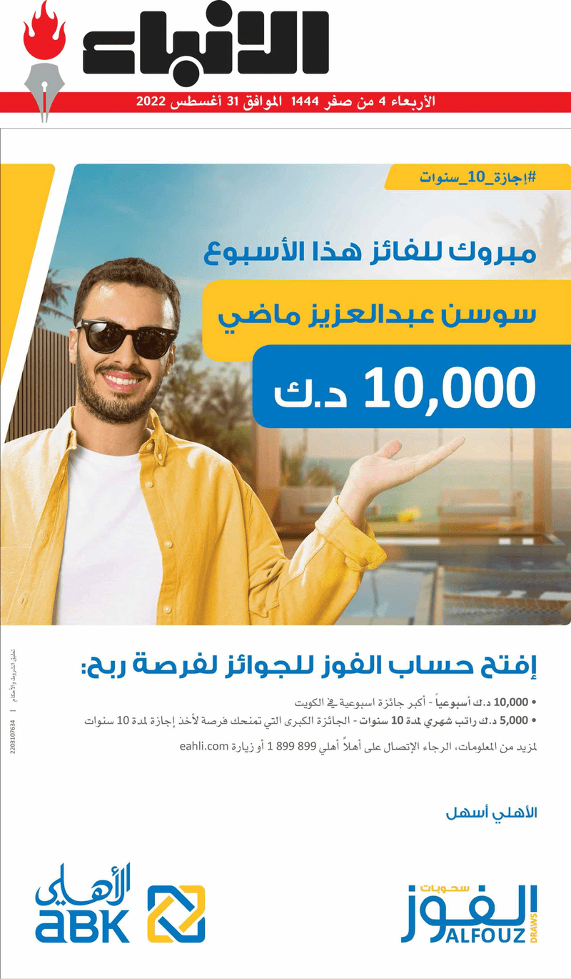 آخر الأخبار جرائم وقضايا “الجمارك” تضبط 29 ألف علبة مشروبات كحولية قادمة من دولة آسيوية في ميناء الشويخ 9 يونيو، 2024 محليات ممثلة عن دولة الكويت الطبيبة الكويتية أسماء الكندري تشارك في المؤتمر العالمي للمناظير في إيطاليا 8 يونيو، 2024 محليات “الصحة”: اكتمال وصول فريق الخدمات الطبية ببعثة الحج الكويتية لمكة المكرمة 8 يونيو، 2024 محليات “الصحة” تحدد 8 مراكز للصحة المدرسية لاستقبال الطلبة المبتعثين 8 يونيو، 2024 عربي وعالمي “الصحة العالمية”: تسجيل أول وفاة لشخص مصاب بـ«أنفلونزا الطيور» 7 يونيو، 2024 محليات عناوين الصحف الكويتية ليوم الأربعاء 31 أغسطس 2022 محرر المحليات31 أغسطس، 2022أضف تعليق1 دقائق جريدة الجريدة جريدة الأنباء جريدة القبس جريدة السياسة جريدة الوطن جريدة النهار جريدة الصباح جريدة عرب تايمز الوسومTop عناوين الصحف المحلية من الممكن أن يعجبك جرائم وقضايا “الجمارك” تضبط 29 ألف علبة مشروبات كحولية قادمة من دولة آسيوية في ميناء الشويخ محليات ممثلة عن دولة الكويت الطبيبة الكويتية أسماء الكندري تشارك في المؤتمر العالمي للمناظير في إيطاليا محليات “الصحة”: اكتمال وصول فريق الخدمات الطبية ببعثة الحج الكويتية لمكة المكرمة محليات “الصحة” تحدد 8 مراكز للصحة المدرسية لاستقبال الطلبة المبتعثين عربي وعالمي “الصحة العالمية”: تسجيل أول وفاة لشخص مصاب بـ«أنفلونزا الطيور» تكنولوجيا رش السحب بملح البحر.. تجربة “ثورية” لتبريد كوكب الأرض أضف تعليق أضغط هنا لإضافة تعليق إلغاء الردالتعليقالاسم البريد الإلكتروني الموقع الإلكتروني Δ هذا الموقع يستخدم خدمة أكيسميت للتقليل من البريد المزعجة. اعرف المزيد عن كيفية التعامل مع بيانات التعليقات الخاصة بك processed.