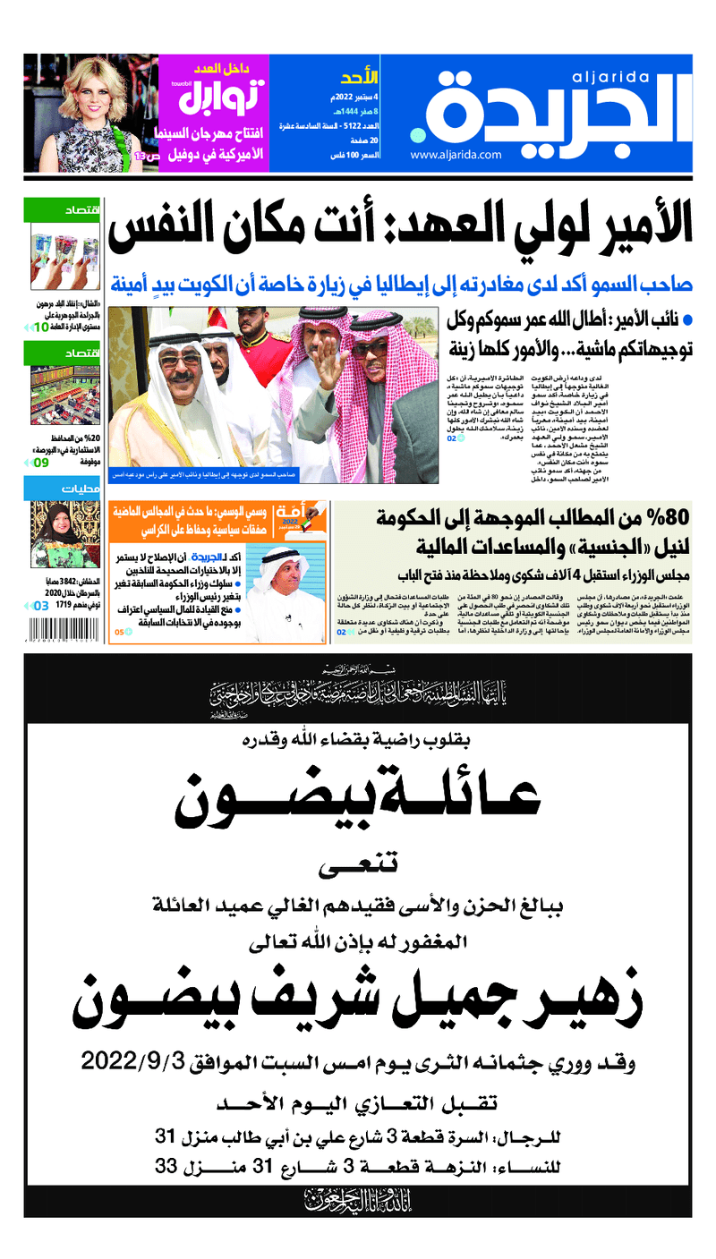 آخر الأخبار جرائم وقضايا “الجمارك” تضبط 29 ألف علبة مشروبات كحولية قادمة من دولة آسيوية في ميناء الشويخ 9 يونيو، 2024 محليات ممثلة عن دولة الكويت الطبيبة الكويتية أسماء الكندري تشارك في المؤتمر العالمي للمناظير في إيطاليا 8 يونيو، 2024 محليات “الصحة”: اكتمال وصول فريق الخدمات الطبية ببعثة الحج الكويتية لمكة المكرمة 8 يونيو، 2024 محليات “الصحة” تحدد 8 مراكز للصحة المدرسية لاستقبال الطلبة المبتعثين 8 يونيو، 2024 عربي وعالمي “الصحة العالمية”: تسجيل أول وفاة لشخص مصاب بـ«أنفلونزا الطيور» 7 يونيو، 2024 محليات عناوين الصحف الكويتية ليوم الأحد 04 سبتمبر 2022 محرر المحليات4 سبتمبر، 2022أضف تعليق1 دقائق جريدة الجريدة جريدة الأنباء جريدة القبس جريدة السياسة جريدة الوطن جريدة النهار جريدة الصباح جريدة عرب تايمز الوسومTop عناوين الصحف المحلية من الممكن أن يعجبك جرائم وقضايا “الجمارك” تضبط 29 ألف علبة مشروبات كحولية قادمة من دولة آسيوية في ميناء الشويخ محليات ممثلة عن دولة الكويت الطبيبة الكويتية أسماء الكندري تشارك في المؤتمر العالمي للمناظير في إيطاليا محليات “الصحة”: اكتمال وصول فريق الخدمات الطبية ببعثة الحج الكويتية لمكة المكرمة محليات “الصحة” تحدد 8 مراكز للصحة المدرسية لاستقبال الطلبة المبتعثين عربي وعالمي “الصحة العالمية”: تسجيل أول وفاة لشخص مصاب بـ«أنفلونزا الطيور» تكنولوجيا رش السحب بملح البحر.. تجربة “ثورية” لتبريد كوكب الأرض أضف تعليق أضغط هنا لإضافة تعليق إلغاء الردالتعليقالاسم البريد الإلكتروني الموقع الإلكتروني Δ هذا الموقع يستخدم خدمة أكيسميت للتقليل من البريد المزعجة. اعرف المزيد عن كيفية التعامل مع بيانات التعليقات الخاصة بك processed.