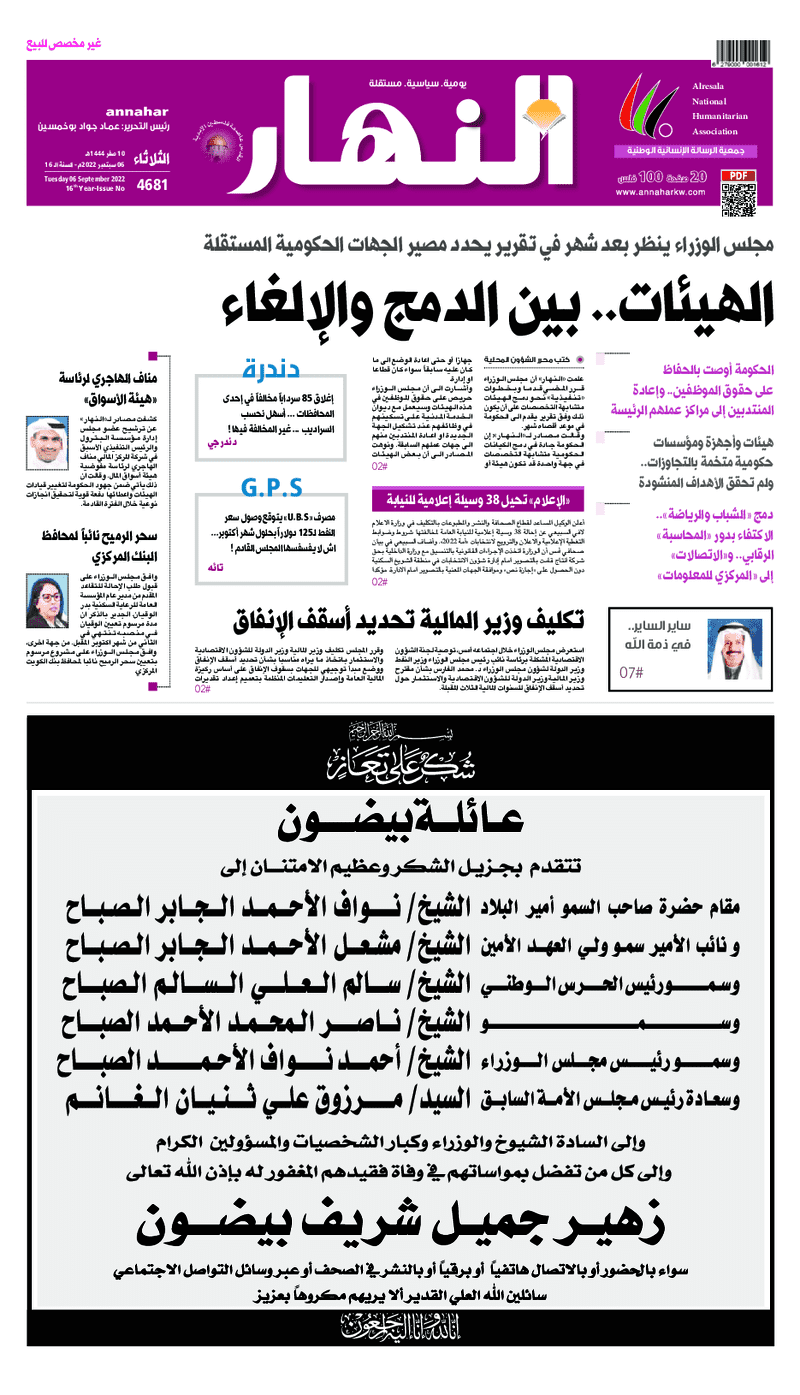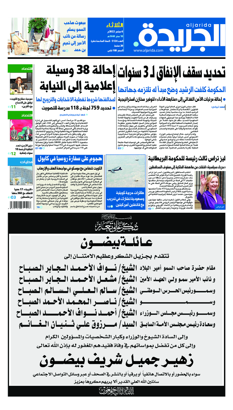 آخر الأخبار جرائم وقضايا “الجمارك” تضبط 29 ألف علبة مشروبات كحولية قادمة من دولة آسيوية في ميناء الشويخ 9 يونيو، 2024 محليات ممثلة عن دولة الكويت الطبيبة الكويتية أسماء الكندري تشارك في المؤتمر العالمي للمناظير في إيطاليا 8 يونيو، 2024 محليات “الصحة”: اكتمال وصول فريق الخدمات الطبية ببعثة الحج الكويتية لمكة المكرمة 8 يونيو، 2024 محليات “الصحة” تحدد 8 مراكز للصحة المدرسية لاستقبال الطلبة المبتعثين 8 يونيو، 2024 عربي وعالمي “الصحة العالمية”: تسجيل أول وفاة لشخص مصاب بـ«أنفلونزا الطيور» 7 يونيو، 2024 محليات عناوين الصحف الكويتية ليوم الثلاثاء 06 سبتمبر 2022 محرر المحليات6 سبتمبر، 2022أضف تعليق1 دقائق جريدة الجريدة جريدة الأنباء جريدة القبس جريدة السياسة جريدة الوطن جريدة النهار جريدة الصباح جريدة عرب تايمز الوسومTop عناوين الصحف المحلية من الممكن أن يعجبك جرائم وقضايا “الجمارك” تضبط 29 ألف علبة مشروبات كحولية قادمة من دولة آسيوية في ميناء الشويخ محليات ممثلة عن دولة الكويت الطبيبة الكويتية أسماء الكندري تشارك في المؤتمر العالمي للمناظير في إيطاليا محليات “الصحة”: اكتمال وصول فريق الخدمات الطبية ببعثة الحج الكويتية لمكة المكرمة محليات “الصحة” تحدد 8 مراكز للصحة المدرسية لاستقبال الطلبة المبتعثين عربي وعالمي “الصحة العالمية”: تسجيل أول وفاة لشخص مصاب بـ«أنفلونزا الطيور» تكنولوجيا رش السحب بملح البحر.. تجربة “ثورية” لتبريد كوكب الأرض أضف تعليق أضغط هنا لإضافة تعليق إلغاء الردالتعليقالاسم البريد الإلكتروني الموقع الإلكتروني Δ هذا الموقع يستخدم خدمة أكيسميت للتقليل من البريد المزعجة. اعرف المزيد عن كيفية التعامل مع بيانات التعليقات الخاصة بك processed.