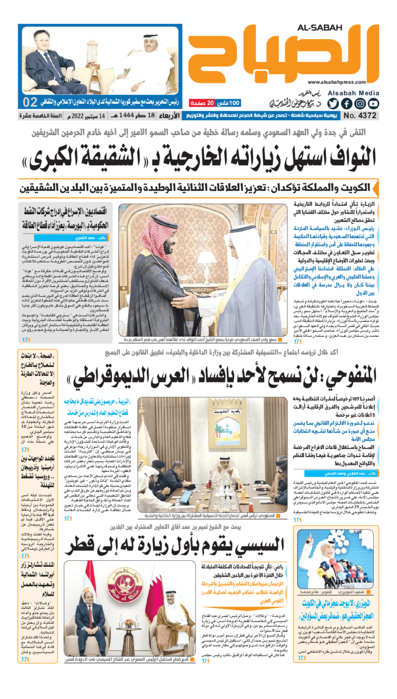آخر الأخبار جرائم وقضايا “الجمارك” تضبط 29 ألف علبة مشروبات كحولية قادمة من دولة آسيوية في ميناء الشويخ 9 يونيو، 2024 محليات ممثلة عن دولة الكويت الطبيبة الكويتية أسماء الكندري تشارك في المؤتمر العالمي للمناظير في إيطاليا 8 يونيو، 2024 محليات “الصحة”: اكتمال وصول فريق الخدمات الطبية ببعثة الحج الكويتية لمكة المكرمة 8 يونيو، 2024 محليات “الصحة” تحدد 8 مراكز للصحة المدرسية لاستقبال الطلبة المبتعثين 8 يونيو، 2024 عربي وعالمي “الصحة العالمية”: تسجيل أول وفاة لشخص مصاب بـ«أنفلونزا الطيور» 7 يونيو، 2024 محليات عناوين الصحف الكويتية ليوم الأربعاء 14 سبتمبر 2022 محرر المحليات14 سبتمبر، 2022أضف تعليق1 دقائق جريدة الجريدة جريدة الأنباء جريدة القبس جريدة السياسة جريدة الوطن جريدة النهار جريدة الصباح جريدة عرب تايمز الوسومTop عناوين الصحف المحلية من الممكن أن يعجبك جرائم وقضايا “الجمارك” تضبط 29 ألف علبة مشروبات كحولية قادمة من دولة آسيوية في ميناء الشويخ محليات ممثلة عن دولة الكويت الطبيبة الكويتية أسماء الكندري تشارك في المؤتمر العالمي للمناظير في إيطاليا محليات “الصحة”: اكتمال وصول فريق الخدمات الطبية ببعثة الحج الكويتية لمكة المكرمة محليات “الصحة” تحدد 8 مراكز للصحة المدرسية لاستقبال الطلبة المبتعثين عربي وعالمي “الصحة العالمية”: تسجيل أول وفاة لشخص مصاب بـ«أنفلونزا الطيور» تكنولوجيا رش السحب بملح البحر.. تجربة “ثورية” لتبريد كوكب الأرض أضف تعليق أضغط هنا لإضافة تعليق إلغاء الردالتعليقالاسم البريد الإلكتروني الموقع الإلكتروني Δ هذا الموقع يستخدم خدمة أكيسميت للتقليل من البريد المزعجة. اعرف المزيد عن كيفية التعامل مع بيانات التعليقات الخاصة بك processed.
