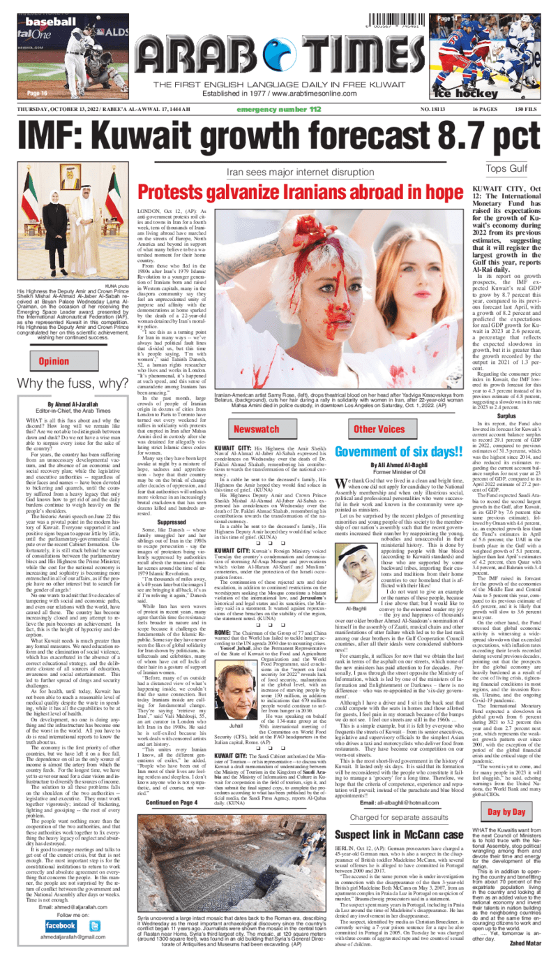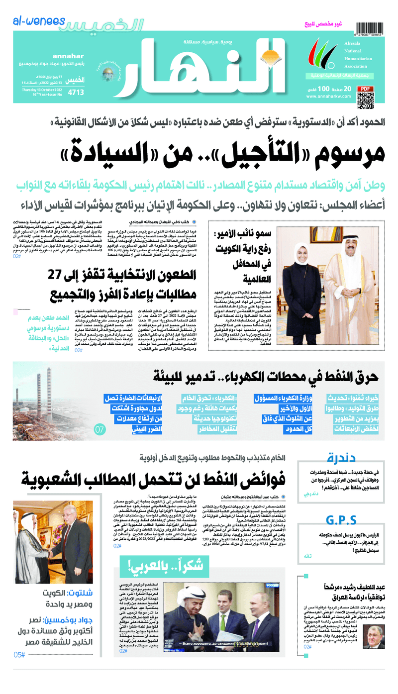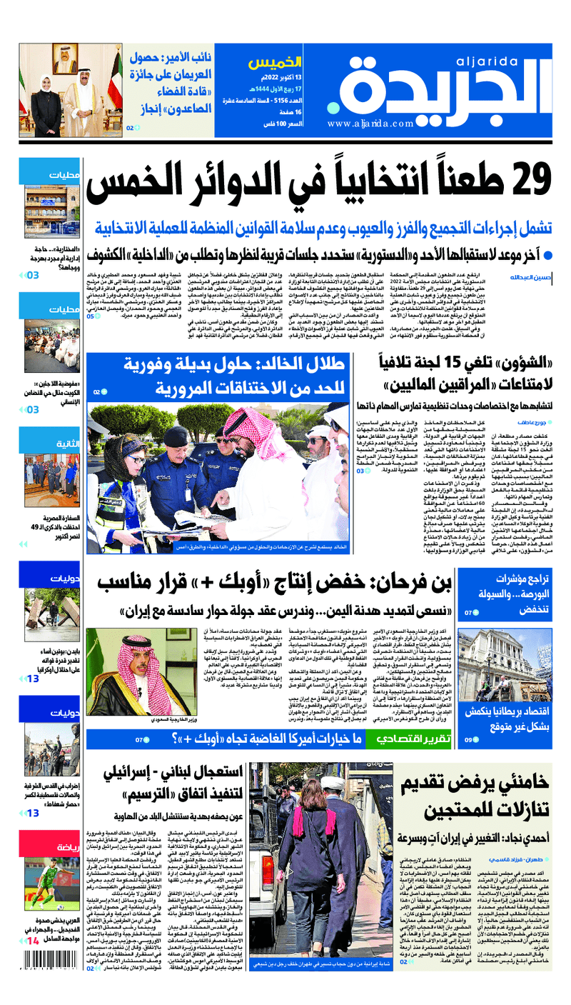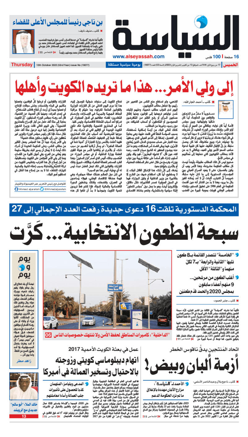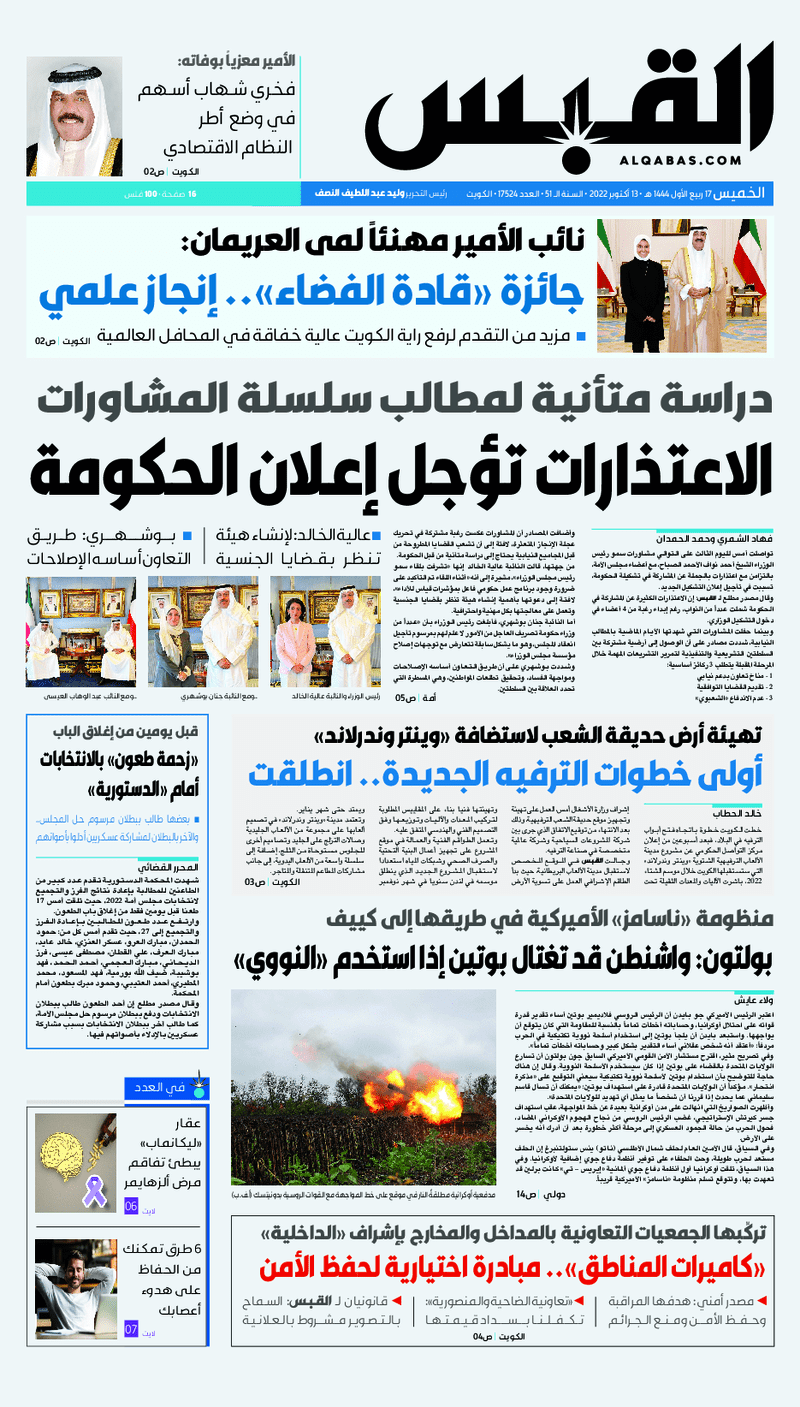 آخر الأخبار جرائم وقضايا “الجمارك” تضبط 29 ألف علبة مشروبات كحولية قادمة من دولة آسيوية في ميناء الشويخ 9 يونيو، 2024 محليات ممثلة عن دولة الكويت الطبيبة الكويتية أسماء الكندري تشارك في المؤتمر العالمي للمناظير في إيطاليا 8 يونيو، 2024 محليات “الصحة”: اكتمال وصول فريق الخدمات الطبية ببعثة الحج الكويتية لمكة المكرمة 8 يونيو، 2024 محليات “الصحة” تحدد 8 مراكز للصحة المدرسية لاستقبال الطلبة المبتعثين 8 يونيو، 2024 عربي وعالمي “الصحة العالمية”: تسجيل أول وفاة لشخص مصاب بـ«أنفلونزا الطيور» 7 يونيو، 2024 محليات عناوين الصحف الكويتية ليوم الخميس 13 أكتوبر 2022 محرر المحليات13 أكتوبر، 2022أضف تعليق1 دقائق جريدة الجريدة جريدة الأنباء جريدة القبس جريدة السياسة جريدة الوطن جريدة النهار جريدة الصباح جريدة عرب تايمز الوسومTop عناوين الصحف المحلية من الممكن أن يعجبك جرائم وقضايا “الجمارك” تضبط 29 ألف علبة مشروبات كحولية قادمة من دولة آسيوية في ميناء الشويخ محليات ممثلة عن دولة الكويت الطبيبة الكويتية أسماء الكندري تشارك في المؤتمر العالمي للمناظير في إيطاليا محليات “الصحة”: اكتمال وصول فريق الخدمات الطبية ببعثة الحج الكويتية لمكة المكرمة محليات “الصحة” تحدد 8 مراكز للصحة المدرسية لاستقبال الطلبة المبتعثين عربي وعالمي “الصحة العالمية”: تسجيل أول وفاة لشخص مصاب بـ«أنفلونزا الطيور» تكنولوجيا رش السحب بملح البحر.. تجربة “ثورية” لتبريد كوكب الأرض أضف تعليق أضغط هنا لإضافة تعليق إلغاء الردالتعليقالاسم البريد الإلكتروني الموقع الإلكتروني Δ هذا الموقع يستخدم خدمة أكيسميت للتقليل من البريد المزعجة. اعرف المزيد عن كيفية التعامل مع بيانات التعليقات الخاصة بك processed.