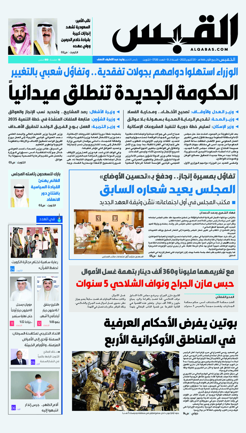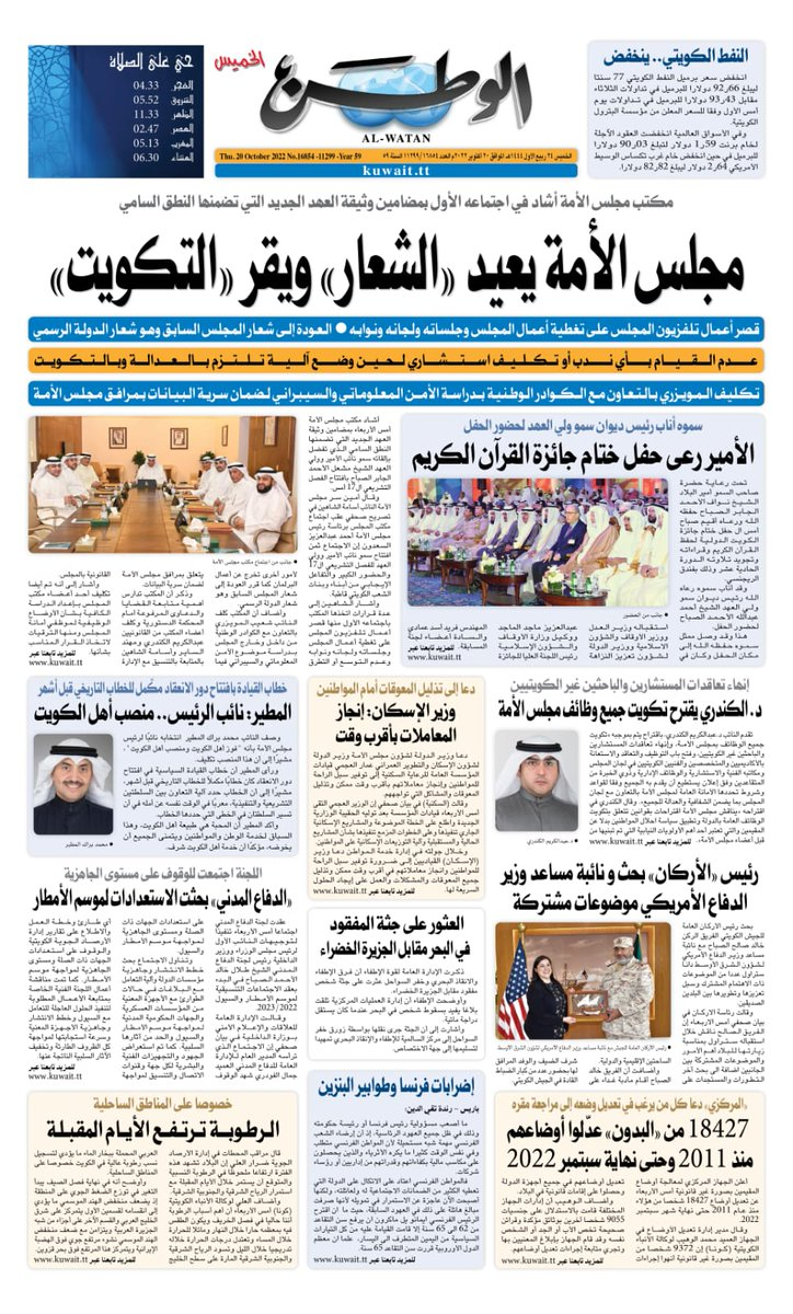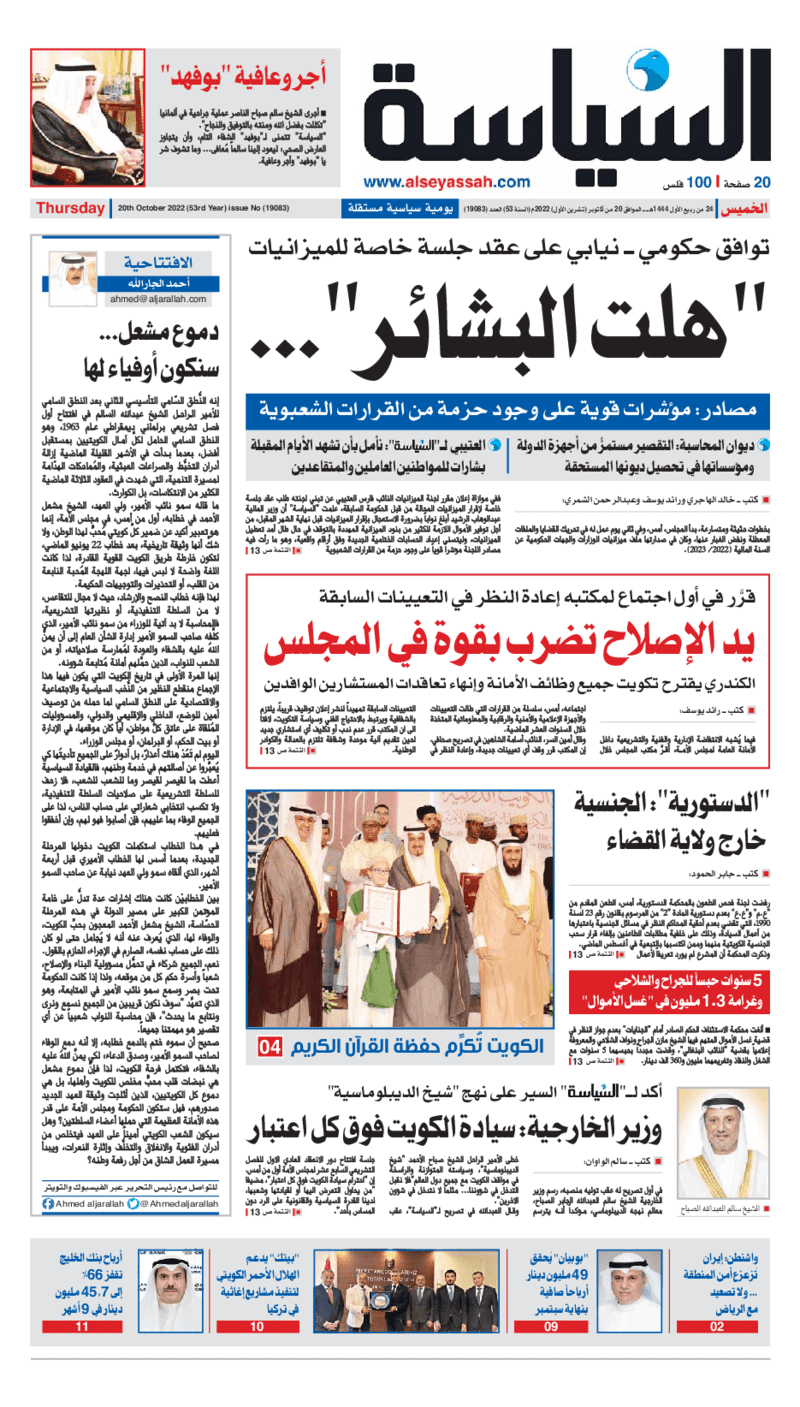 آخر الأخبار جرائم وقضايا “الجمارك” تضبط 29 ألف علبة مشروبات كحولية قادمة من دولة آسيوية في ميناء الشويخ 9 يونيو، 2024 محليات ممثلة عن دولة الكويت الطبيبة الكويتية أسماء الكندري تشارك في المؤتمر العالمي للمناظير في إيطاليا 8 يونيو، 2024 محليات “الصحة”: اكتمال وصول فريق الخدمات الطبية ببعثة الحج الكويتية لمكة المكرمة 8 يونيو، 2024 محليات “الصحة” تحدد 8 مراكز للصحة المدرسية لاستقبال الطلبة المبتعثين 8 يونيو، 2024 عربي وعالمي “الصحة العالمية”: تسجيل أول وفاة لشخص مصاب بـ«أنفلونزا الطيور» 7 يونيو، 2024 محليات عناوين الصحف الكويتية ليوم الخميس 20 أكتوبر 2022 محرر المحليات20 أكتوبر، 2022أضف تعليق1 دقائق جريدة الجريدة جريدة الأنباء جريدة القبس جريدة السياسة جريدة الوطن جريدة النهار جريدة الصباح جريدة عرب تايمز الوسومTop عناوين الصحف المحلية من الممكن أن يعجبك جرائم وقضايا “الجمارك” تضبط 29 ألف علبة مشروبات كحولية قادمة من دولة آسيوية في ميناء الشويخ محليات ممثلة عن دولة الكويت الطبيبة الكويتية أسماء الكندري تشارك في المؤتمر العالمي للمناظير في إيطاليا محليات “الصحة”: اكتمال وصول فريق الخدمات الطبية ببعثة الحج الكويتية لمكة المكرمة محليات “الصحة” تحدد 8 مراكز للصحة المدرسية لاستقبال الطلبة المبتعثين عربي وعالمي “الصحة العالمية”: تسجيل أول وفاة لشخص مصاب بـ«أنفلونزا الطيور» تكنولوجيا رش السحب بملح البحر.. تجربة “ثورية” لتبريد كوكب الأرض أضف تعليق أضغط هنا لإضافة تعليق إلغاء الردالتعليقالاسم البريد الإلكتروني الموقع الإلكتروني Δ هذا الموقع يستخدم خدمة أكيسميت للتقليل من البريد المزعجة. اعرف المزيد عن كيفية التعامل مع بيانات التعليقات الخاصة بك processed.