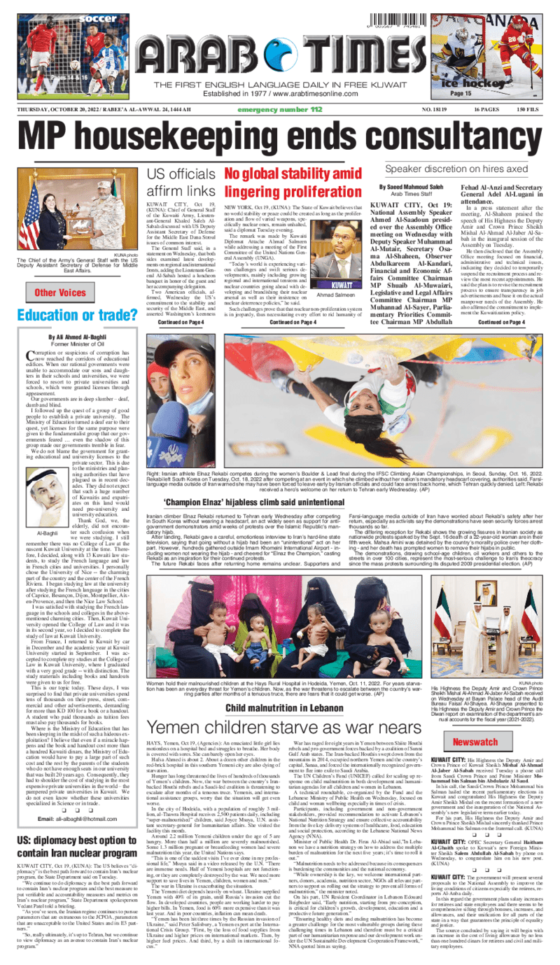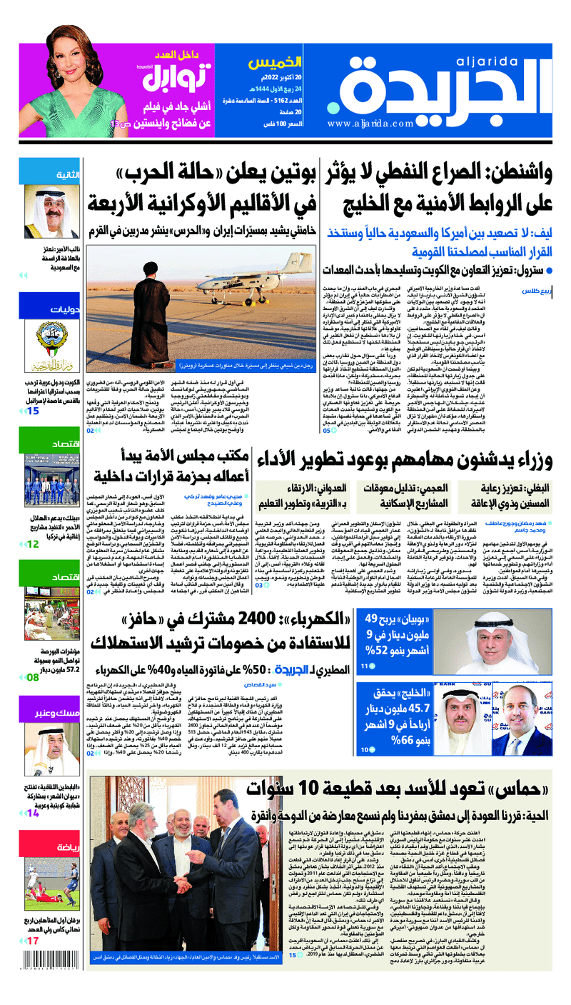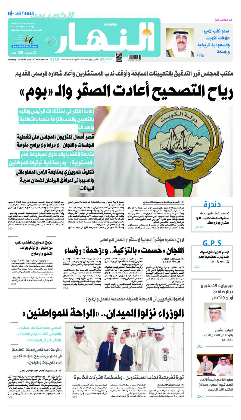 آخر الأخبار جرائم وقضايا “الجمارك” تضبط 29 ألف علبة مشروبات كحولية قادمة من دولة آسيوية في ميناء الشويخ 9 يونيو، 2024 محليات ممثلة عن دولة الكويت الطبيبة الكويتية أسماء الكندري تشارك في المؤتمر العالمي للمناظير في إيطاليا 8 يونيو، 2024 محليات “الصحة”: اكتمال وصول فريق الخدمات الطبية ببعثة الحج الكويتية لمكة المكرمة 8 يونيو، 2024 محليات “الصحة” تحدد 8 مراكز للصحة المدرسية لاستقبال الطلبة المبتعثين 8 يونيو، 2024 عربي وعالمي “الصحة العالمية”: تسجيل أول وفاة لشخص مصاب بـ«أنفلونزا الطيور» 7 يونيو، 2024 محليات عناوين الصحف الكويتية ليوم الخميس 20 أكتوبر 2022 محرر المحليات20 أكتوبر، 2022أضف تعليق1 دقائق جريدة الجريدة جريدة الأنباء جريدة القبس جريدة السياسة جريدة الوطن جريدة النهار جريدة الصباح جريدة عرب تايمز الوسومTop عناوين الصحف المحلية من الممكن أن يعجبك جرائم وقضايا “الجمارك” تضبط 29 ألف علبة مشروبات كحولية قادمة من دولة آسيوية في ميناء الشويخ محليات ممثلة عن دولة الكويت الطبيبة الكويتية أسماء الكندري تشارك في المؤتمر العالمي للمناظير في إيطاليا محليات “الصحة”: اكتمال وصول فريق الخدمات الطبية ببعثة الحج الكويتية لمكة المكرمة محليات “الصحة” تحدد 8 مراكز للصحة المدرسية لاستقبال الطلبة المبتعثين عربي وعالمي “الصحة العالمية”: تسجيل أول وفاة لشخص مصاب بـ«أنفلونزا الطيور» تكنولوجيا رش السحب بملح البحر.. تجربة “ثورية” لتبريد كوكب الأرض أضف تعليق أضغط هنا لإضافة تعليق إلغاء الردالتعليقالاسم البريد الإلكتروني الموقع الإلكتروني Δ هذا الموقع يستخدم خدمة أكيسميت للتقليل من البريد المزعجة. اعرف المزيد عن كيفية التعامل مع بيانات التعليقات الخاصة بك processed.