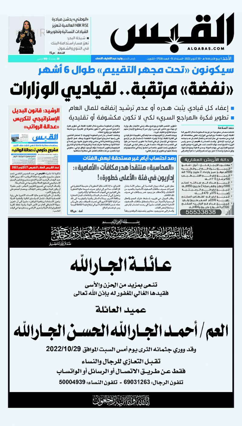 آخر الأخبار جرائم وقضايا “الجمارك” تضبط 29 ألف علبة مشروبات كحولية قادمة من دولة آسيوية في ميناء الشويخ 9 يونيو، 2024 محليات ممثلة عن دولة الكويت الطبيبة الكويتية أسماء الكندري تشارك في المؤتمر العالمي للمناظير في إيطاليا 8 يونيو، 2024 محليات “الصحة”: اكتمال وصول فريق الخدمات الطبية ببعثة الحج الكويتية لمكة المكرمة 8 يونيو، 2024 محليات “الصحة” تحدد 8 مراكز للصحة المدرسية لاستقبال الطلبة المبتعثين 8 يونيو، 2024 عربي وعالمي “الصحة العالمية”: تسجيل أول وفاة لشخص مصاب بـ«أنفلونزا الطيور» 7 يونيو، 2024 محليات عناوين الصحف الكويتية ليوم الأحد 30 أكتوبر 2022 محرر المحليات30 أكتوبر، 2022أضف تعليق1 دقائق جريدة الأنباء جريدة القبس جريدة السياسة جريدة الوطن جريدة النهار جريدة الصباح جريدة عرب تايمز الوسومTop عناوين الصحف المحلية من الممكن أن يعجبك جرائم وقضايا “الجمارك” تضبط 29 ألف علبة مشروبات كحولية قادمة من دولة آسيوية في ميناء الشويخ محليات ممثلة عن دولة الكويت الطبيبة الكويتية أسماء الكندري تشارك في المؤتمر العالمي للمناظير في إيطاليا محليات “الصحة”: اكتمال وصول فريق الخدمات الطبية ببعثة الحج الكويتية لمكة المكرمة محليات “الصحة” تحدد 8 مراكز للصحة المدرسية لاستقبال الطلبة المبتعثين عربي وعالمي “الصحة العالمية”: تسجيل أول وفاة لشخص مصاب بـ«أنفلونزا الطيور» تكنولوجيا رش السحب بملح البحر.. تجربة “ثورية” لتبريد كوكب الأرض أضف تعليق أضغط هنا لإضافة تعليق إلغاء الردالتعليقالاسم البريد الإلكتروني الموقع الإلكتروني Δ هذا الموقع يستخدم خدمة أكيسميت للتقليل من البريد المزعجة. اعرف المزيد عن كيفية التعامل مع بيانات التعليقات الخاصة بك processed.