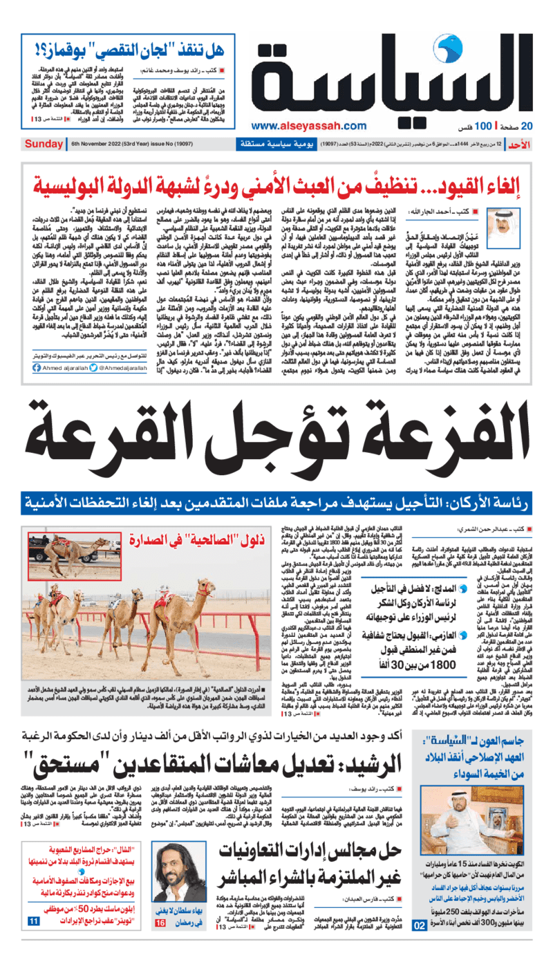 آخر الأخبار جرائم وقضايا “الجمارك” تضبط 29 ألف علبة مشروبات كحولية قادمة من دولة آسيوية في ميناء الشويخ 9 يونيو، 2024 محليات ممثلة عن دولة الكويت الطبيبة الكويتية أسماء الكندري تشارك في المؤتمر العالمي للمناظير في إيطاليا 8 يونيو، 2024 محليات “الصحة”: اكتمال وصول فريق الخدمات الطبية ببعثة الحج الكويتية لمكة المكرمة 8 يونيو، 2024 محليات “الصحة” تحدد 8 مراكز للصحة المدرسية لاستقبال الطلبة المبتعثين 8 يونيو، 2024 عربي وعالمي “الصحة العالمية”: تسجيل أول وفاة لشخص مصاب بـ«أنفلونزا الطيور» 7 يونيو، 2024 محليات عناوين الصحف الكويتية ليوم الأحد 06 نوفمبر 2022 محرر المحليات6 نوفمبر، 2022أضف تعليق1 دقائق جريدة الأنباء جريدة القبس جريدة السياسة جريدة الوطن جريدة النهار جريدة الصباح جريدة عرب تايمز الوسومTop عناوين الصحف المحلية من الممكن أن يعجبك جرائم وقضايا “الجمارك” تضبط 29 ألف علبة مشروبات كحولية قادمة من دولة آسيوية في ميناء الشويخ محليات ممثلة عن دولة الكويت الطبيبة الكويتية أسماء الكندري تشارك في المؤتمر العالمي للمناظير في إيطاليا محليات “الصحة”: اكتمال وصول فريق الخدمات الطبية ببعثة الحج الكويتية لمكة المكرمة محليات “الصحة” تحدد 8 مراكز للصحة المدرسية لاستقبال الطلبة المبتعثين عربي وعالمي “الصحة العالمية”: تسجيل أول وفاة لشخص مصاب بـ«أنفلونزا الطيور» تكنولوجيا رش السحب بملح البحر.. تجربة “ثورية” لتبريد كوكب الأرض أضف تعليق أضغط هنا لإضافة تعليق إلغاء الردالتعليقالاسم البريد الإلكتروني الموقع الإلكتروني Δ هذا الموقع يستخدم خدمة أكيسميت للتقليل من البريد المزعجة. اعرف المزيد عن كيفية التعامل مع بيانات التعليقات الخاصة بك processed.