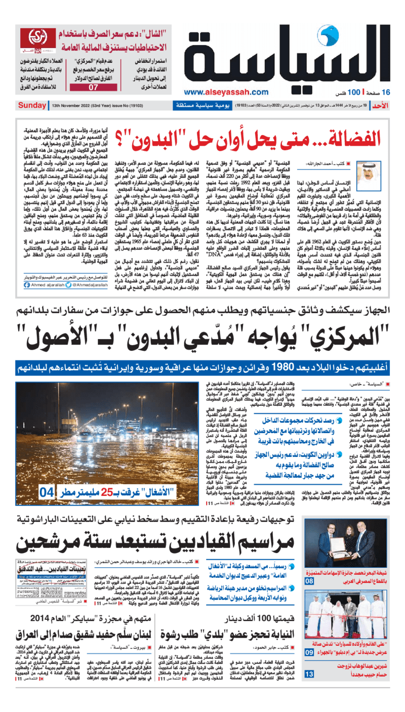 آخر الأخبار جرائم وقضايا “الجمارك” تضبط 29 ألف علبة مشروبات كحولية قادمة من دولة آسيوية في ميناء الشويخ 9 يونيو، 2024 محليات ممثلة عن دولة الكويت الطبيبة الكويتية أسماء الكندري تشارك في المؤتمر العالمي للمناظير في إيطاليا 8 يونيو، 2024 محليات “الصحة”: اكتمال وصول فريق الخدمات الطبية ببعثة الحج الكويتية لمكة المكرمة 8 يونيو، 2024 محليات “الصحة” تحدد 8 مراكز للصحة المدرسية لاستقبال الطلبة المبتعثين 8 يونيو، 2024 عربي وعالمي “الصحة العالمية”: تسجيل أول وفاة لشخص مصاب بـ«أنفلونزا الطيور» 7 يونيو، 2024 محليات عناوين الصحف الكويتية ليوم الأحد 13 نوفمبر 2022 محرر المحليات13 نوفمبر، 2022أضف تعليق1 دقائق جريدة الأنباء جريدة القبس جريدة السياسة جريدة الوطن جريدة النهار جريدة الصباح جريدة عرب تايمز الوسومTop عناوين الصحف المحلية من الممكن أن يعجبك جرائم وقضايا “الجمارك” تضبط 29 ألف علبة مشروبات كحولية قادمة من دولة آسيوية في ميناء الشويخ محليات ممثلة عن دولة الكويت الطبيبة الكويتية أسماء الكندري تشارك في المؤتمر العالمي للمناظير في إيطاليا محليات “الصحة”: اكتمال وصول فريق الخدمات الطبية ببعثة الحج الكويتية لمكة المكرمة محليات “الصحة” تحدد 8 مراكز للصحة المدرسية لاستقبال الطلبة المبتعثين عربي وعالمي “الصحة العالمية”: تسجيل أول وفاة لشخص مصاب بـ«أنفلونزا الطيور» تكنولوجيا رش السحب بملح البحر.. تجربة “ثورية” لتبريد كوكب الأرض أضف تعليق أضغط هنا لإضافة تعليق إلغاء الردالتعليقالاسم البريد الإلكتروني الموقع الإلكتروني Δ هذا الموقع يستخدم خدمة أكيسميت للتقليل من البريد المزعجة. اعرف المزيد عن كيفية التعامل مع بيانات التعليقات الخاصة بك processed.