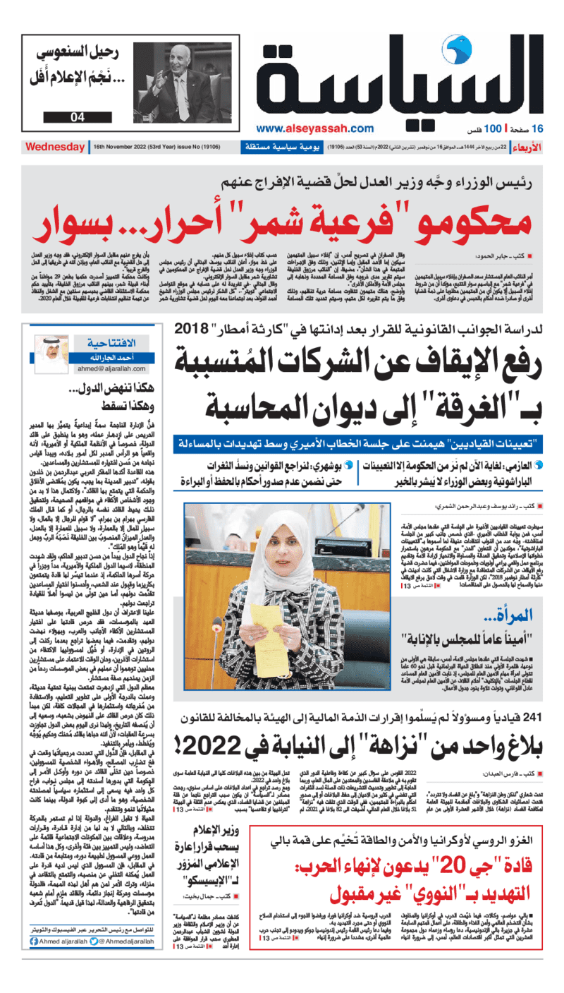 آخر الأخبار جرائم وقضايا “الجمارك” تضبط 29 ألف علبة مشروبات كحولية قادمة من دولة آسيوية في ميناء الشويخ 9 يونيو، 2024 محليات ممثلة عن دولة الكويت الطبيبة الكويتية أسماء الكندري تشارك في المؤتمر العالمي للمناظير في إيطاليا 8 يونيو، 2024 محليات “الصحة”: اكتمال وصول فريق الخدمات الطبية ببعثة الحج الكويتية لمكة المكرمة 8 يونيو، 2024 محليات “الصحة” تحدد 8 مراكز للصحة المدرسية لاستقبال الطلبة المبتعثين 8 يونيو، 2024 عربي وعالمي “الصحة العالمية”: تسجيل أول وفاة لشخص مصاب بـ«أنفلونزا الطيور» 7 يونيو، 2024 محليات عناوين الصحف الكويتية ليوم الأربعاء 16 نوفمبر 2022 محرر المحليات16 نوفمبر، 2022أضف تعليق1 دقائق جريدة الأنباء جريدة القبس جريدة السياسة جريدة الوطن جريدة النهار جريدة الصباح الوسومTop عناوين الصحف المحلية من الممكن أن يعجبك جرائم وقضايا “الجمارك” تضبط 29 ألف علبة مشروبات كحولية قادمة من دولة آسيوية في ميناء الشويخ محليات ممثلة عن دولة الكويت الطبيبة الكويتية أسماء الكندري تشارك في المؤتمر العالمي للمناظير في إيطاليا محليات “الصحة”: اكتمال وصول فريق الخدمات الطبية ببعثة الحج الكويتية لمكة المكرمة محليات “الصحة” تحدد 8 مراكز للصحة المدرسية لاستقبال الطلبة المبتعثين عربي وعالمي “الصحة العالمية”: تسجيل أول وفاة لشخص مصاب بـ«أنفلونزا الطيور» تكنولوجيا رش السحب بملح البحر.. تجربة “ثورية” لتبريد كوكب الأرض أضف تعليق أضغط هنا لإضافة تعليق إلغاء الردالتعليقالاسم البريد الإلكتروني الموقع الإلكتروني Δ هذا الموقع يستخدم خدمة أكيسميت للتقليل من البريد المزعجة. اعرف المزيد عن كيفية التعامل مع بيانات التعليقات الخاصة بك processed.