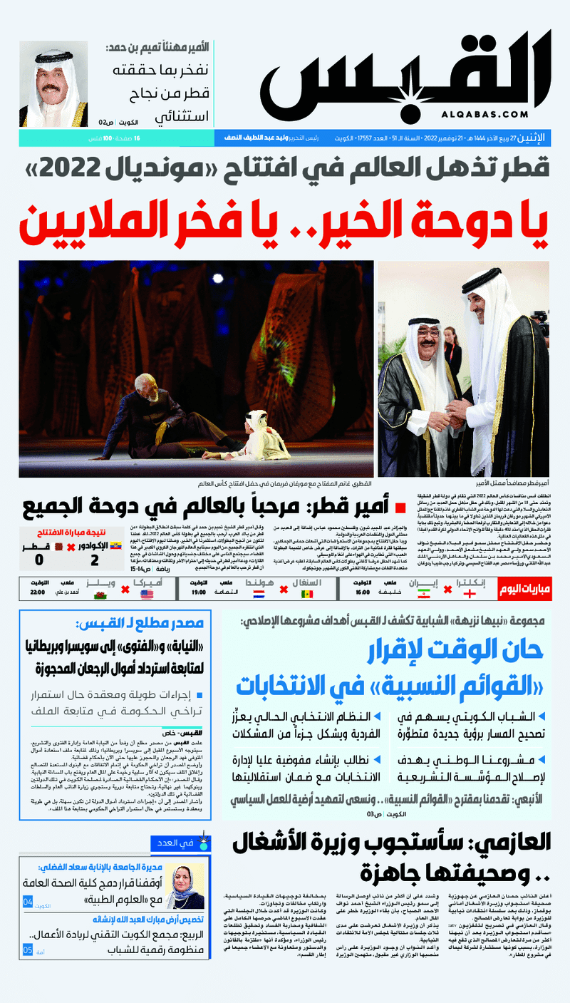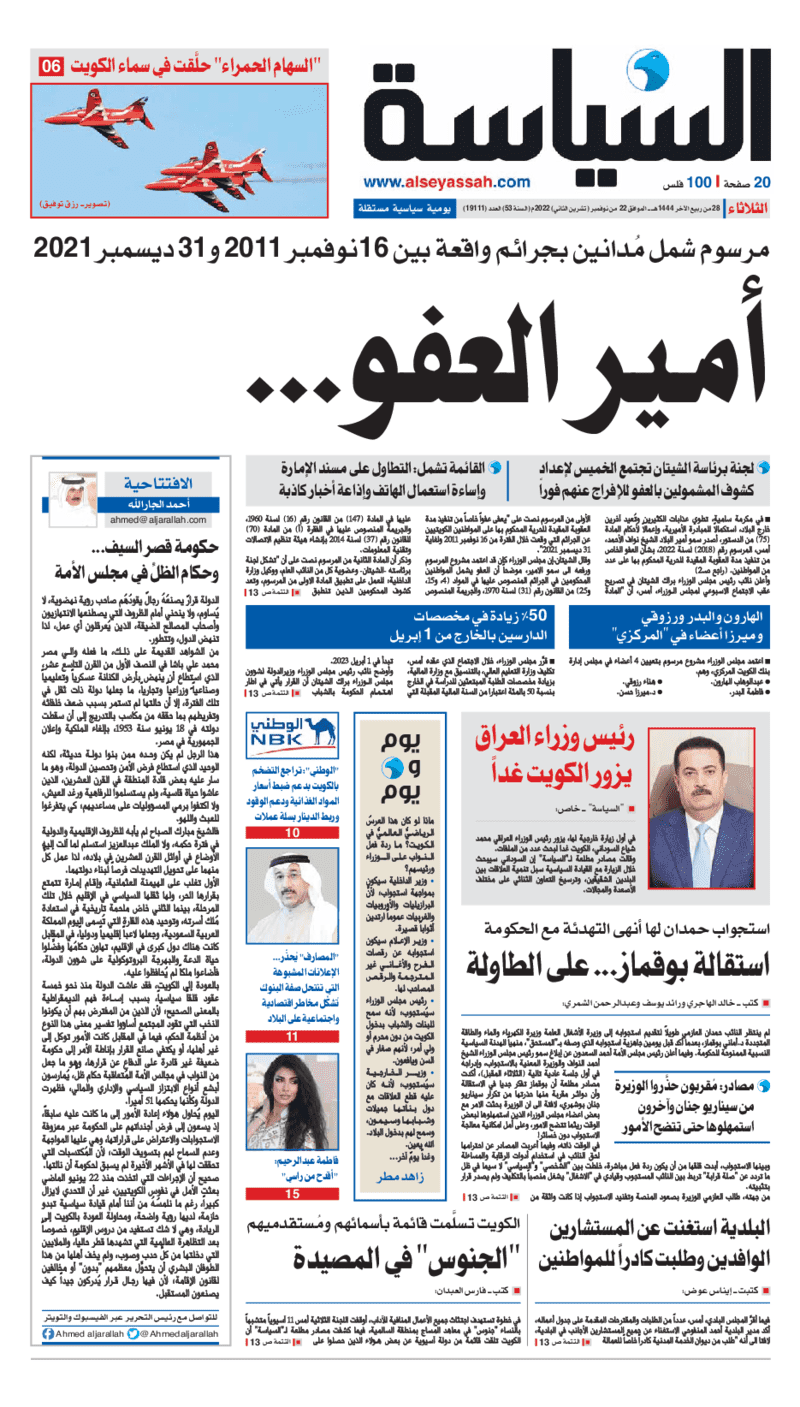 آخر الأخبار جرائم وقضايا “الجمارك” تضبط 29 ألف علبة مشروبات كحولية قادمة من دولة آسيوية في ميناء الشويخ 9 يونيو، 2024 محليات ممثلة عن دولة الكويت الطبيبة الكويتية أسماء الكندري تشارك في المؤتمر العالمي للمناظير في إيطاليا 8 يونيو، 2024 محليات “الصحة”: اكتمال وصول فريق الخدمات الطبية ببعثة الحج الكويتية لمكة المكرمة 8 يونيو، 2024 محليات “الصحة” تحدد 8 مراكز للصحة المدرسية لاستقبال الطلبة المبتعثين 8 يونيو، 2024 عربي وعالمي “الصحة العالمية”: تسجيل أول وفاة لشخص مصاب بـ«أنفلونزا الطيور» 7 يونيو، 2024 محليات عناوين الصحف الكويتية ليوم الثلاثاء 22 نوفمبر 2022 محرر المحليات22 نوفمبر، 2022أضف تعليق1 دقائق جريدة الأنباء جريدة القبس جريدة السياسة جريدة الوطن جريدة النهار جريدة الصباح الوسومTop عناوين الصحف المحلية من الممكن أن يعجبك جرائم وقضايا “الجمارك” تضبط 29 ألف علبة مشروبات كحولية قادمة من دولة آسيوية في ميناء الشويخ محليات ممثلة عن دولة الكويت الطبيبة الكويتية أسماء الكندري تشارك في المؤتمر العالمي للمناظير في إيطاليا محليات “الصحة”: اكتمال وصول فريق الخدمات الطبية ببعثة الحج الكويتية لمكة المكرمة محليات “الصحة” تحدد 8 مراكز للصحة المدرسية لاستقبال الطلبة المبتعثين عربي وعالمي “الصحة العالمية”: تسجيل أول وفاة لشخص مصاب بـ«أنفلونزا الطيور» تكنولوجيا رش السحب بملح البحر.. تجربة “ثورية” لتبريد كوكب الأرض أضف تعليق أضغط هنا لإضافة تعليق إلغاء الردالتعليقالاسم البريد الإلكتروني الموقع الإلكتروني Δ هذا الموقع يستخدم خدمة أكيسميت للتقليل من البريد المزعجة. اعرف المزيد عن كيفية التعامل مع بيانات التعليقات الخاصة بك processed.