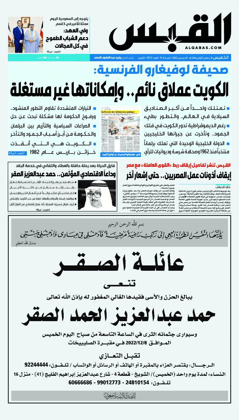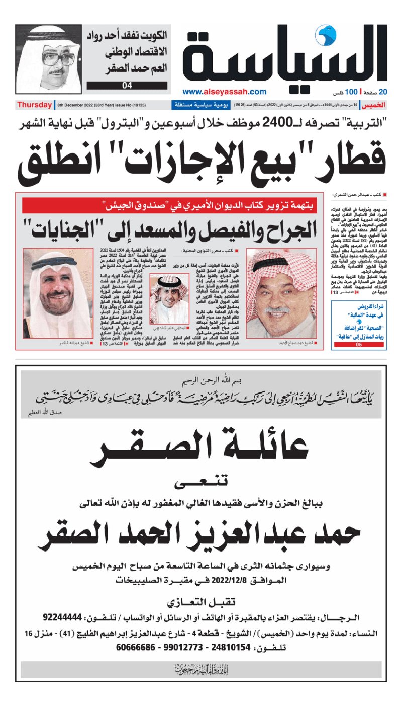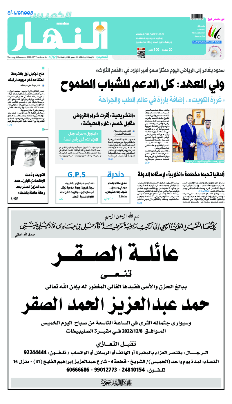 آخر الأخبار جرائم وقضايا “الجمارك” تضبط 29 ألف علبة مشروبات كحولية قادمة من دولة آسيوية في ميناء الشويخ 9 يونيو، 2024 محليات ممثلة عن دولة الكويت الطبيبة الكويتية أسماء الكندري تشارك في المؤتمر العالمي للمناظير في إيطاليا 8 يونيو، 2024 محليات “الصحة”: اكتمال وصول فريق الخدمات الطبية ببعثة الحج الكويتية لمكة المكرمة 8 يونيو، 2024 محليات “الصحة” تحدد 8 مراكز للصحة المدرسية لاستقبال الطلبة المبتعثين 8 يونيو، 2024 عربي وعالمي “الصحة العالمية”: تسجيل أول وفاة لشخص مصاب بـ«أنفلونزا الطيور» 7 يونيو، 2024 محليات عناوين الصحف الكويتية ليوم الخميس 08 ديسمبر 2022 محرر المحليات8 ديسمبر، 2022أضف تعليق1 دقائق جريدة الأنباء جريدة القبس جريدة السياسة جريدة الوطن جريدة النهار جريدة الصباح الوسومTop عناوين الصحف المحلية من الممكن أن يعجبك جرائم وقضايا “الجمارك” تضبط 29 ألف علبة مشروبات كحولية قادمة من دولة آسيوية في ميناء الشويخ محليات ممثلة عن دولة الكويت الطبيبة الكويتية أسماء الكندري تشارك في المؤتمر العالمي للمناظير في إيطاليا محليات “الصحة”: اكتمال وصول فريق الخدمات الطبية ببعثة الحج الكويتية لمكة المكرمة محليات “الصحة” تحدد 8 مراكز للصحة المدرسية لاستقبال الطلبة المبتعثين عربي وعالمي “الصحة العالمية”: تسجيل أول وفاة لشخص مصاب بـ«أنفلونزا الطيور» تكنولوجيا رش السحب بملح البحر.. تجربة “ثورية” لتبريد كوكب الأرض أضف تعليق أضغط هنا لإضافة تعليق إلغاء الردالتعليقالاسم البريد الإلكتروني الموقع الإلكتروني Δ هذا الموقع يستخدم خدمة أكيسميت للتقليل من البريد المزعجة. اعرف المزيد عن كيفية التعامل مع بيانات التعليقات الخاصة بك processed.
