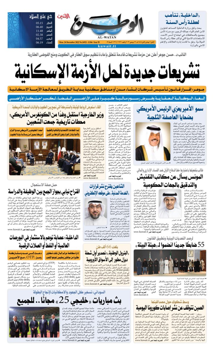 آخر الأخبار جرائم وقضايا “الجمارك” تضبط 29 ألف علبة مشروبات كحولية قادمة من دولة آسيوية في ميناء الشويخ 9 يونيو، 2024 محليات ممثلة عن دولة الكويت الطبيبة الكويتية أسماء الكندري تشارك في المؤتمر العالمي للمناظير في إيطاليا 8 يونيو، 2024 محليات “الصحة”: اكتمال وصول فريق الخدمات الطبية ببعثة الحج الكويتية لمكة المكرمة 8 يونيو، 2024 محليات “الصحة” تحدد 8 مراكز للصحة المدرسية لاستقبال الطلبة المبتعثين 8 يونيو، 2024 عربي وعالمي “الصحة العالمية”: تسجيل أول وفاة لشخص مصاب بـ«أنفلونزا الطيور» 7 يونيو، 2024 محليات عناوين الصحف الكويتية ليوم الاثنين 26 ديسمبر 2022 محرر المحليات26 ديسمبر، 2022أضف تعليق1 دقائق جريدة الأنباء جريدة القبس جريدة السياسة جريدة الوطن جريدة النهار جريدة الصباح الوسومTop عناوين الصحف المحلية من الممكن أن يعجبك جرائم وقضايا “الجمارك” تضبط 29 ألف علبة مشروبات كحولية قادمة من دولة آسيوية في ميناء الشويخ محليات ممثلة عن دولة الكويت الطبيبة الكويتية أسماء الكندري تشارك في المؤتمر العالمي للمناظير في إيطاليا محليات “الصحة”: اكتمال وصول فريق الخدمات الطبية ببعثة الحج الكويتية لمكة المكرمة محليات “الصحة” تحدد 8 مراكز للصحة المدرسية لاستقبال الطلبة المبتعثين عربي وعالمي “الصحة العالمية”: تسجيل أول وفاة لشخص مصاب بـ«أنفلونزا الطيور» تكنولوجيا رش السحب بملح البحر.. تجربة “ثورية” لتبريد كوكب الأرض أضف تعليق أضغط هنا لإضافة تعليق إلغاء الردالتعليقالاسم البريد الإلكتروني الموقع الإلكتروني Δ هذا الموقع يستخدم خدمة أكيسميت للتقليل من البريد المزعجة. اعرف المزيد عن كيفية التعامل مع بيانات التعليقات الخاصة بك processed.