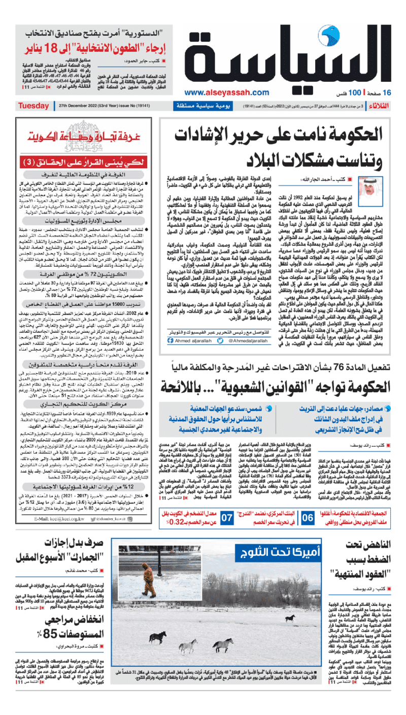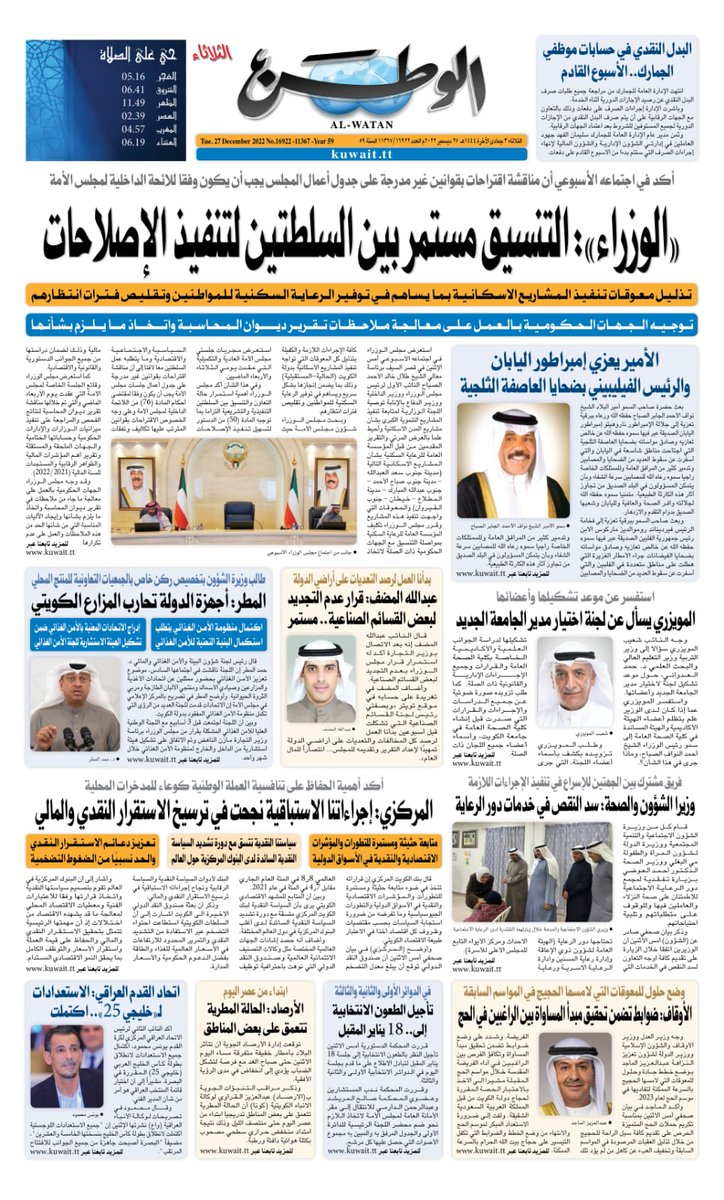 آخر الأخبار جرائم وقضايا “الجمارك” تضبط 29 ألف علبة مشروبات كحولية قادمة من دولة آسيوية في ميناء الشويخ 9 يونيو، 2024 محليات ممثلة عن دولة الكويت الطبيبة الكويتية أسماء الكندري تشارك في المؤتمر العالمي للمناظير في إيطاليا 8 يونيو، 2024 محليات “الصحة”: اكتمال وصول فريق الخدمات الطبية ببعثة الحج الكويتية لمكة المكرمة 8 يونيو، 2024 محليات “الصحة” تحدد 8 مراكز للصحة المدرسية لاستقبال الطلبة المبتعثين 8 يونيو، 2024 عربي وعالمي “الصحة العالمية”: تسجيل أول وفاة لشخص مصاب بـ«أنفلونزا الطيور» 7 يونيو، 2024 محليات عناوين الصحف الكويتية ليوم الثلاثاء 27 ديسمبر 2022 محرر المحليات27 ديسمبر، 2022أضف تعليق1 دقائق جريدة الأنباء جريدة القبس جريدة السياسة جريدة الوطن جريدة النهار جريدة الصباح الوسومTop عناوين الصحف المحلية من الممكن أن يعجبك جرائم وقضايا “الجمارك” تضبط 29 ألف علبة مشروبات كحولية قادمة من دولة آسيوية في ميناء الشويخ محليات ممثلة عن دولة الكويت الطبيبة الكويتية أسماء الكندري تشارك في المؤتمر العالمي للمناظير في إيطاليا محليات “الصحة”: اكتمال وصول فريق الخدمات الطبية ببعثة الحج الكويتية لمكة المكرمة محليات “الصحة” تحدد 8 مراكز للصحة المدرسية لاستقبال الطلبة المبتعثين عربي وعالمي “الصحة العالمية”: تسجيل أول وفاة لشخص مصاب بـ«أنفلونزا الطيور» تكنولوجيا رش السحب بملح البحر.. تجربة “ثورية” لتبريد كوكب الأرض أضف تعليق أضغط هنا لإضافة تعليق إلغاء الردالتعليقالاسم البريد الإلكتروني الموقع الإلكتروني Δ هذا الموقع يستخدم خدمة أكيسميت للتقليل من البريد المزعجة. اعرف المزيد عن كيفية التعامل مع بيانات التعليقات الخاصة بك processed.