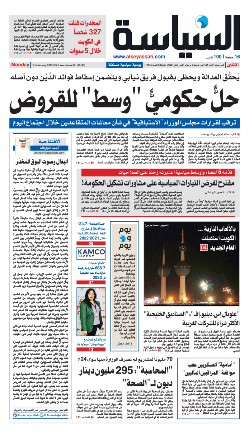 آخر الأخبار جرائم وقضايا “الجمارك” تضبط 29 ألف علبة مشروبات كحولية قادمة من دولة آسيوية في ميناء الشويخ 9 يونيو، 2024 محليات ممثلة عن دولة الكويت الطبيبة الكويتية أسماء الكندري تشارك في المؤتمر العالمي للمناظير في إيطاليا 8 يونيو، 2024 محليات “الصحة”: اكتمال وصول فريق الخدمات الطبية ببعثة الحج الكويتية لمكة المكرمة 8 يونيو، 2024 محليات “الصحة” تحدد 8 مراكز للصحة المدرسية لاستقبال الطلبة المبتعثين 8 يونيو، 2024 عربي وعالمي “الصحة العالمية”: تسجيل أول وفاة لشخص مصاب بـ«أنفلونزا الطيور» 7 يونيو، 2024 محليات عناوين الصحف الكويتية ليوم الاثنين 02 يناير 2023 محرر المحليات2 يناير، 2023أضف تعليق1 دقائق جريدة الأنباء جريدة القبس جريدة السياسة جريدة الوطن جريدة النهار جريدة الصباح الوسومTop عناوين الصحف المحلية من الممكن أن يعجبك جرائم وقضايا “الجمارك” تضبط 29 ألف علبة مشروبات كحولية قادمة من دولة آسيوية في ميناء الشويخ محليات ممثلة عن دولة الكويت الطبيبة الكويتية أسماء الكندري تشارك في المؤتمر العالمي للمناظير في إيطاليا محليات “الصحة”: اكتمال وصول فريق الخدمات الطبية ببعثة الحج الكويتية لمكة المكرمة محليات “الصحة” تحدد 8 مراكز للصحة المدرسية لاستقبال الطلبة المبتعثين عربي وعالمي “الصحة العالمية”: تسجيل أول وفاة لشخص مصاب بـ«أنفلونزا الطيور» تكنولوجيا رش السحب بملح البحر.. تجربة “ثورية” لتبريد كوكب الأرض أضف تعليق أضغط هنا لإضافة تعليق إلغاء الردالتعليقالاسم البريد الإلكتروني الموقع الإلكتروني Δ هذا الموقع يستخدم خدمة أكيسميت للتقليل من البريد المزعجة. اعرف المزيد عن كيفية التعامل مع بيانات التعليقات الخاصة بك processed.