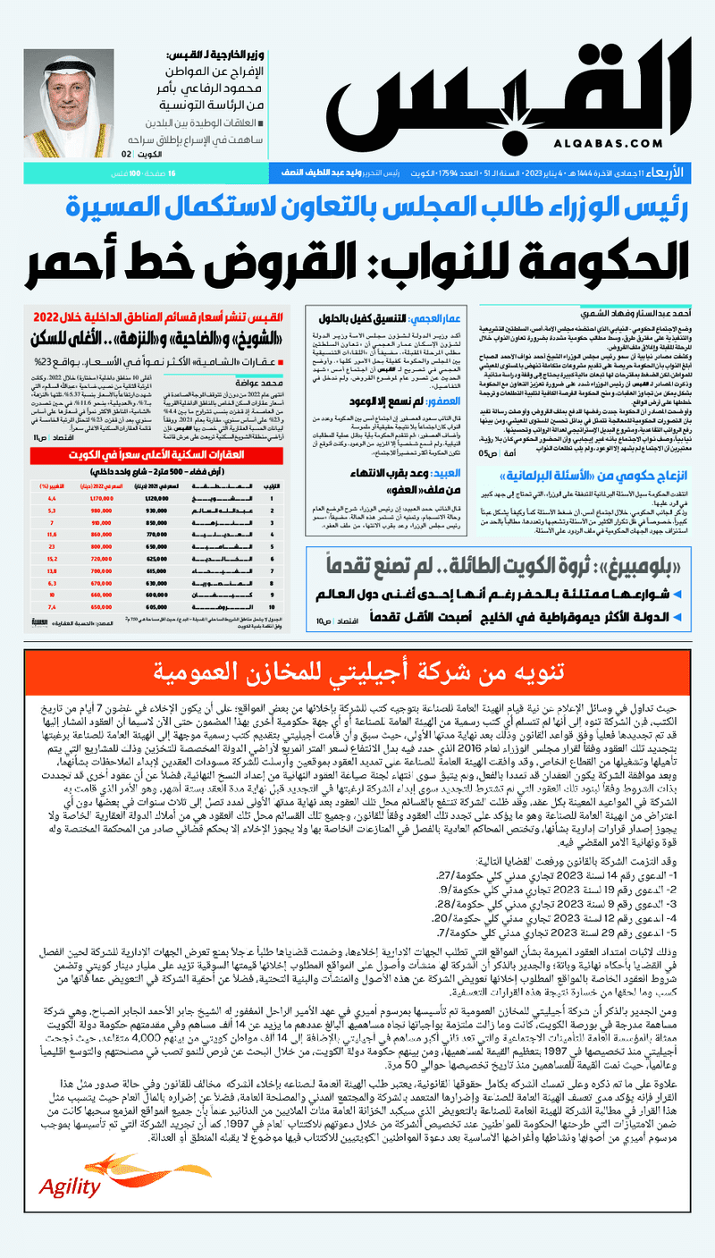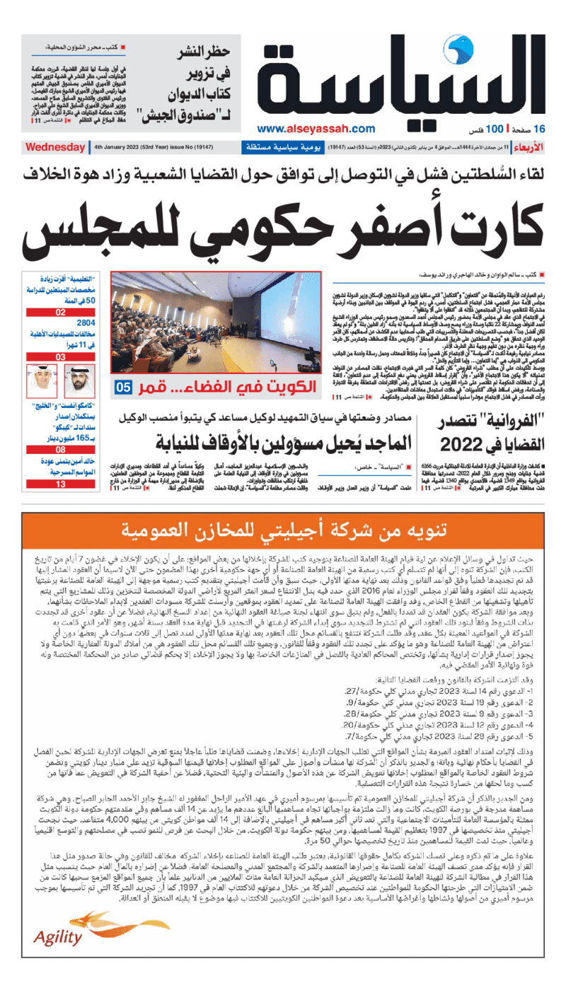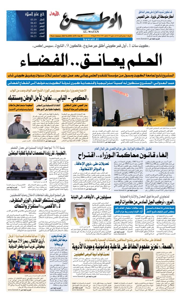 آخر الأخبار جرائم وقضايا “الجمارك” تضبط 29 ألف علبة مشروبات كحولية قادمة من دولة آسيوية في ميناء الشويخ 9 يونيو، 2024 محليات ممثلة عن دولة الكويت الطبيبة الكويتية أسماء الكندري تشارك في المؤتمر العالمي للمناظير في إيطاليا 8 يونيو، 2024 محليات “الصحة”: اكتمال وصول فريق الخدمات الطبية ببعثة الحج الكويتية لمكة المكرمة 8 يونيو، 2024 محليات “الصحة” تحدد 8 مراكز للصحة المدرسية لاستقبال الطلبة المبتعثين 8 يونيو، 2024 عربي وعالمي “الصحة العالمية”: تسجيل أول وفاة لشخص مصاب بـ«أنفلونزا الطيور» 7 يونيو، 2024 محليات عناوين الصحف الكويتية ليوم الأربعاء 04 يناير 2023 محرر المحليات4 يناير، 2023أضف تعليق1 دقائق جريدة الأنباء جريدة القبس جريدة السياسة جريدة الوطن جريدة النهار جريدة الصباح الوسومTop عناوين الصحف المحلية من الممكن أن يعجبك جرائم وقضايا “الجمارك” تضبط 29 ألف علبة مشروبات كحولية قادمة من دولة آسيوية في ميناء الشويخ محليات ممثلة عن دولة الكويت الطبيبة الكويتية أسماء الكندري تشارك في المؤتمر العالمي للمناظير في إيطاليا محليات “الصحة”: اكتمال وصول فريق الخدمات الطبية ببعثة الحج الكويتية لمكة المكرمة محليات “الصحة” تحدد 8 مراكز للصحة المدرسية لاستقبال الطلبة المبتعثين عربي وعالمي “الصحة العالمية”: تسجيل أول وفاة لشخص مصاب بـ«أنفلونزا الطيور» تكنولوجيا رش السحب بملح البحر.. تجربة “ثورية” لتبريد كوكب الأرض أضف تعليق أضغط هنا لإضافة تعليق إلغاء الردالتعليقالاسم البريد الإلكتروني الموقع الإلكتروني Δ هذا الموقع يستخدم خدمة أكيسميت للتقليل من البريد المزعجة. اعرف المزيد عن كيفية التعامل مع بيانات التعليقات الخاصة بك processed.