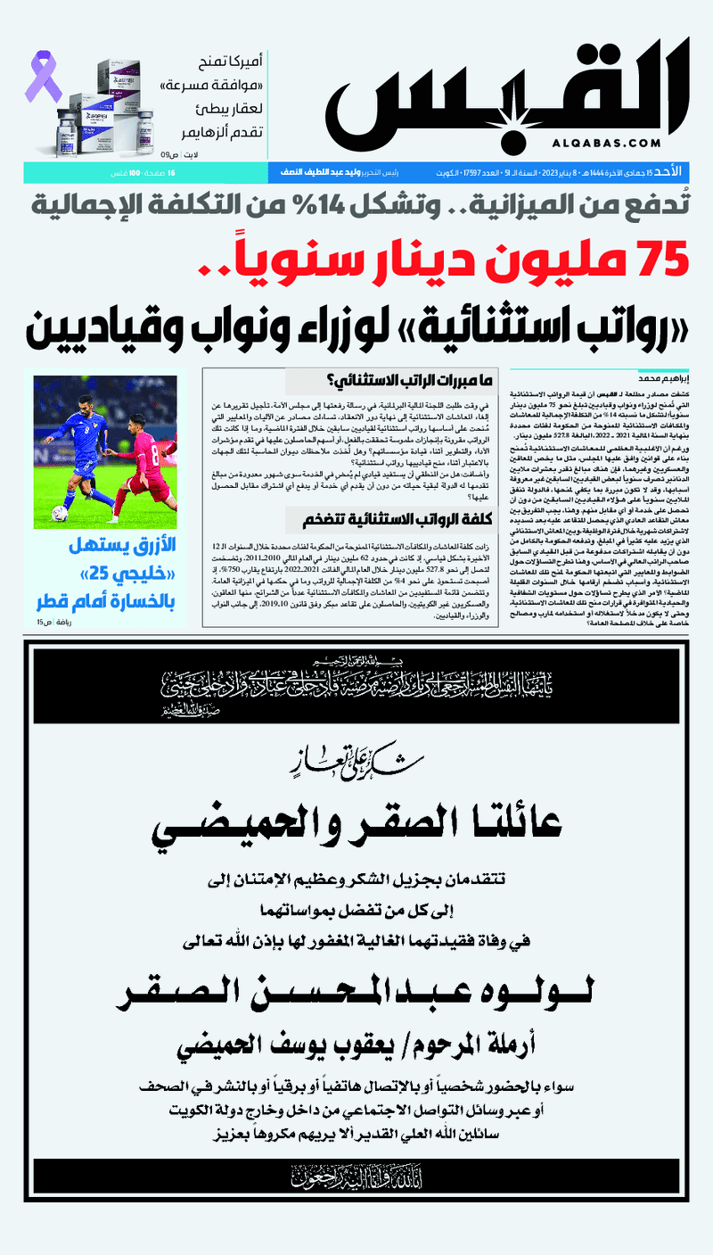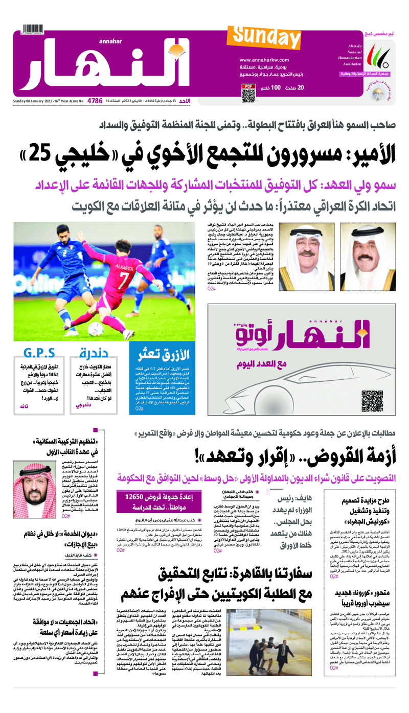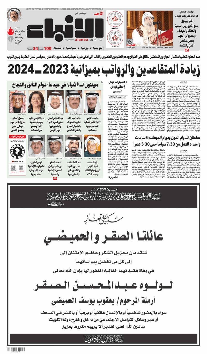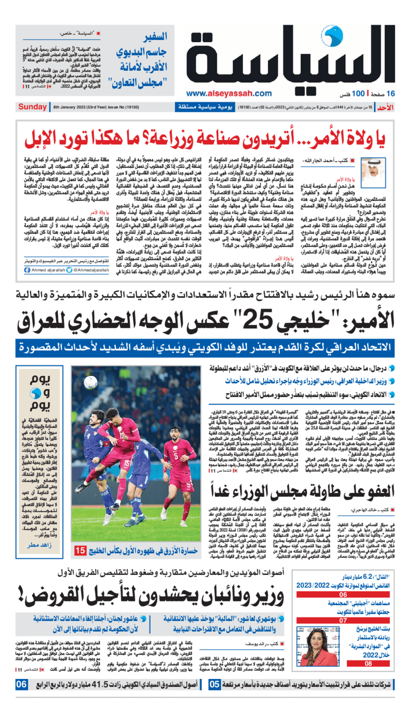 آخر الأخبار جرائم وقضايا “الجمارك” تضبط 29 ألف علبة مشروبات كحولية قادمة من دولة آسيوية في ميناء الشويخ 9 يونيو، 2024 محليات ممثلة عن دولة الكويت الطبيبة الكويتية أسماء الكندري تشارك في المؤتمر العالمي للمناظير في إيطاليا 8 يونيو، 2024 محليات “الصحة”: اكتمال وصول فريق الخدمات الطبية ببعثة الحج الكويتية لمكة المكرمة 8 يونيو، 2024 محليات “الصحة” تحدد 8 مراكز للصحة المدرسية لاستقبال الطلبة المبتعثين 8 يونيو، 2024 عربي وعالمي “الصحة العالمية”: تسجيل أول وفاة لشخص مصاب بـ«أنفلونزا الطيور» 7 يونيو، 2024 محليات عناوين الصحف الكويتية ليوم الأحد 08 يناير 2023 محرر المحليات8 يناير، 2023أضف تعليق1 دقائق جريدة الأنباء جريدة القبس جريدة السياسة جريدة الوطن جريدة النهار جريدة الصباح الوسومTop عناوين الصحف المحلية من الممكن أن يعجبك جرائم وقضايا “الجمارك” تضبط 29 ألف علبة مشروبات كحولية قادمة من دولة آسيوية في ميناء الشويخ محليات ممثلة عن دولة الكويت الطبيبة الكويتية أسماء الكندري تشارك في المؤتمر العالمي للمناظير في إيطاليا محليات “الصحة”: اكتمال وصول فريق الخدمات الطبية ببعثة الحج الكويتية لمكة المكرمة محليات “الصحة” تحدد 8 مراكز للصحة المدرسية لاستقبال الطلبة المبتعثين عربي وعالمي “الصحة العالمية”: تسجيل أول وفاة لشخص مصاب بـ«أنفلونزا الطيور» تكنولوجيا رش السحب بملح البحر.. تجربة “ثورية” لتبريد كوكب الأرض أضف تعليق أضغط هنا لإضافة تعليق إلغاء الردالتعليقالاسم البريد الإلكتروني الموقع الإلكتروني Δ هذا الموقع يستخدم خدمة أكيسميت للتقليل من البريد المزعجة. اعرف المزيد عن كيفية التعامل مع بيانات التعليقات الخاصة بك processed.