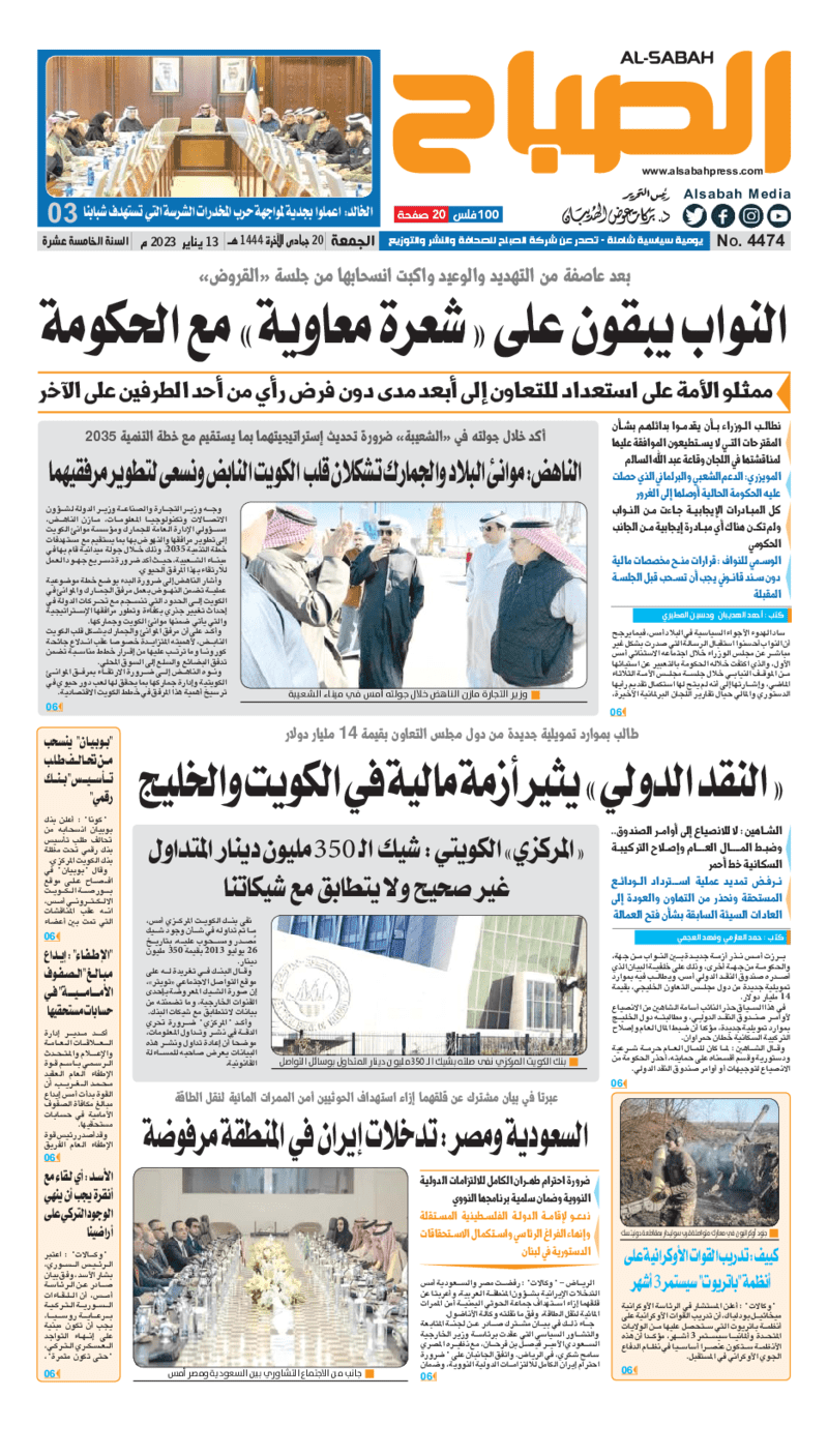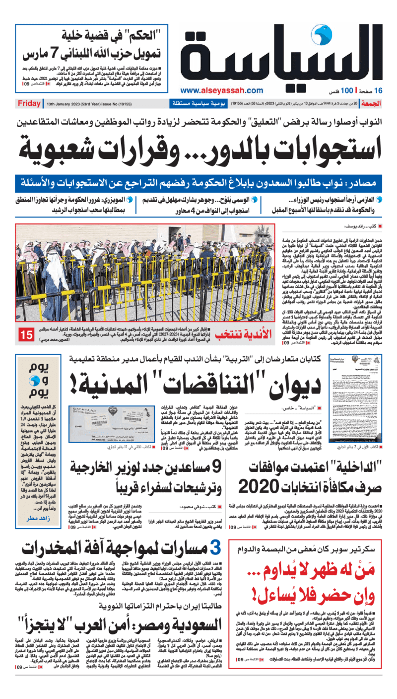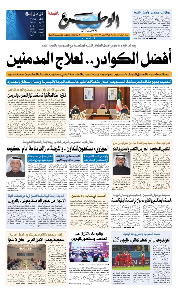 آخر الأخبار جرائم وقضايا “الجمارك” تضبط 29 ألف علبة مشروبات كحولية قادمة من دولة آسيوية في ميناء الشويخ 9 يونيو، 2024 محليات ممثلة عن دولة الكويت الطبيبة الكويتية أسماء الكندري تشارك في المؤتمر العالمي للمناظير في إيطاليا 8 يونيو، 2024 محليات “الصحة”: اكتمال وصول فريق الخدمات الطبية ببعثة الحج الكويتية لمكة المكرمة 8 يونيو، 2024 محليات “الصحة” تحدد 8 مراكز للصحة المدرسية لاستقبال الطلبة المبتعثين 8 يونيو، 2024 عربي وعالمي “الصحة العالمية”: تسجيل أول وفاة لشخص مصاب بـ«أنفلونزا الطيور» 7 يونيو، 2024 محليات عناوين الصحف الكويتية ليوم الجمعة 13 يناير 2023 محرر المحليات13 يناير، 2023أضف تعليق1 دقائق جريدة الأنباء جريدة القبس جريدة السياسة جريدة الوطن جريدة النهار جريدة الصباح الوسومTop عناوين الصحف المحلية من الممكن أن يعجبك جرائم وقضايا “الجمارك” تضبط 29 ألف علبة مشروبات كحولية قادمة من دولة آسيوية في ميناء الشويخ محليات ممثلة عن دولة الكويت الطبيبة الكويتية أسماء الكندري تشارك في المؤتمر العالمي للمناظير في إيطاليا محليات “الصحة”: اكتمال وصول فريق الخدمات الطبية ببعثة الحج الكويتية لمكة المكرمة محليات “الصحة” تحدد 8 مراكز للصحة المدرسية لاستقبال الطلبة المبتعثين عربي وعالمي “الصحة العالمية”: تسجيل أول وفاة لشخص مصاب بـ«أنفلونزا الطيور» تكنولوجيا رش السحب بملح البحر.. تجربة “ثورية” لتبريد كوكب الأرض أضف تعليق أضغط هنا لإضافة تعليق إلغاء الردالتعليقالاسم البريد الإلكتروني الموقع الإلكتروني Δ هذا الموقع يستخدم خدمة أكيسميت للتقليل من البريد المزعجة. اعرف المزيد عن كيفية التعامل مع بيانات التعليقات الخاصة بك processed.