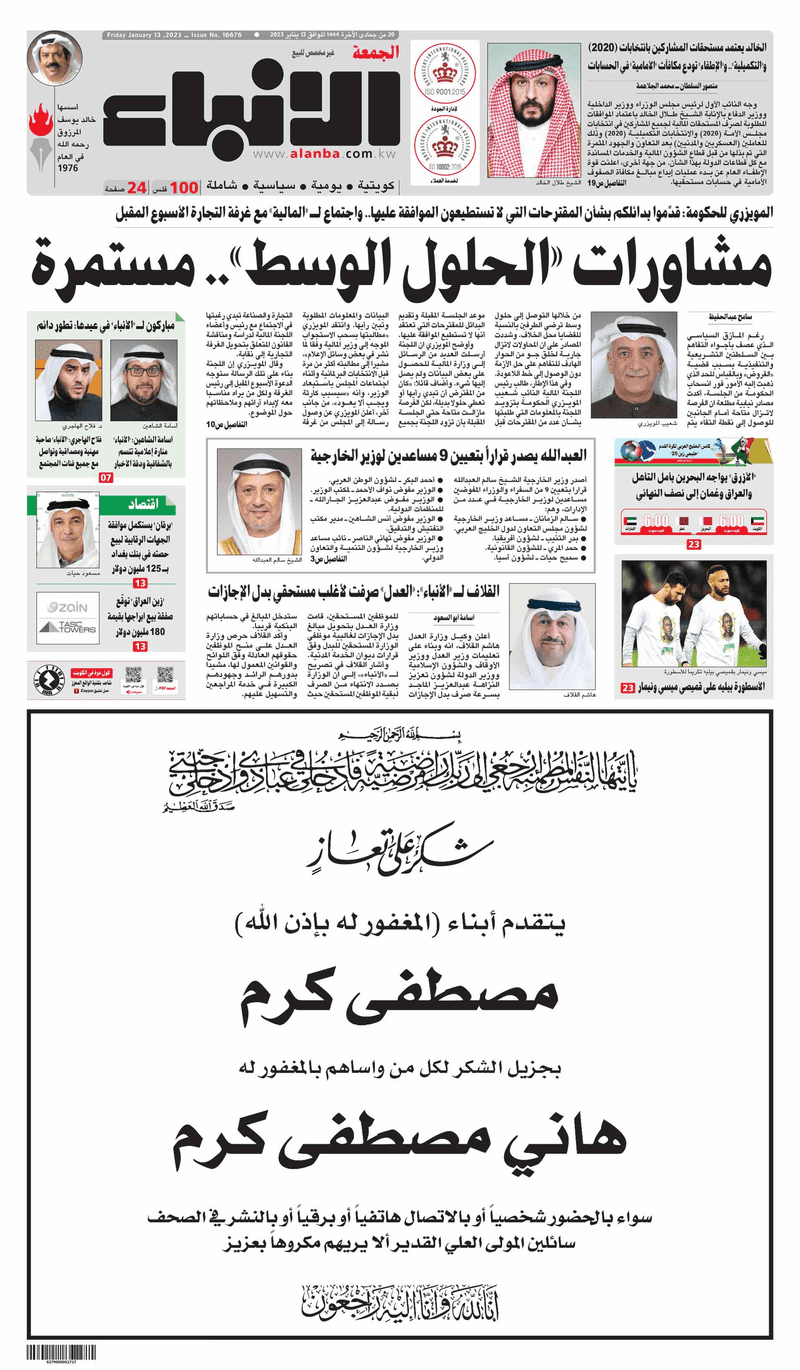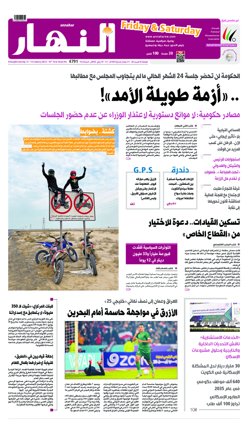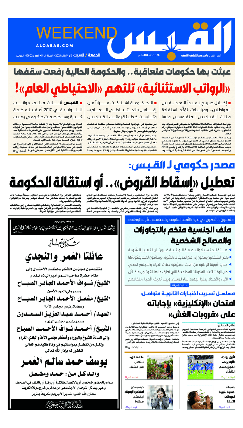 آخر الأخبار جرائم وقضايا “الجمارك” تضبط 29 ألف علبة مشروبات كحولية قادمة من دولة آسيوية في ميناء الشويخ 9 يونيو، 2024 محليات ممثلة عن دولة الكويت الطبيبة الكويتية أسماء الكندري تشارك في المؤتمر العالمي للمناظير في إيطاليا 8 يونيو، 2024 محليات “الصحة”: اكتمال وصول فريق الخدمات الطبية ببعثة الحج الكويتية لمكة المكرمة 8 يونيو، 2024 محليات “الصحة” تحدد 8 مراكز للصحة المدرسية لاستقبال الطلبة المبتعثين 8 يونيو، 2024 عربي وعالمي “الصحة العالمية”: تسجيل أول وفاة لشخص مصاب بـ«أنفلونزا الطيور» 7 يونيو، 2024 محليات عناوين الصحف الكويتية ليوم الجمعة 13 يناير 2023 محرر المحليات13 يناير، 2023أضف تعليق1 دقائق جريدة الأنباء جريدة القبس جريدة السياسة جريدة الوطن جريدة النهار جريدة الصباح الوسومTop عناوين الصحف المحلية من الممكن أن يعجبك جرائم وقضايا “الجمارك” تضبط 29 ألف علبة مشروبات كحولية قادمة من دولة آسيوية في ميناء الشويخ محليات ممثلة عن دولة الكويت الطبيبة الكويتية أسماء الكندري تشارك في المؤتمر العالمي للمناظير في إيطاليا محليات “الصحة”: اكتمال وصول فريق الخدمات الطبية ببعثة الحج الكويتية لمكة المكرمة محليات “الصحة” تحدد 8 مراكز للصحة المدرسية لاستقبال الطلبة المبتعثين عربي وعالمي “الصحة العالمية”: تسجيل أول وفاة لشخص مصاب بـ«أنفلونزا الطيور» تكنولوجيا رش السحب بملح البحر.. تجربة “ثورية” لتبريد كوكب الأرض أضف تعليق أضغط هنا لإضافة تعليق إلغاء الردالتعليقالاسم البريد الإلكتروني الموقع الإلكتروني Δ هذا الموقع يستخدم خدمة أكيسميت للتقليل من البريد المزعجة. اعرف المزيد عن كيفية التعامل مع بيانات التعليقات الخاصة بك processed.