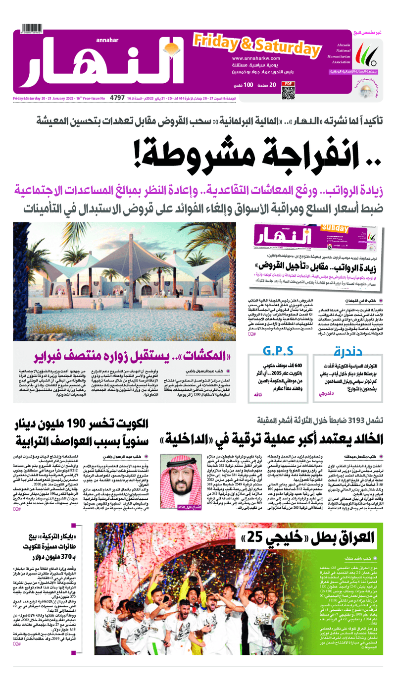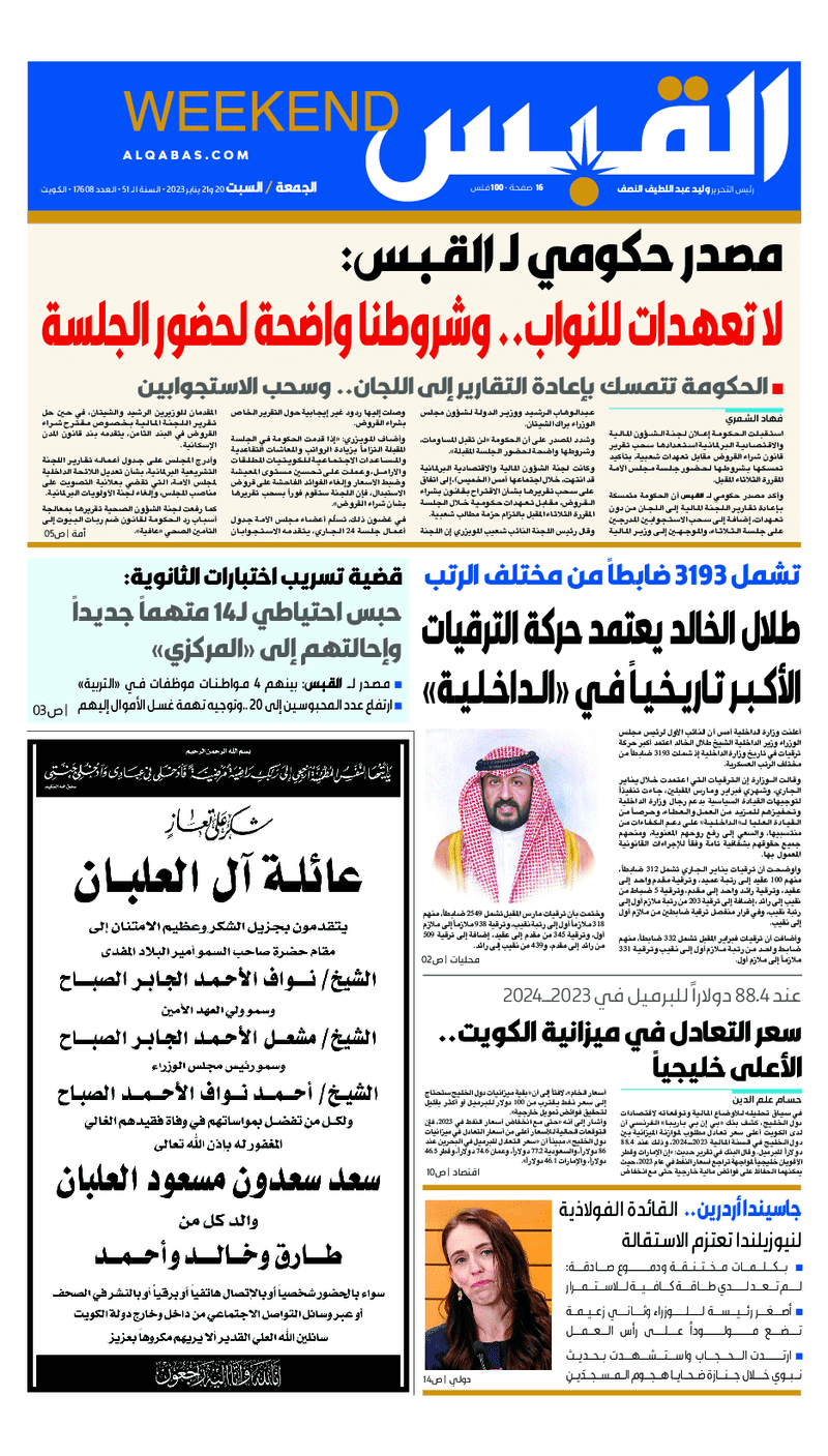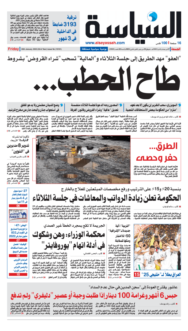 آخر الأخبار جرائم وقضايا “الجمارك” تضبط 29 ألف علبة مشروبات كحولية قادمة من دولة آسيوية في ميناء الشويخ 9 يونيو، 2024 محليات ممثلة عن دولة الكويت الطبيبة الكويتية أسماء الكندري تشارك في المؤتمر العالمي للمناظير في إيطاليا 8 يونيو، 2024 محليات “الصحة”: اكتمال وصول فريق الخدمات الطبية ببعثة الحج الكويتية لمكة المكرمة 8 يونيو، 2024 محليات “الصحة” تحدد 8 مراكز للصحة المدرسية لاستقبال الطلبة المبتعثين 8 يونيو، 2024 عربي وعالمي “الصحة العالمية”: تسجيل أول وفاة لشخص مصاب بـ«أنفلونزا الطيور» 7 يونيو، 2024 محليات عناوين الصحف الكويتية ليوم الجمعة 20 يناير 2023 محرر المحليات20 يناير، 2023أضف تعليق1 دقائق جريدة الأنباء جريدة القبس جريدة السياسة جريدة الوطن جريدة النهار جريدة الصباح الوسومTop عناوين الصحف المحلية من الممكن أن يعجبك جرائم وقضايا “الجمارك” تضبط 29 ألف علبة مشروبات كحولية قادمة من دولة آسيوية في ميناء الشويخ محليات ممثلة عن دولة الكويت الطبيبة الكويتية أسماء الكندري تشارك في المؤتمر العالمي للمناظير في إيطاليا محليات “الصحة”: اكتمال وصول فريق الخدمات الطبية ببعثة الحج الكويتية لمكة المكرمة محليات “الصحة” تحدد 8 مراكز للصحة المدرسية لاستقبال الطلبة المبتعثين عربي وعالمي “الصحة العالمية”: تسجيل أول وفاة لشخص مصاب بـ«أنفلونزا الطيور» تكنولوجيا رش السحب بملح البحر.. تجربة “ثورية” لتبريد كوكب الأرض أضف تعليق أضغط هنا لإضافة تعليق إلغاء الردالتعليقالاسم البريد الإلكتروني الموقع الإلكتروني Δ هذا الموقع يستخدم خدمة أكيسميت للتقليل من البريد المزعجة. اعرف المزيد عن كيفية التعامل مع بيانات التعليقات الخاصة بك processed.