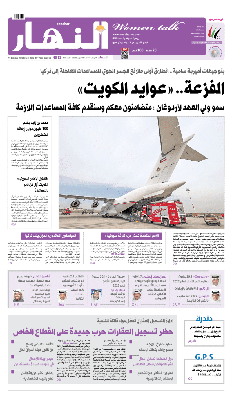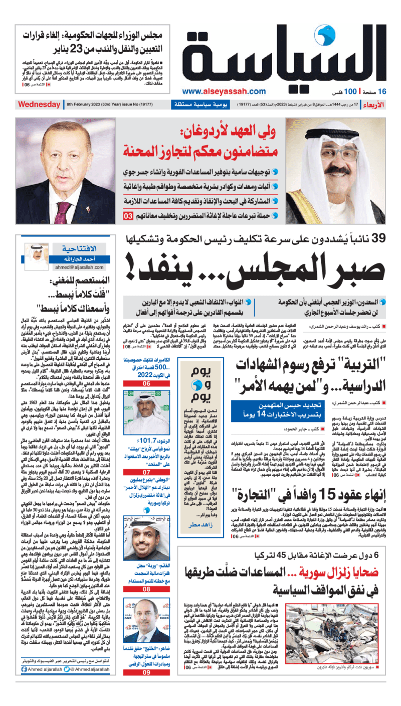 آخر الأخبار جرائم وقضايا “الجمارك” تضبط 29 ألف علبة مشروبات كحولية قادمة من دولة آسيوية في ميناء الشويخ 9 يونيو، 2024 محليات ممثلة عن دولة الكويت الطبيبة الكويتية أسماء الكندري تشارك في المؤتمر العالمي للمناظير في إيطاليا 8 يونيو، 2024 محليات “الصحة”: اكتمال وصول فريق الخدمات الطبية ببعثة الحج الكويتية لمكة المكرمة 8 يونيو، 2024 محليات “الصحة” تحدد 8 مراكز للصحة المدرسية لاستقبال الطلبة المبتعثين 8 يونيو، 2024 عربي وعالمي “الصحة العالمية”: تسجيل أول وفاة لشخص مصاب بـ«أنفلونزا الطيور» 7 يونيو، 2024 محليات عناوين الصحف الكويتية ليوم الأربعاء 08 فبراير 2023 محرر المحليات8 فبراير، 2023أضف تعليق1 دقائق جريدة الأنباء جريدة القبس جريدة السياسة جريدة الوطن جريدة النهار جريدة الصباح الوسومTop عناوين الصحف المحلية من الممكن أن يعجبك جرائم وقضايا “الجمارك” تضبط 29 ألف علبة مشروبات كحولية قادمة من دولة آسيوية في ميناء الشويخ محليات ممثلة عن دولة الكويت الطبيبة الكويتية أسماء الكندري تشارك في المؤتمر العالمي للمناظير في إيطاليا محليات “الصحة”: اكتمال وصول فريق الخدمات الطبية ببعثة الحج الكويتية لمكة المكرمة محليات “الصحة” تحدد 8 مراكز للصحة المدرسية لاستقبال الطلبة المبتعثين عربي وعالمي “الصحة العالمية”: تسجيل أول وفاة لشخص مصاب بـ«أنفلونزا الطيور» تكنولوجيا رش السحب بملح البحر.. تجربة “ثورية” لتبريد كوكب الأرض أضف تعليق أضغط هنا لإضافة تعليق إلغاء الردالتعليقالاسم البريد الإلكتروني الموقع الإلكتروني Δ هذا الموقع يستخدم خدمة أكيسميت للتقليل من البريد المزعجة. اعرف المزيد عن كيفية التعامل مع بيانات التعليقات الخاصة بك processed.