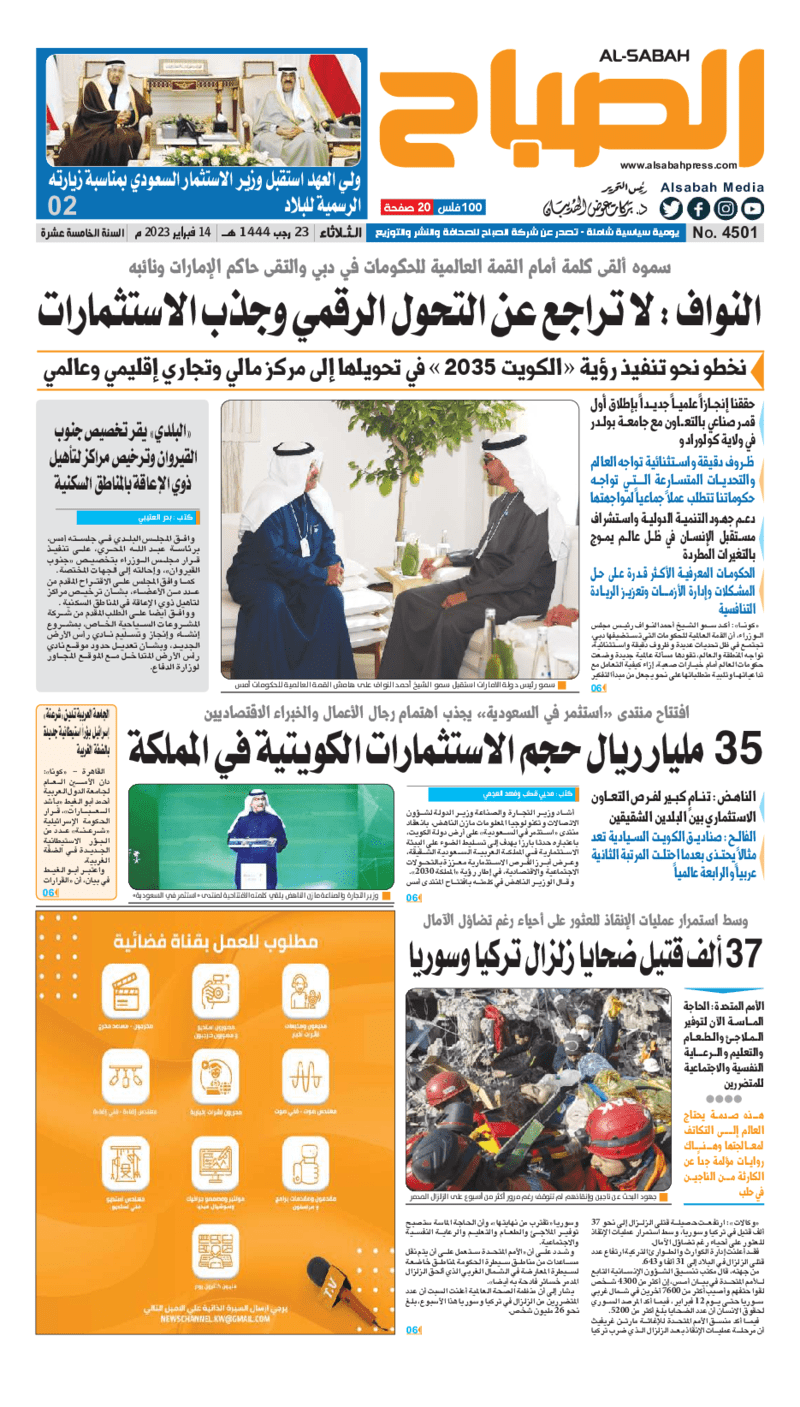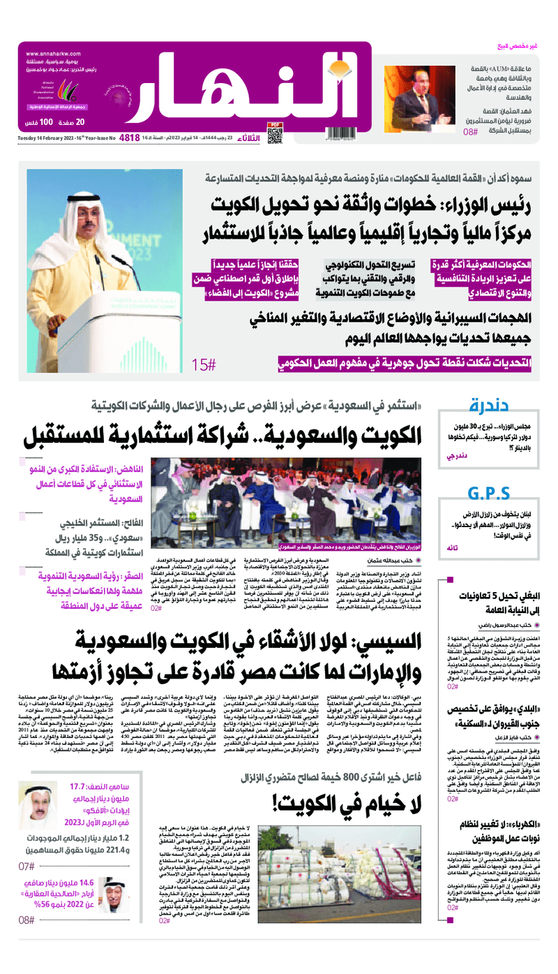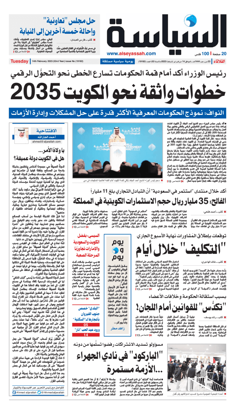 آخر الأخبار جرائم وقضايا “الجمارك” تضبط 29 ألف علبة مشروبات كحولية قادمة من دولة آسيوية في ميناء الشويخ 9 يونيو، 2024 محليات ممثلة عن دولة الكويت الطبيبة الكويتية أسماء الكندري تشارك في المؤتمر العالمي للمناظير في إيطاليا 8 يونيو، 2024 محليات “الصحة”: اكتمال وصول فريق الخدمات الطبية ببعثة الحج الكويتية لمكة المكرمة 8 يونيو، 2024 محليات “الصحة” تحدد 8 مراكز للصحة المدرسية لاستقبال الطلبة المبتعثين 8 يونيو، 2024 عربي وعالمي “الصحة العالمية”: تسجيل أول وفاة لشخص مصاب بـ«أنفلونزا الطيور» 7 يونيو، 2024 محليات عناوين الصحف الكويتية ليوم الثلاثاء 14 فبراير 2023 محرر المحليات14 فبراير، 2023أضف تعليق1 دقائق جريدة الأنباء جريدة القبس جريدة السياسة جريدة الوطن جريدة النهار جريدة الصباح الوسومTop عناوين الصحف المحلية من الممكن أن يعجبك جرائم وقضايا “الجمارك” تضبط 29 ألف علبة مشروبات كحولية قادمة من دولة آسيوية في ميناء الشويخ محليات ممثلة عن دولة الكويت الطبيبة الكويتية أسماء الكندري تشارك في المؤتمر العالمي للمناظير في إيطاليا محليات “الصحة”: اكتمال وصول فريق الخدمات الطبية ببعثة الحج الكويتية لمكة المكرمة محليات “الصحة” تحدد 8 مراكز للصحة المدرسية لاستقبال الطلبة المبتعثين عربي وعالمي “الصحة العالمية”: تسجيل أول وفاة لشخص مصاب بـ«أنفلونزا الطيور» تكنولوجيا رش السحب بملح البحر.. تجربة “ثورية” لتبريد كوكب الأرض أضف تعليق أضغط هنا لإضافة تعليق إلغاء الردالتعليقالاسم البريد الإلكتروني الموقع الإلكتروني Δ هذا الموقع يستخدم خدمة أكيسميت للتقليل من البريد المزعجة. اعرف المزيد عن كيفية التعامل مع بيانات التعليقات الخاصة بك processed.