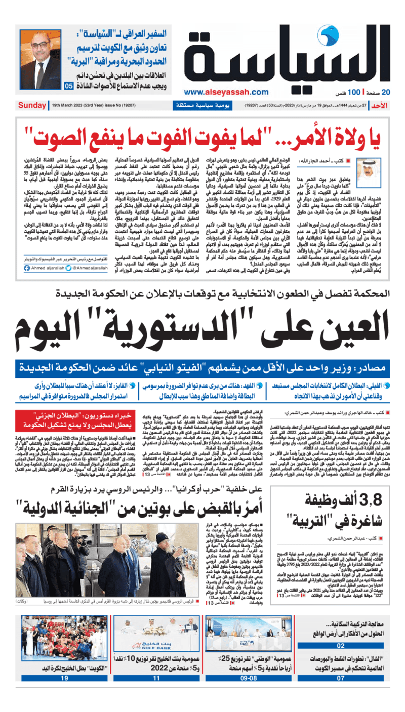 آخر الأخبار جرائم وقضايا “الجمارك” تضبط 29 ألف علبة مشروبات كحولية قادمة من دولة آسيوية في ميناء الشويخ 9 يونيو، 2024 محليات ممثلة عن دولة الكويت الطبيبة الكويتية أسماء الكندري تشارك في المؤتمر العالمي للمناظير في إيطاليا 8 يونيو، 2024 محليات “الصحة”: اكتمال وصول فريق الخدمات الطبية ببعثة الحج الكويتية لمكة المكرمة 8 يونيو، 2024 محليات “الصحة” تحدد 8 مراكز للصحة المدرسية لاستقبال الطلبة المبتعثين 8 يونيو، 2024 عربي وعالمي “الصحة العالمية”: تسجيل أول وفاة لشخص مصاب بـ«أنفلونزا الطيور» 7 يونيو، 2024 محليات عناوين الصحف الكويتية ليوم الأحد 19 مارس 2023 محرر المحليات19 مارس، 2023أضف تعليق1 دقائق جريدة الأنباء جريدة القبس جريدة السياسة جريدة الوطن جريدة الصباح الوسومTop عناوين الصحف المحلية من الممكن أن يعجبك جرائم وقضايا “الجمارك” تضبط 29 ألف علبة مشروبات كحولية قادمة من دولة آسيوية في ميناء الشويخ محليات ممثلة عن دولة الكويت الطبيبة الكويتية أسماء الكندري تشارك في المؤتمر العالمي للمناظير في إيطاليا محليات “الصحة”: اكتمال وصول فريق الخدمات الطبية ببعثة الحج الكويتية لمكة المكرمة محليات “الصحة” تحدد 8 مراكز للصحة المدرسية لاستقبال الطلبة المبتعثين عربي وعالمي “الصحة العالمية”: تسجيل أول وفاة لشخص مصاب بـ«أنفلونزا الطيور» تكنولوجيا رش السحب بملح البحر.. تجربة “ثورية” لتبريد كوكب الأرض أضف تعليق أضغط هنا لإضافة تعليق إلغاء الردالتعليقالاسم البريد الإلكتروني الموقع الإلكتروني Δ هذا الموقع يستخدم خدمة أكيسميت للتقليل من البريد المزعجة. اعرف المزيد عن كيفية التعامل مع بيانات التعليقات الخاصة بك processed.