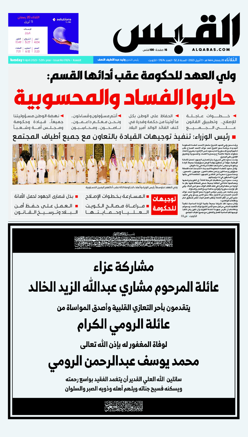 آخر الأخبار جرائم وقضايا “الجمارك” تضبط 29 ألف علبة مشروبات كحولية قادمة من دولة آسيوية في ميناء الشويخ 9 يونيو، 2024 محليات ممثلة عن دولة الكويت الطبيبة الكويتية أسماء الكندري تشارك في المؤتمر العالمي للمناظير في إيطاليا 8 يونيو، 2024 محليات “الصحة”: اكتمال وصول فريق الخدمات الطبية ببعثة الحج الكويتية لمكة المكرمة 8 يونيو، 2024 محليات “الصحة” تحدد 8 مراكز للصحة المدرسية لاستقبال الطلبة المبتعثين 8 يونيو، 2024 عربي وعالمي “الصحة العالمية”: تسجيل أول وفاة لشخص مصاب بـ«أنفلونزا الطيور» 7 يونيو، 2024 محليات عناوين الصحف الكويتية ليوم الثلاثاء 11 أبريل 2023 محرر المحليات11 أبريل، 2023أضف تعليق1 دقائق جريدة الأنباء جريدة القبس جريدة السياسة جريدة الوطن جريدة الصباح الوسومTop عناوين الصحف المحلية من الممكن أن يعجبك جرائم وقضايا “الجمارك” تضبط 29 ألف علبة مشروبات كحولية قادمة من دولة آسيوية في ميناء الشويخ محليات ممثلة عن دولة الكويت الطبيبة الكويتية أسماء الكندري تشارك في المؤتمر العالمي للمناظير في إيطاليا محليات “الصحة”: اكتمال وصول فريق الخدمات الطبية ببعثة الحج الكويتية لمكة المكرمة محليات “الصحة” تحدد 8 مراكز للصحة المدرسية لاستقبال الطلبة المبتعثين عربي وعالمي “الصحة العالمية”: تسجيل أول وفاة لشخص مصاب بـ«أنفلونزا الطيور» تكنولوجيا رش السحب بملح البحر.. تجربة “ثورية” لتبريد كوكب الأرض أضف تعليق أضغط هنا لإضافة تعليق إلغاء الردالتعليقالاسم البريد الإلكتروني الموقع الإلكتروني Δ هذا الموقع يستخدم خدمة أكيسميت للتقليل من البريد المزعجة. اعرف المزيد عن كيفية التعامل مع بيانات التعليقات الخاصة بك processed.