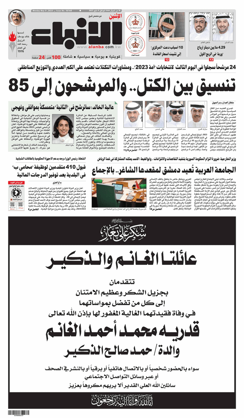 آخر الأخبار جرائم وقضايا “الجمارك” تضبط 29 ألف علبة مشروبات كحولية قادمة من دولة آسيوية في ميناء الشويخ 9 يونيو، 2024 محليات ممثلة عن دولة الكويت الطبيبة الكويتية أسماء الكندري تشارك في المؤتمر العالمي للمناظير في إيطاليا 8 يونيو، 2024 محليات “الصحة”: اكتمال وصول فريق الخدمات الطبية ببعثة الحج الكويتية لمكة المكرمة 8 يونيو، 2024 محليات “الصحة” تحدد 8 مراكز للصحة المدرسية لاستقبال الطلبة المبتعثين 8 يونيو، 2024 عربي وعالمي “الصحة العالمية”: تسجيل أول وفاة لشخص مصاب بـ«أنفلونزا الطيور» 7 يونيو، 2024 محليات عناوين الصحف الكويتية ليوم الاثنين 08 مايو 2023 محرر المحليات8 مايو، 2023أضف تعليق1 دقائق جريدة الأنباء جريدة القبس جريدة السياسة جريدة الوطن جريدة الصباح الوسومTop عناوين الصحف المحلية من الممكن أن يعجبك جرائم وقضايا “الجمارك” تضبط 29 ألف علبة مشروبات كحولية قادمة من دولة آسيوية في ميناء الشويخ محليات ممثلة عن دولة الكويت الطبيبة الكويتية أسماء الكندري تشارك في المؤتمر العالمي للمناظير في إيطاليا محليات “الصحة”: اكتمال وصول فريق الخدمات الطبية ببعثة الحج الكويتية لمكة المكرمة محليات “الصحة” تحدد 8 مراكز للصحة المدرسية لاستقبال الطلبة المبتعثين عربي وعالمي “الصحة العالمية”: تسجيل أول وفاة لشخص مصاب بـ«أنفلونزا الطيور» تكنولوجيا رش السحب بملح البحر.. تجربة “ثورية” لتبريد كوكب الأرض أضف تعليق أضغط هنا لإضافة تعليق إلغاء الردالتعليقالاسم البريد الإلكتروني الموقع الإلكتروني Δ هذا الموقع يستخدم خدمة أكيسميت للتقليل من البريد المزعجة. اعرف المزيد عن كيفية التعامل مع بيانات التعليقات الخاصة بك processed.