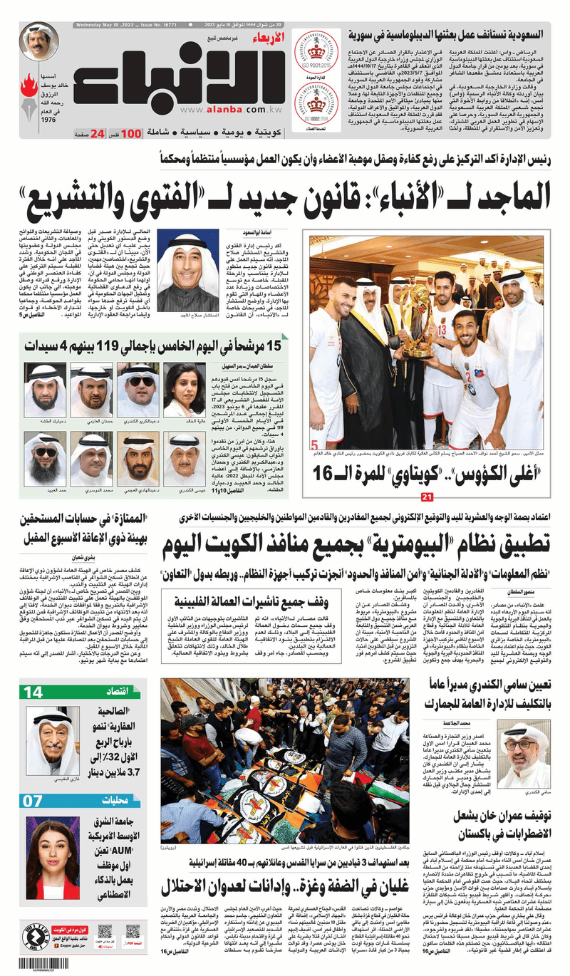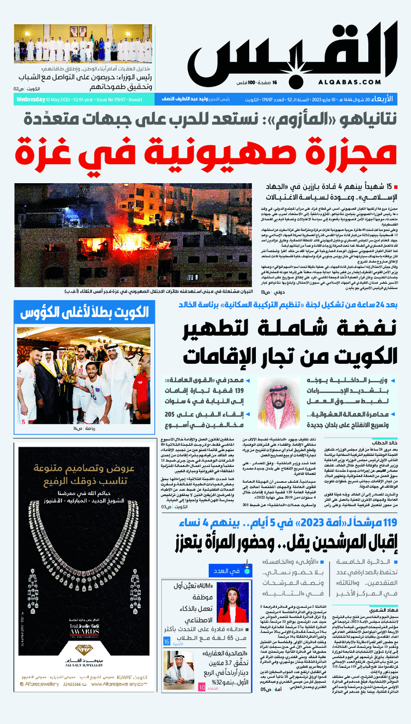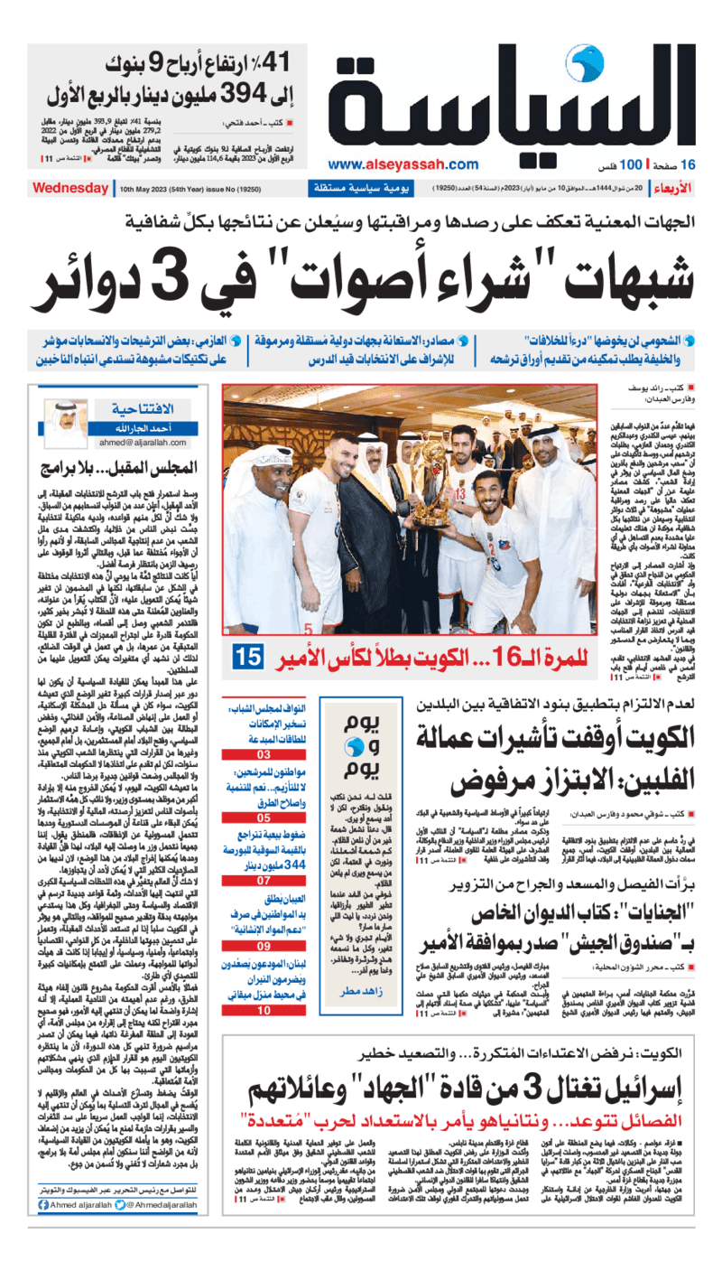 آخر الأخبار جرائم وقضايا “الجمارك” تضبط 29 ألف علبة مشروبات كحولية قادمة من دولة آسيوية في ميناء الشويخ 9 يونيو، 2024 محليات ممثلة عن دولة الكويت الطبيبة الكويتية أسماء الكندري تشارك في المؤتمر العالمي للمناظير في إيطاليا 8 يونيو، 2024 محليات “الصحة”: اكتمال وصول فريق الخدمات الطبية ببعثة الحج الكويتية لمكة المكرمة 8 يونيو، 2024 محليات “الصحة” تحدد 8 مراكز للصحة المدرسية لاستقبال الطلبة المبتعثين 8 يونيو، 2024 عربي وعالمي “الصحة العالمية”: تسجيل أول وفاة لشخص مصاب بـ«أنفلونزا الطيور» 7 يونيو، 2024 محليات عناوين الصحف الكويتية ليوم الأربعاء 10 مايو 2023 محرر المحليات10 مايو، 2023أضف تعليق1 دقائق جريدة الأنباء جريدة القبس جريدة السياسة جريدة الوطن جريدة الصباح الوسومTop عناوين الصحف المحلية من الممكن أن يعجبك جرائم وقضايا “الجمارك” تضبط 29 ألف علبة مشروبات كحولية قادمة من دولة آسيوية في ميناء الشويخ محليات ممثلة عن دولة الكويت الطبيبة الكويتية أسماء الكندري تشارك في المؤتمر العالمي للمناظير في إيطاليا محليات “الصحة”: اكتمال وصول فريق الخدمات الطبية ببعثة الحج الكويتية لمكة المكرمة محليات “الصحة” تحدد 8 مراكز للصحة المدرسية لاستقبال الطلبة المبتعثين عربي وعالمي “الصحة العالمية”: تسجيل أول وفاة لشخص مصاب بـ«أنفلونزا الطيور» تكنولوجيا رش السحب بملح البحر.. تجربة “ثورية” لتبريد كوكب الأرض أضف تعليق أضغط هنا لإضافة تعليق إلغاء الردالتعليقالاسم البريد الإلكتروني الموقع الإلكتروني Δ هذا الموقع يستخدم خدمة أكيسميت للتقليل من البريد المزعجة. اعرف المزيد عن كيفية التعامل مع بيانات التعليقات الخاصة بك processed.